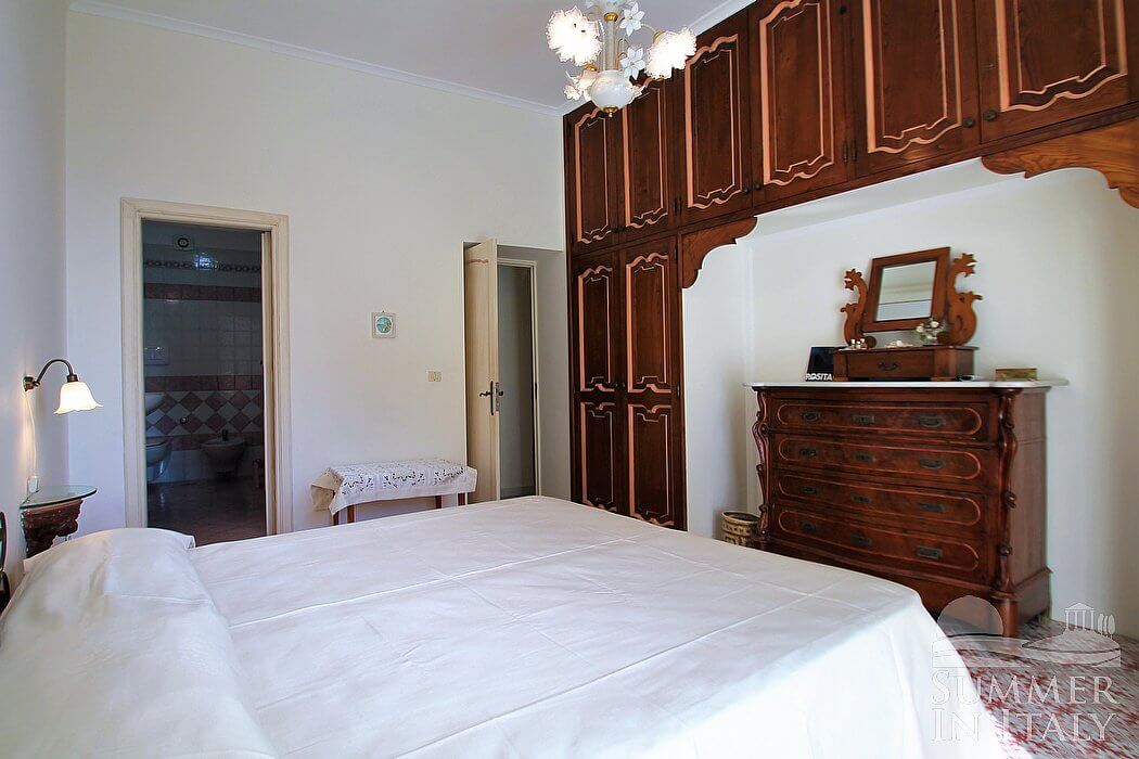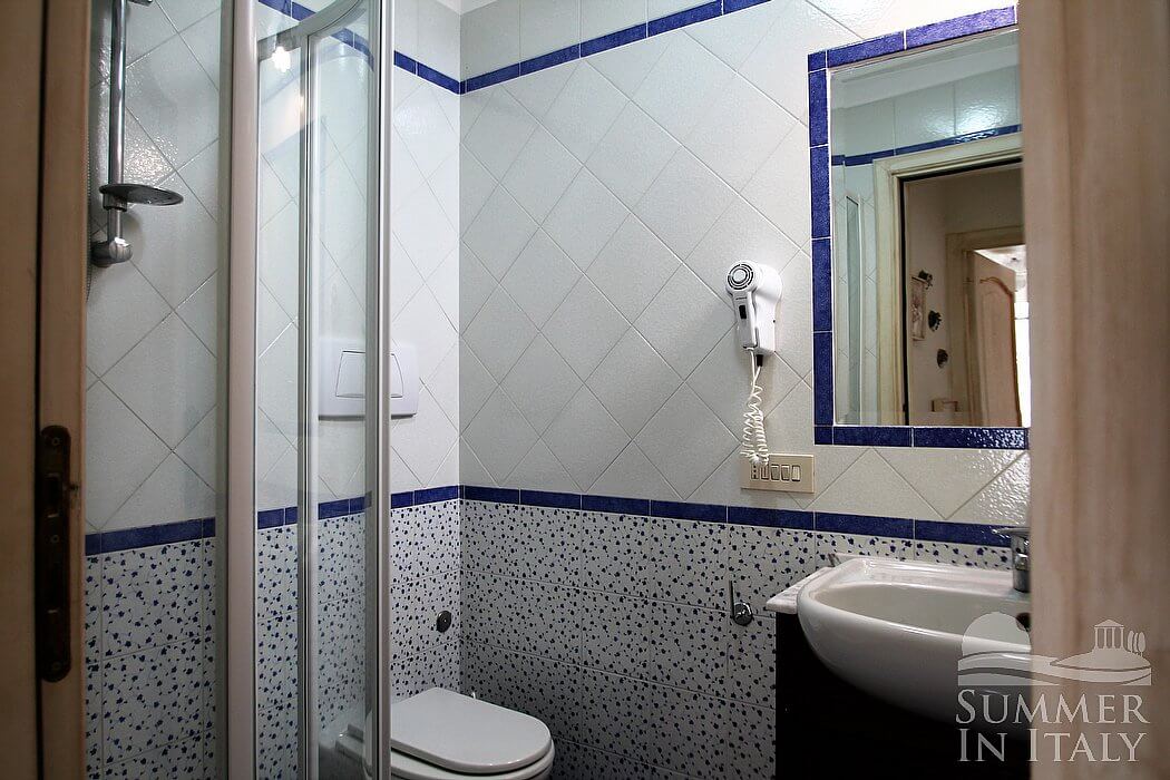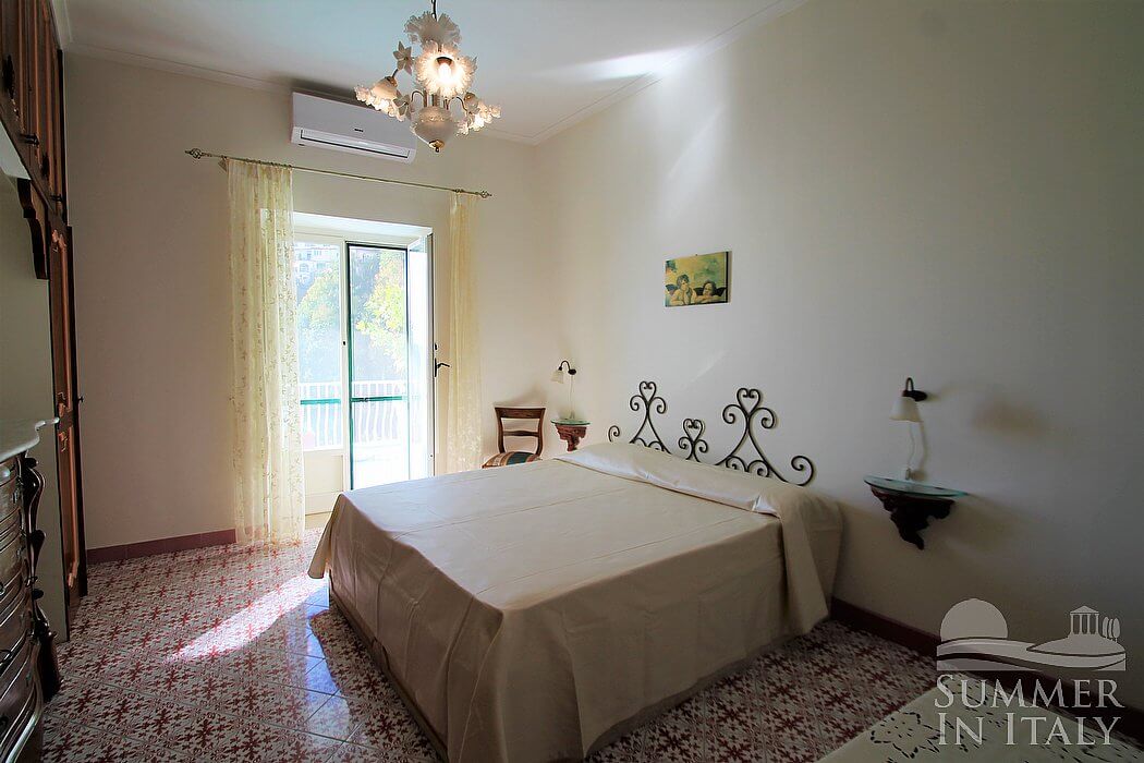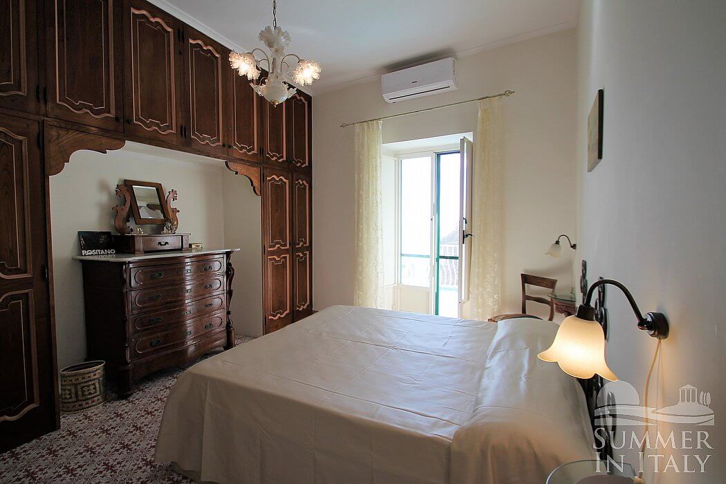 The furnishings of the bedroom are elegant and bright. The room has a matrimonial bed (160 cm/62 inches, wider than a queen-size bed). From the bedroom you will be able to enter the terrace with a view of the sea and of the coastline through a double-glazed French door. The bedroom is equipped with an air conditioning/heating unit. This bedroom has an en-suite bathroom, made of lucid majolica tiles and marble and equipped with a washbasin, a toilet, a shower and a hairdryer.