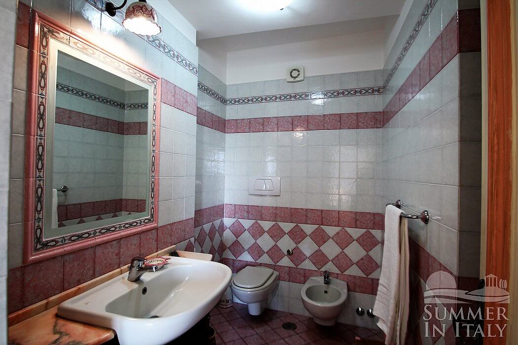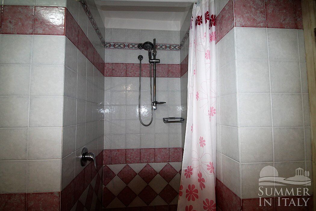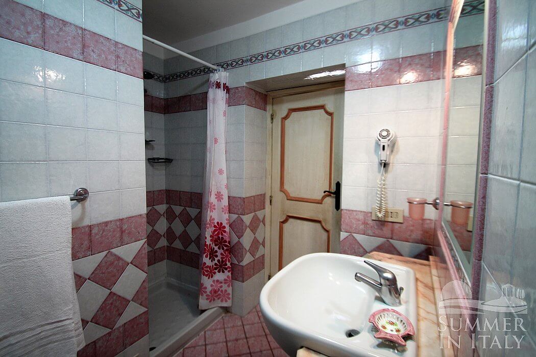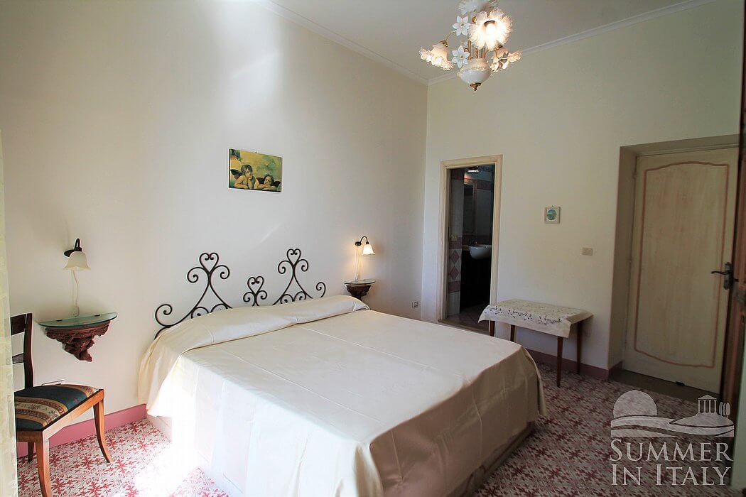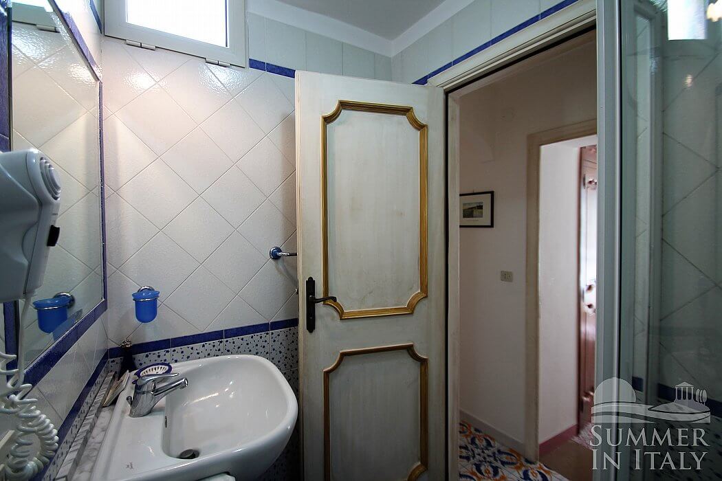 The furnishings of the bedroom are elegant and bright. The room has a matrimonial bed (160 cm/62 inches, wider than a queen-size bed). From the bedroom you will be able to enter the terrace with a view of the sea and of the coastline through a double-glazed French door. The bedroom is equipped with an air conditioning/heating unit. This bedroom has an en-suite bathroom, made of lucid majolica tiles and marble and equipped with a washbasin, a toilet, a shower and a hairdryer.