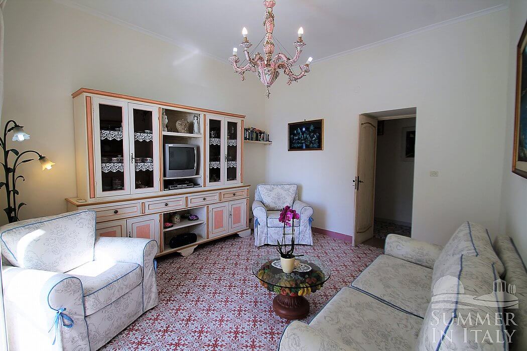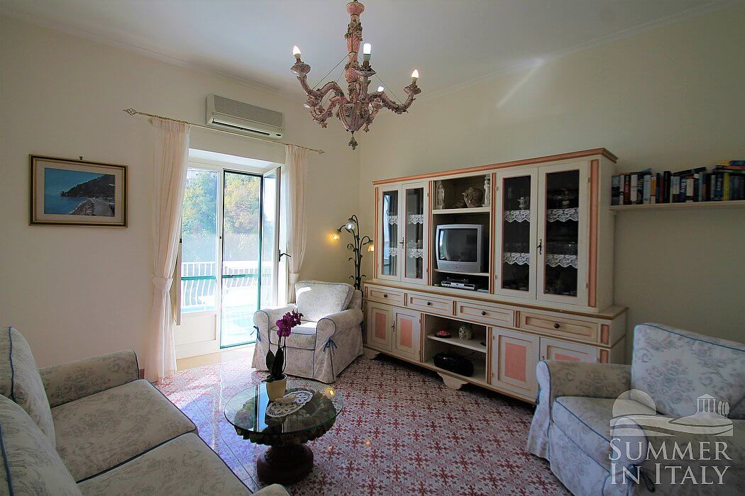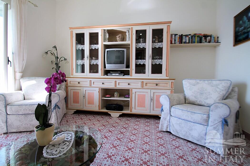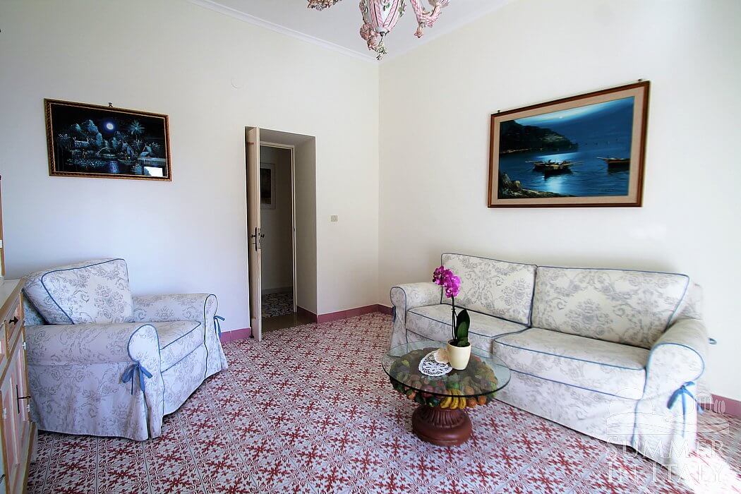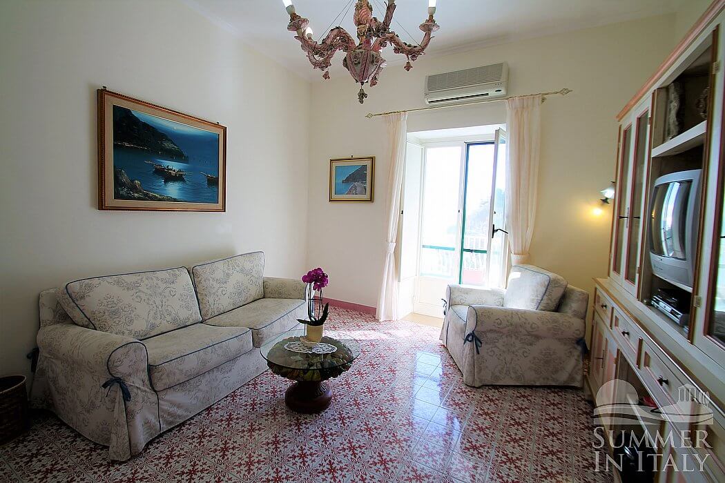 The living room is paved with handmade majolica tiles, in the characteristic style of the Amalfi Coast. The furnishings are bright and cheerful. The furnishings include a sofa and two armchairs. In this room you will find a satellite television (local channels), a DVD player and a CD player. From the living room you will be able to enter the terrace with a view of the sea and of the coastline through a double-glazed French door. The room is equipped with an air conditioning/heating unit.