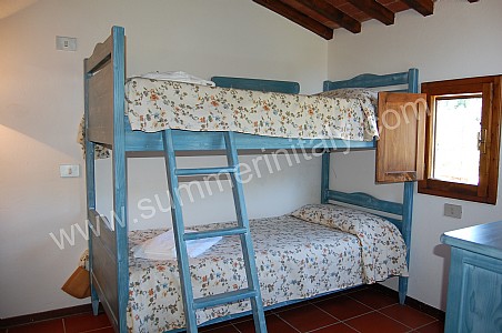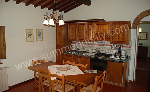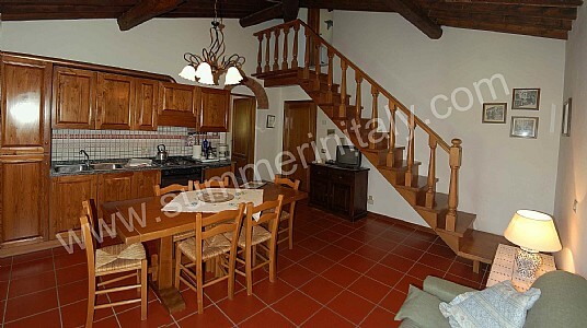 The furnishings of the living room are rural and characteristic of the Tuscan house. The furnishings include a sofa. In the living room you will also find a cooking area. The kitchenette is equipped with a four-burner gas cooker, an electric oven, a refrigerator with freezer, an Italian-style coffee-maker and other small appliances. The dining table can accommodate six guests. In this room you will find a satellite television (local channels). The room has a window with a view of the garden.
