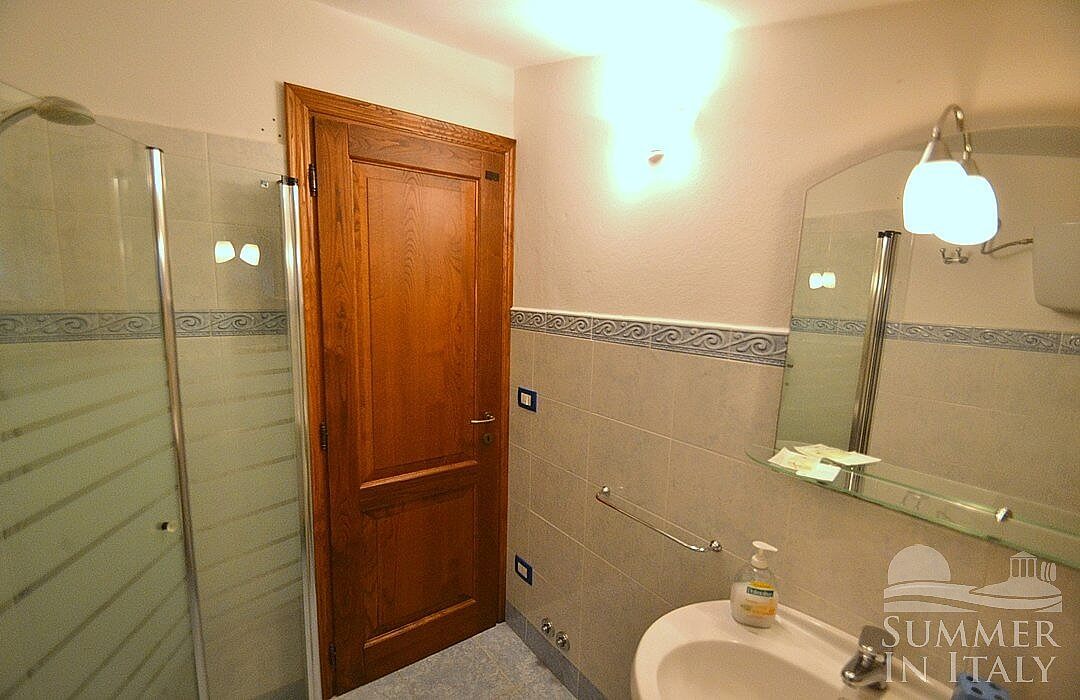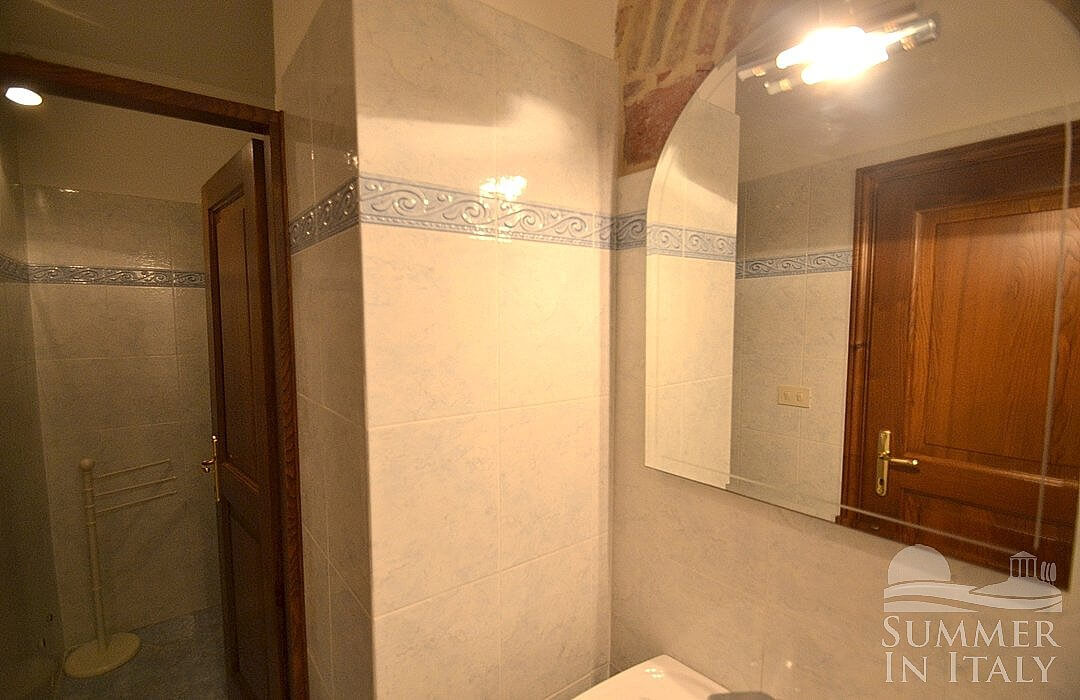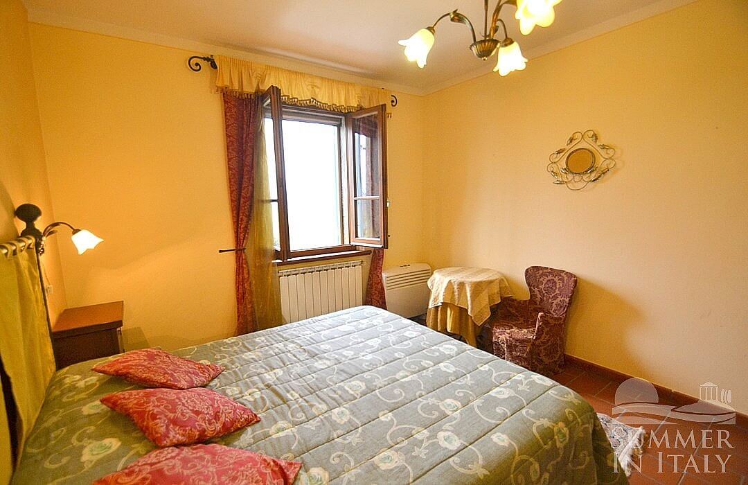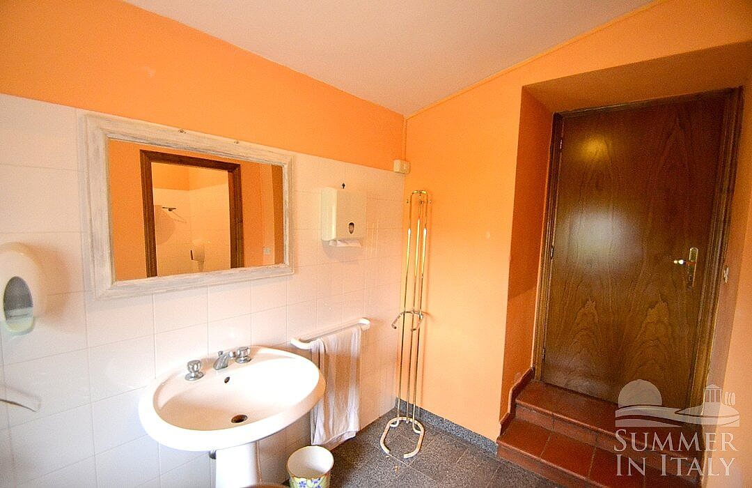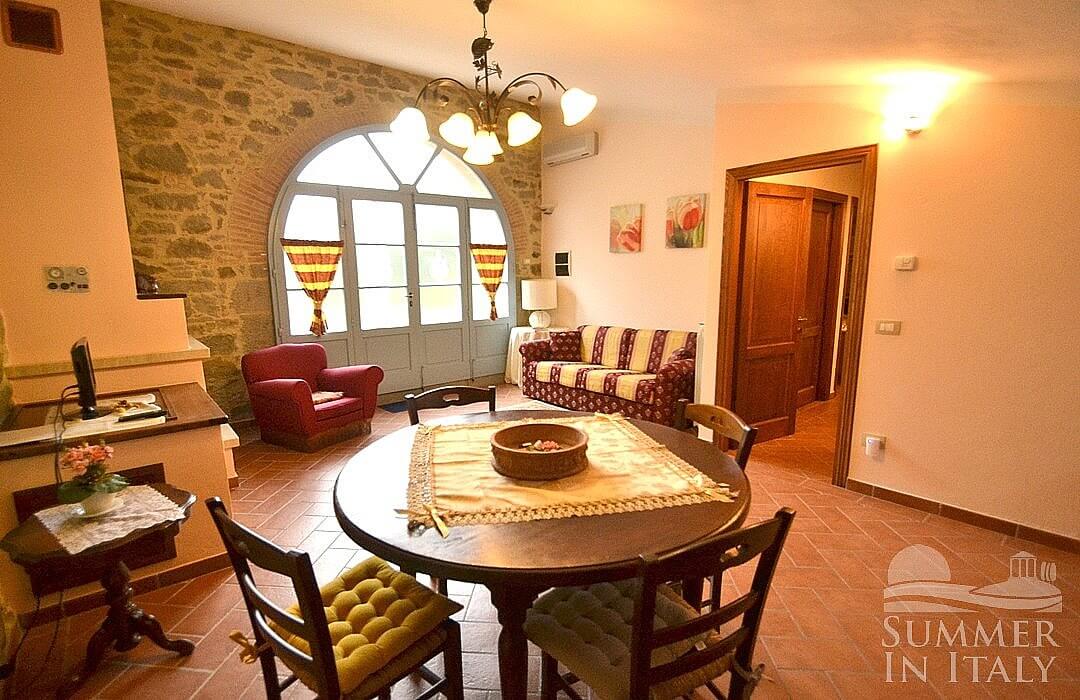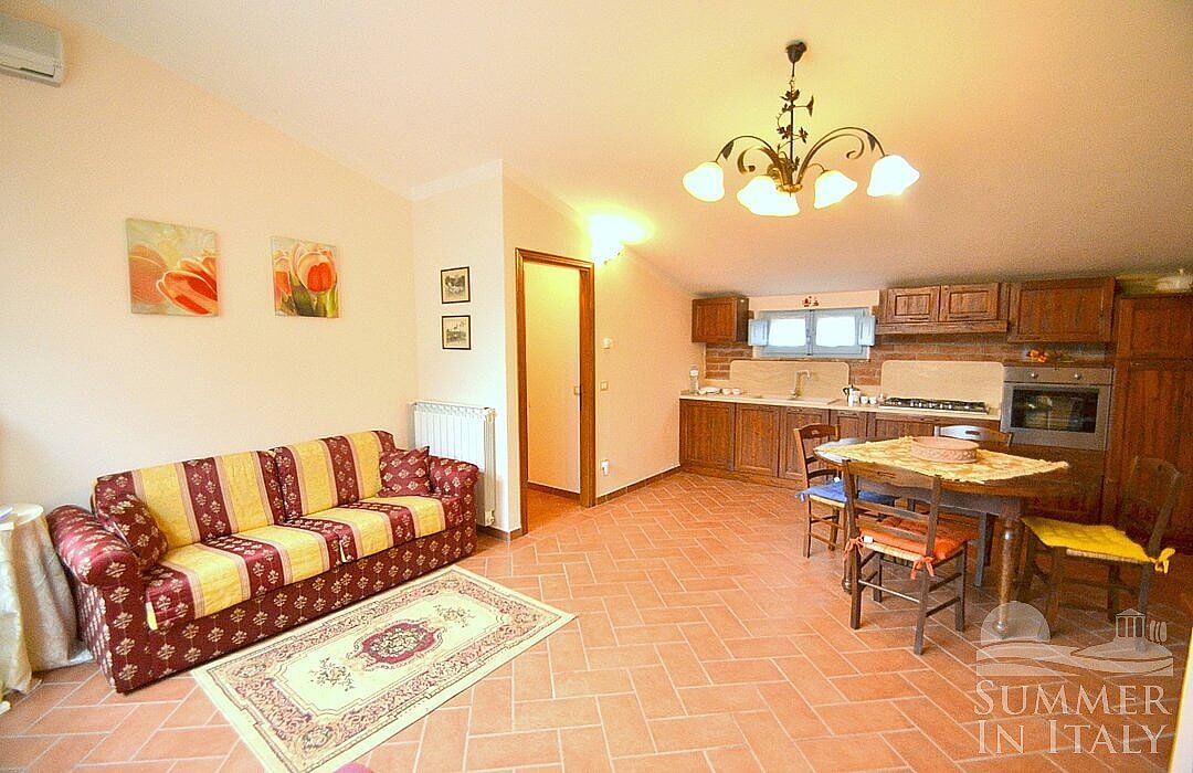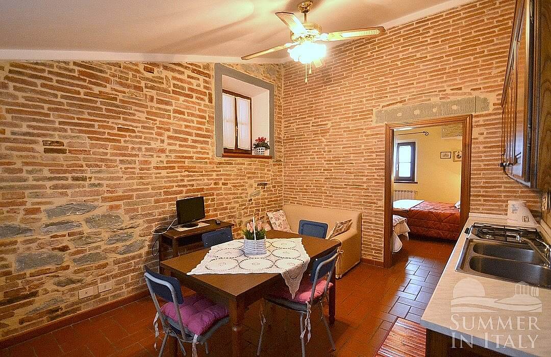 The eighth living room is paved with terracotta tiles. The furnishings include a sofa. There is a practical fireplace. In the living room you will also find a cooking area. The kitchenette is equipped with a four-burner gas cooker, an electric oven, a refrigerator with freezer, a microwave oven, an Italian-style coffee-maker, a toaster and other small appliances. The dining table can accommodate four guests. In this room you will find a television (local channels). From the living room you will be able to enter the patio through a French door. The room is equipped with an air conditioning/heating unit.