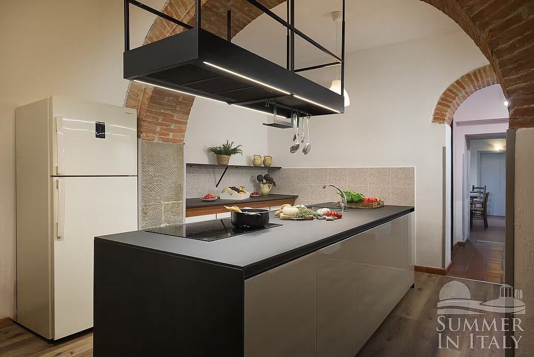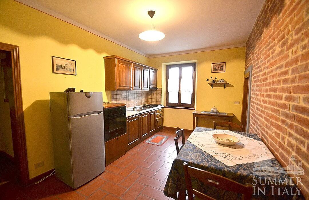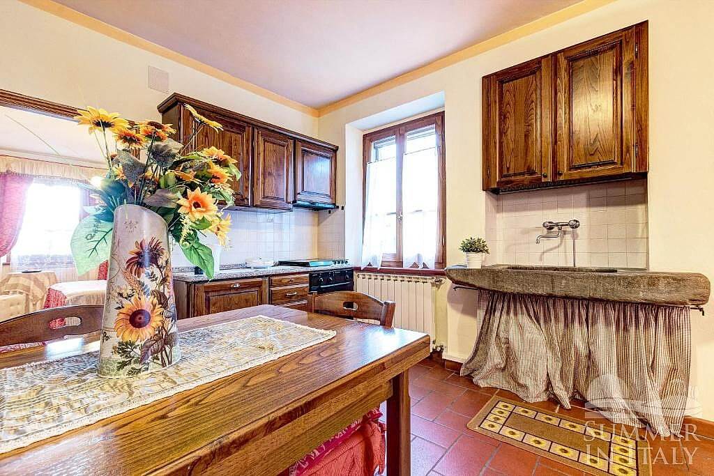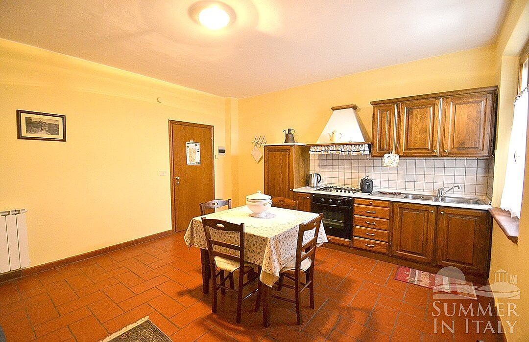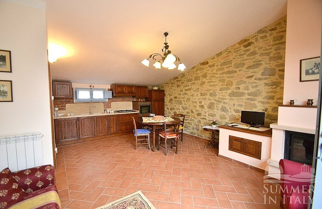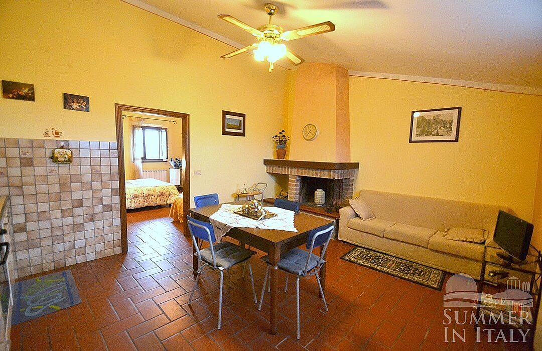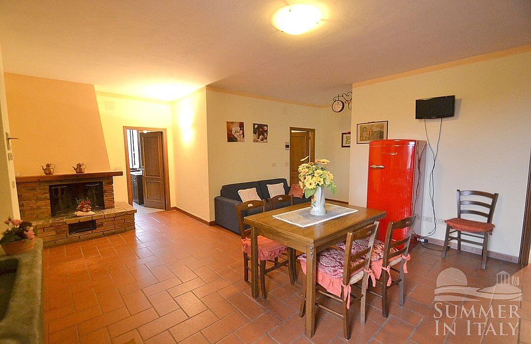 The fourth living room is paved with terracotta tiles. The furnishings are simple and comfortable, and include a sofa. There is a practical fireplace. In the living room you will also find a cooking area. The kitchenette is equipped with a four-burner gas cooker, an electric oven, a refrigerator with freezer, a microwave oven, an Italian-style coffee-maker, a toaster and other small appliances. The dining table can accommodate six guests. The room has a window with a view of the swimming pool and of the hills.