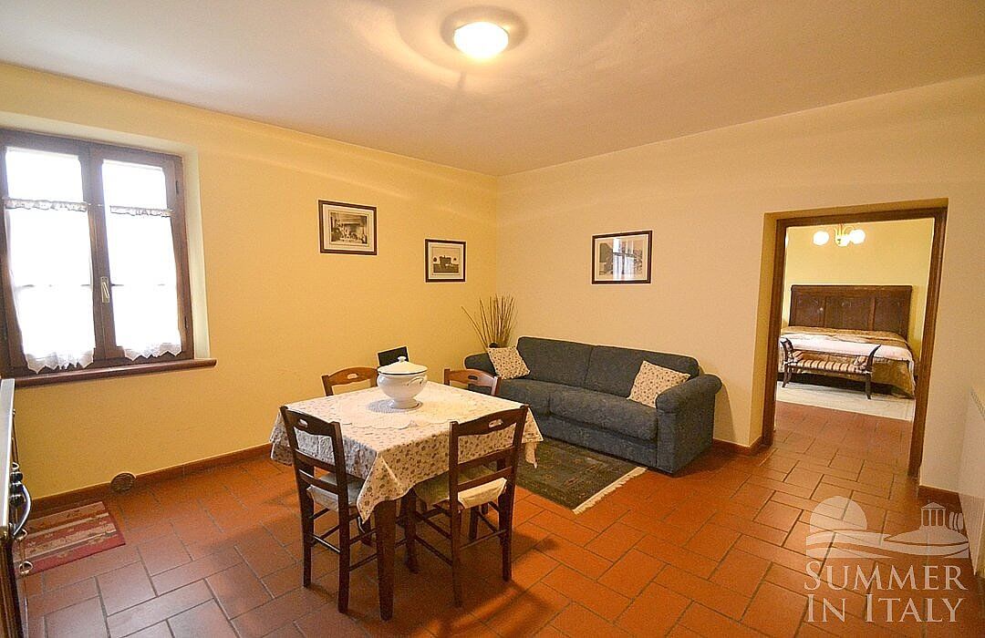 The seventh living room is paved with terracotta tiles. The furnishings are simple and comfortable, and include a sofa. There is a practical fireplace. In the living room you will also find a cooking area. The kitchenette is equipped with a four-burner gas cooker, an electric oven, a refrigerator with freezer, a microwave oven, an Italian-style coffee-maker, a toaster and other small appliances. The dining table can accommodate six guests. In this room you will find a television (local channels). The room has a small window.