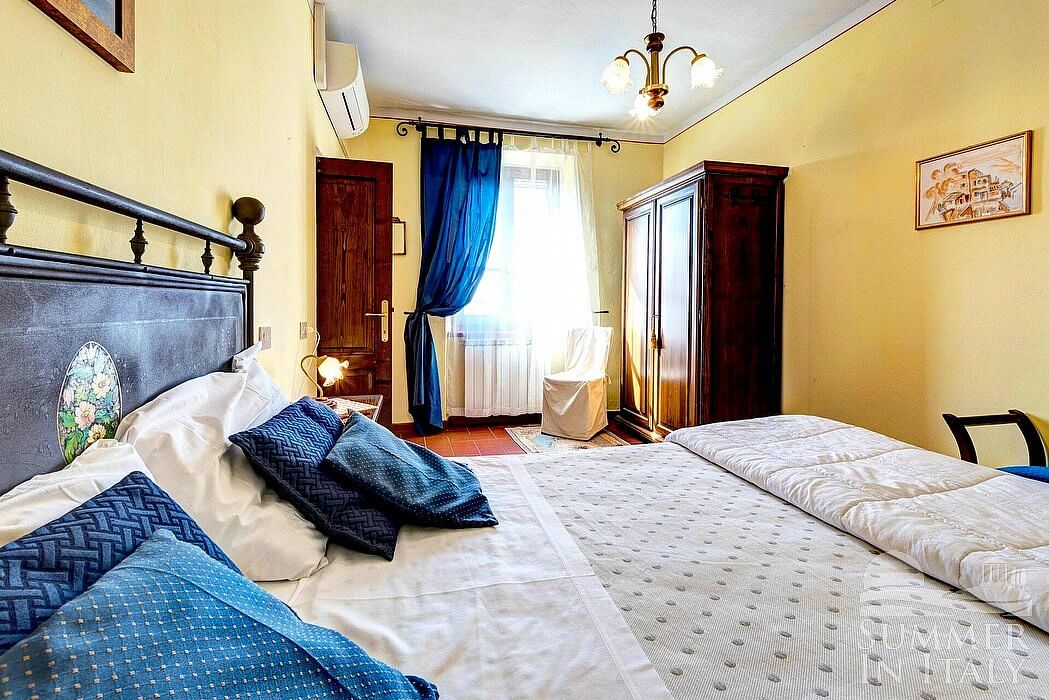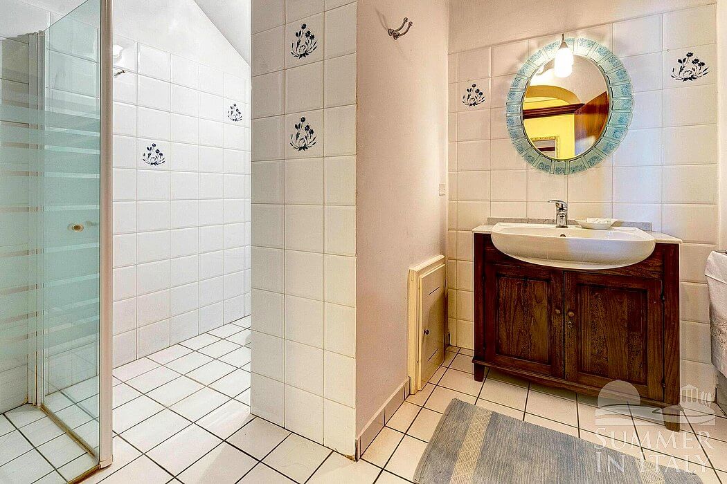 You will be able to enter the seventh bedroom from the living room. The bedroom has a matrimonial bed (160 cm/63 inches, wider than a queen-size bed). The room has a window with a view of the swimming pool and of the hills, and it's equipped with an air conditioning/heating unit. This bedroom has an en-suite bathroom, equipped with a washbasin, a toilet and a fully enclosed shower.