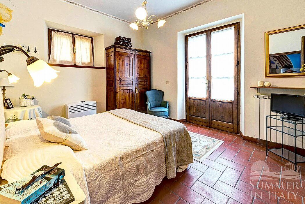 You will be able to enter the fifth bedroom from the living room. The bedroom has a matrimonial bed (160 cm/63 inches, wider than a queen-size bed). The room has a window with a view of the swimming pool and of the hills, and it's equipped with an air conditioning/heating unit. This bedroom has an en-suite bathroom, equipped with a washbasin, a toilet and a fully enclosed shower.