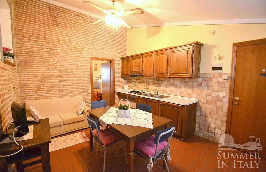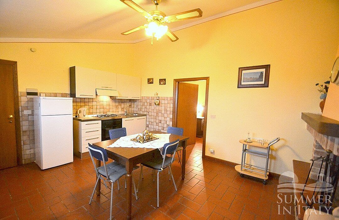 The sixth living room is paved with terracotta tiles. The furnishings are simple and comfortable, and include a sofa. There is a practical fireplace. In the living room you will also find a cooking area. The kitchenette is equipped with a four-burner gas cooker, an electric oven, a refrigerator with freezer, a microwave oven, an Italian-style coffee-maker, a toaster and other small appliances. The dining table can accommodate six guests. In this room you will find a television (local channels). The room has a small window.