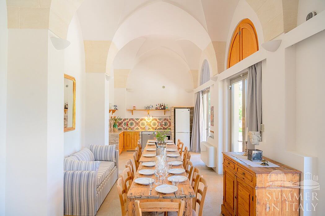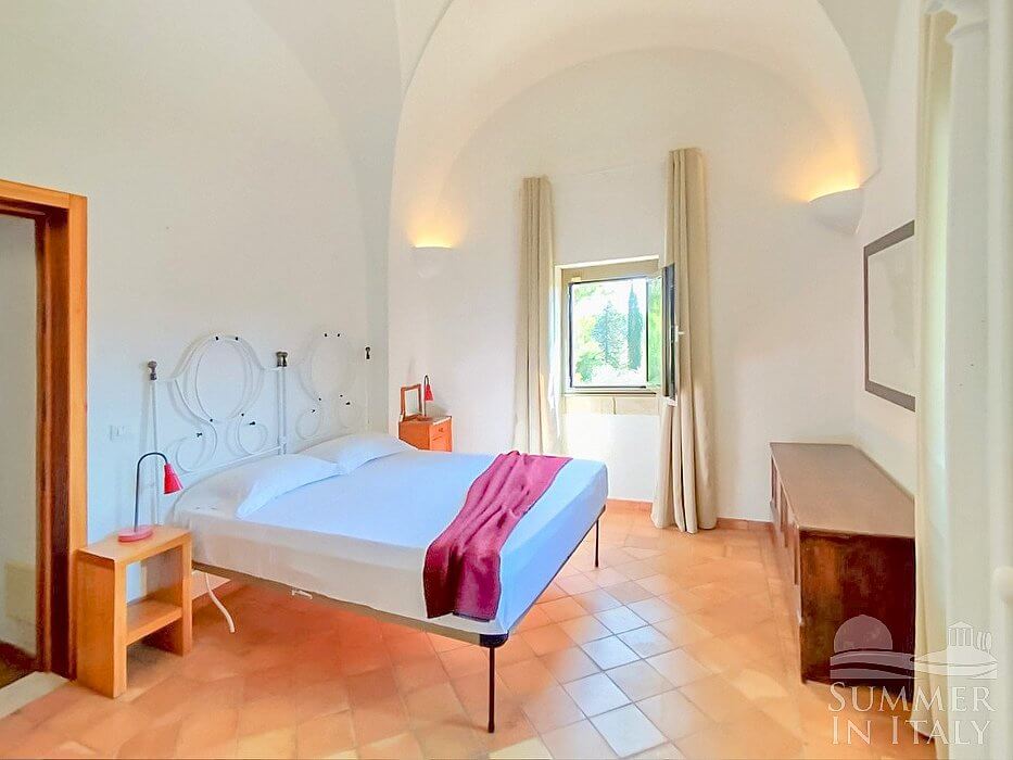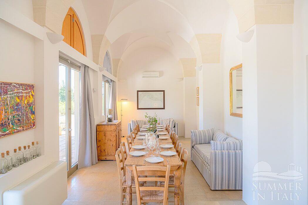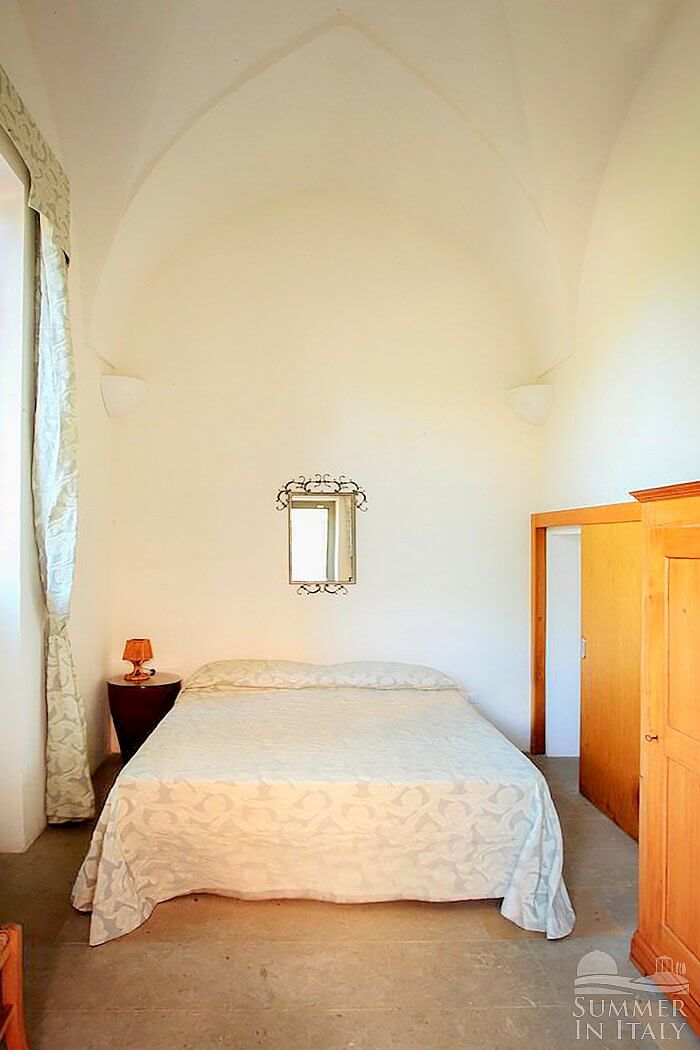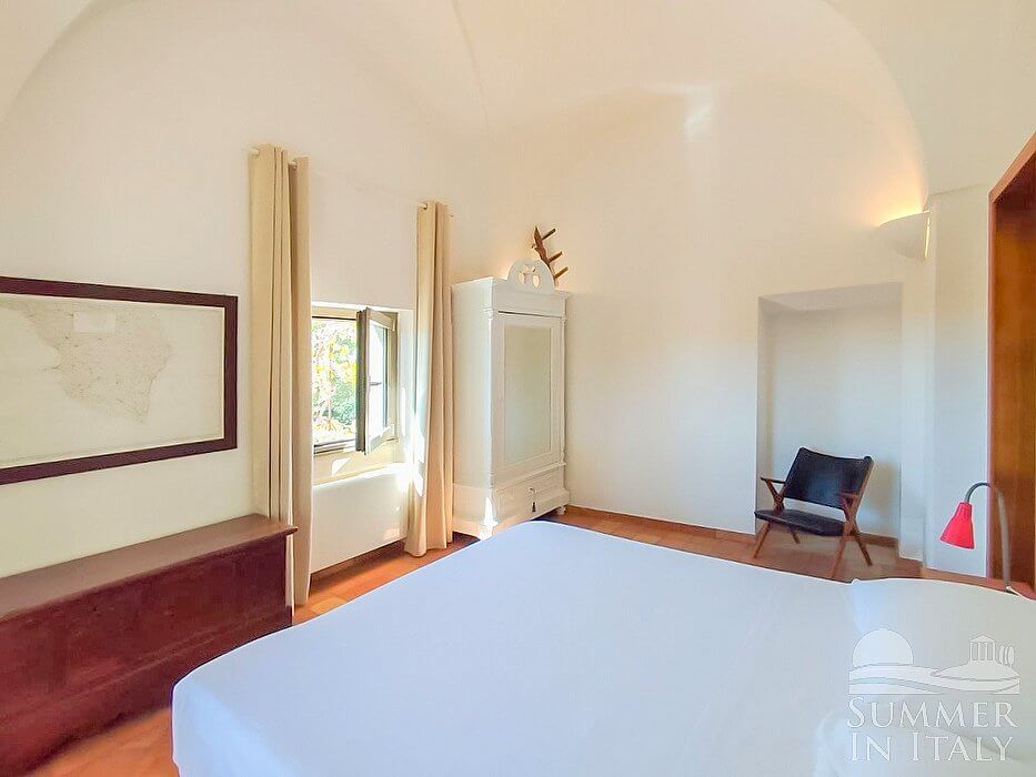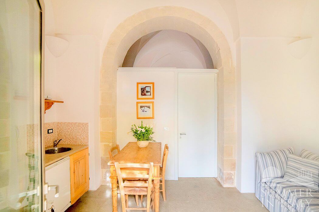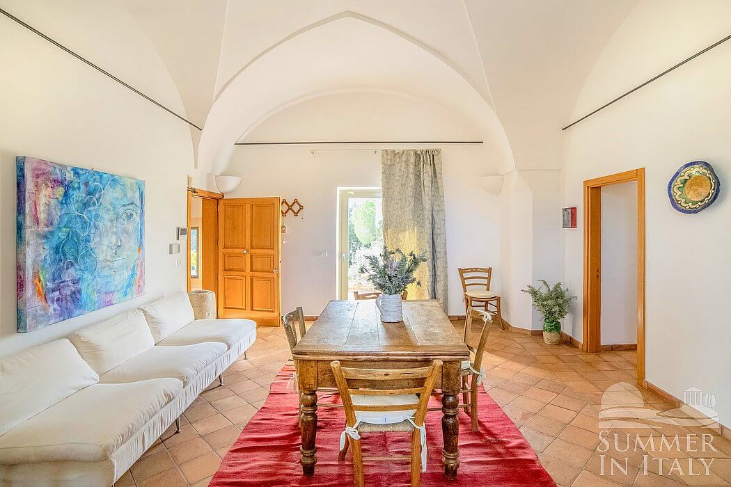 The first living room is paved with stone tiles. The ceiling is vaulted. The furnishings are warm and welcoming, and include two sofas. In the living room you will also find a cooking area. The kitchenette is equipped with a six-burner gas cooker, an electric oven, a refrigerator with freezer, a dishwasher, a microwave oven, an Italian-style coffee-maker and a kettle. The dining table can accommodate 16 guests. In this room you will find a television (local channels). From the living room you will be able to enter the patio through three French doors. The room also has three small high arched windows. It is equipped with an air conditioning/heating unit.