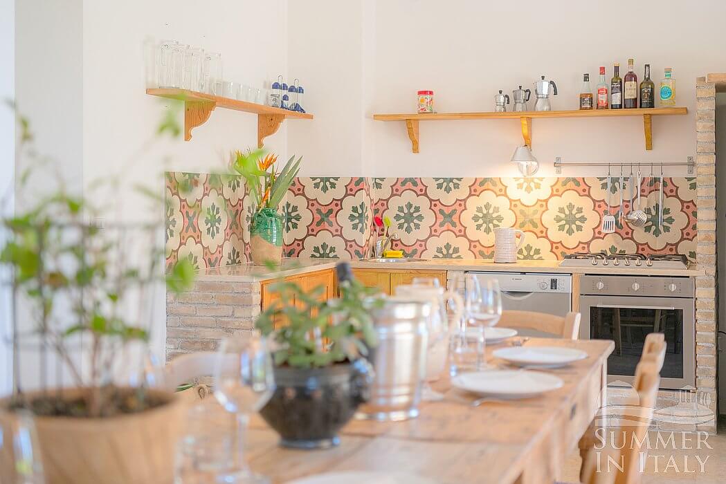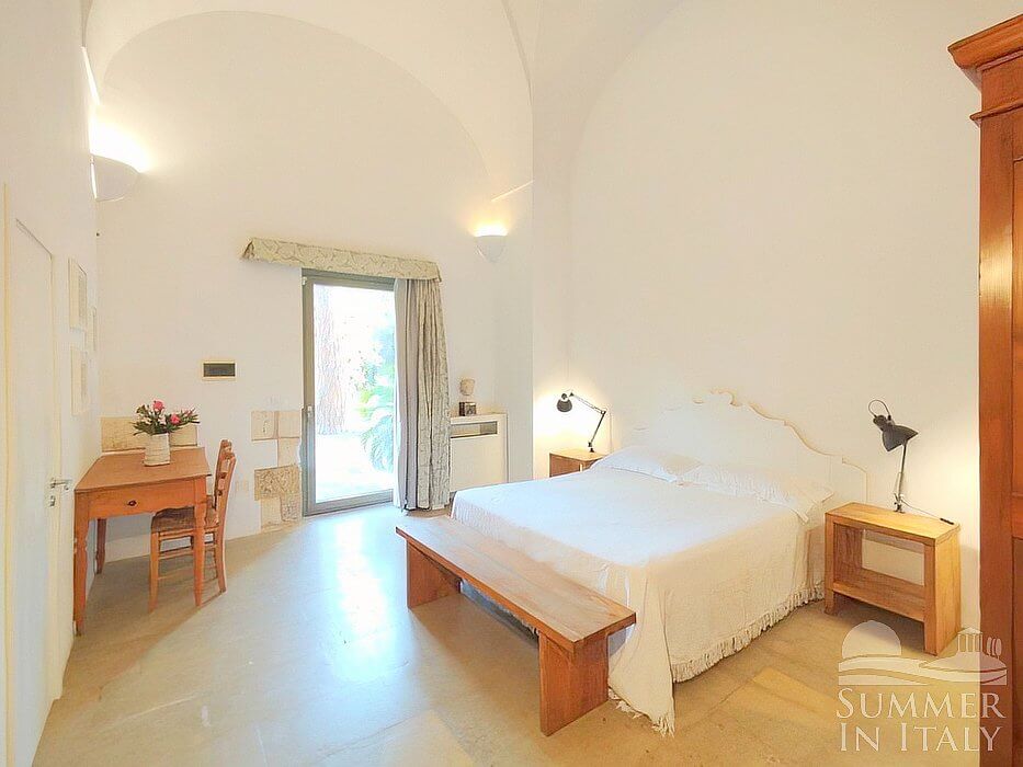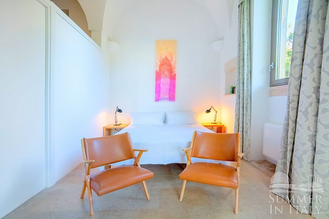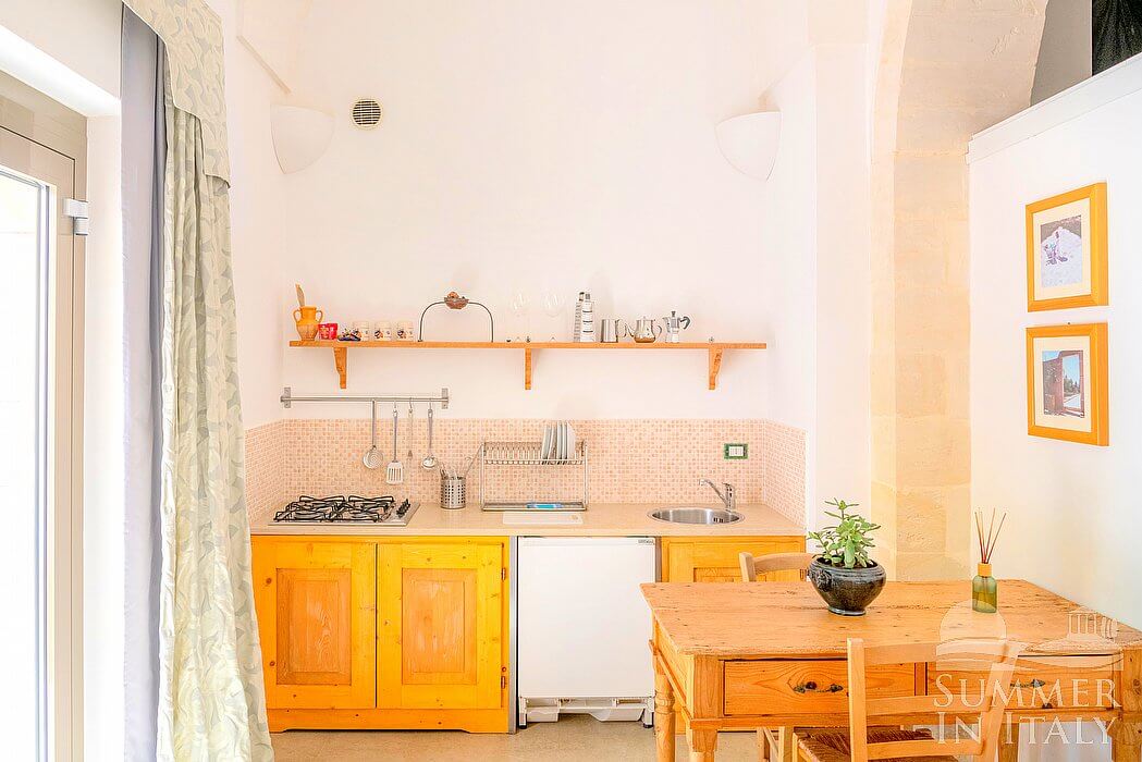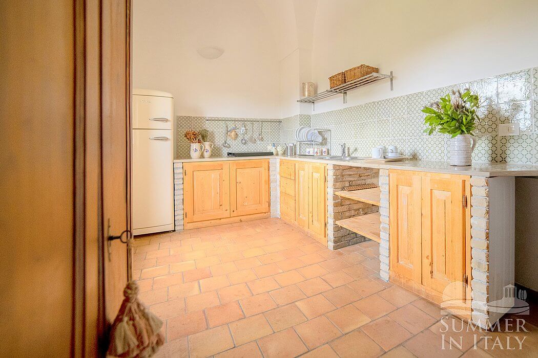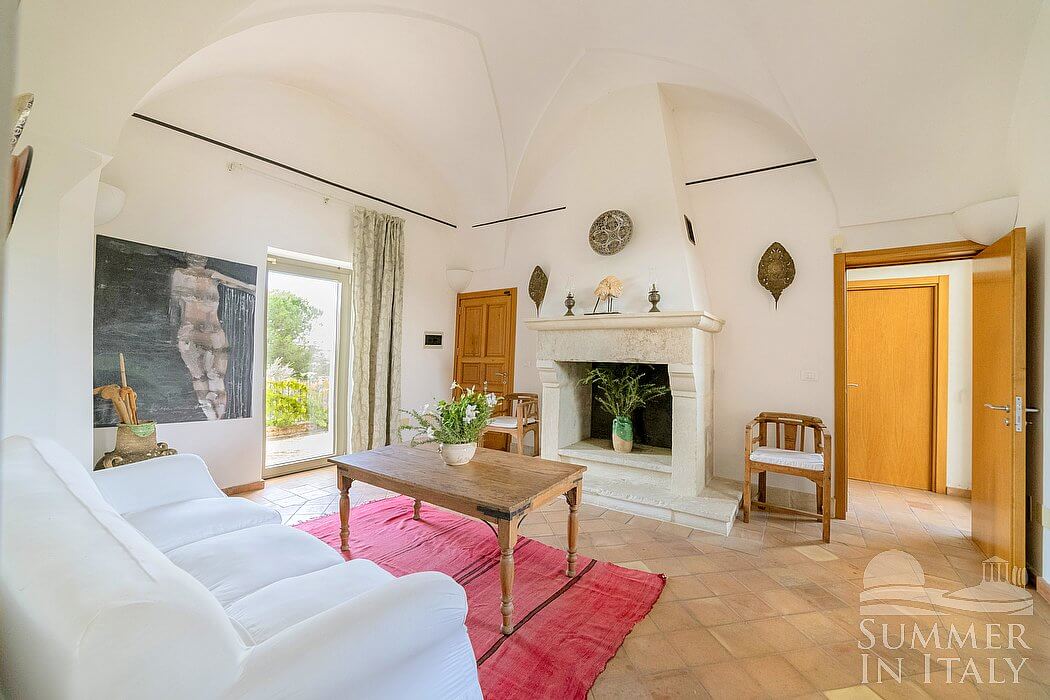 The first living room is paved with stone tiles. The ceiling is vaulted. The furnishings are warm and welcoming, and include two sofas. In the living room you will also find a cooking area. The kitchenette is equipped with a six-burner gas cooker, an electric oven, a refrigerator with freezer, a dishwasher, a microwave oven, an Italian-style coffee-maker and a kettle. The dining table can accommodate 16 guests. In this room you will find a television (local channels). From the living room you will be able to enter the patio through three French doors. The room also has three small high arched windows. It is equipped with an air conditioning/heating unit.