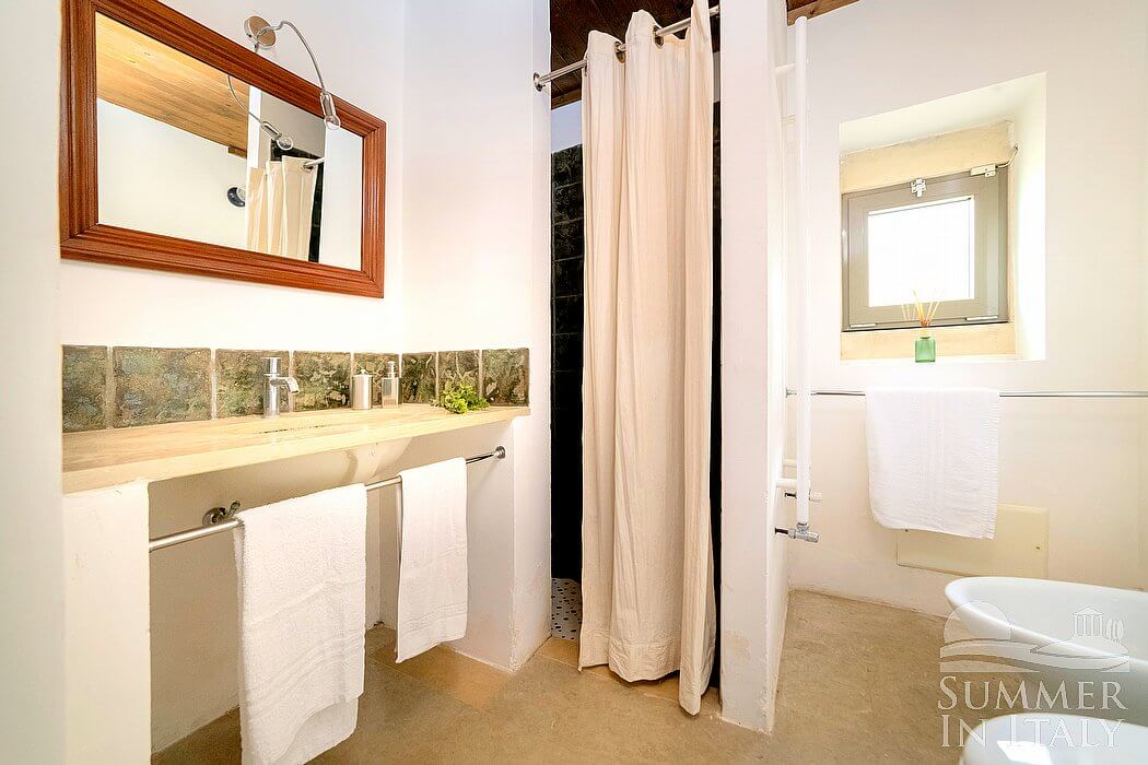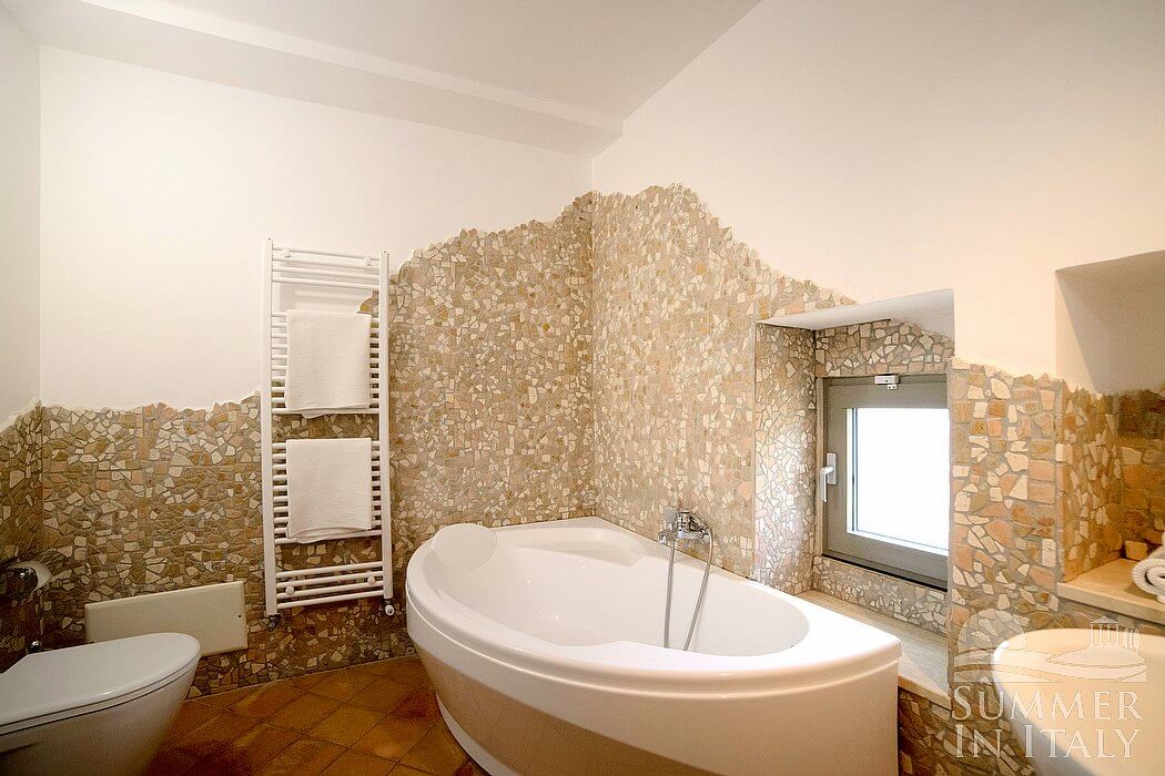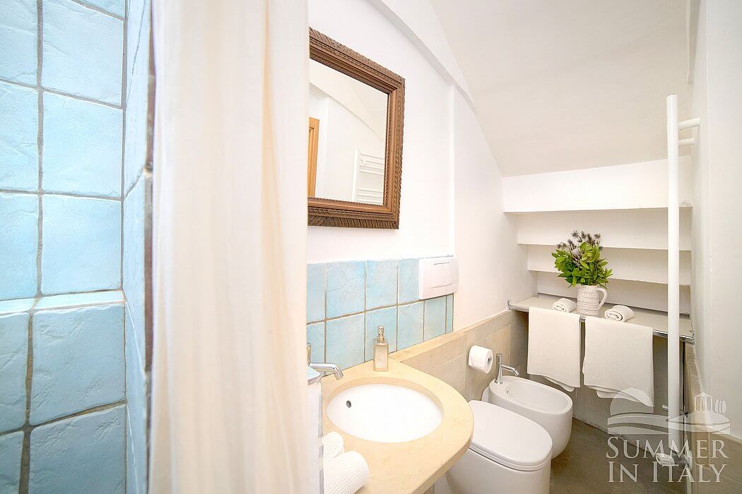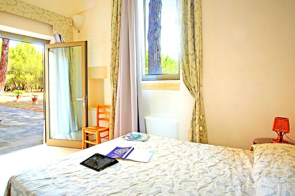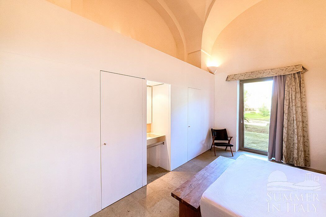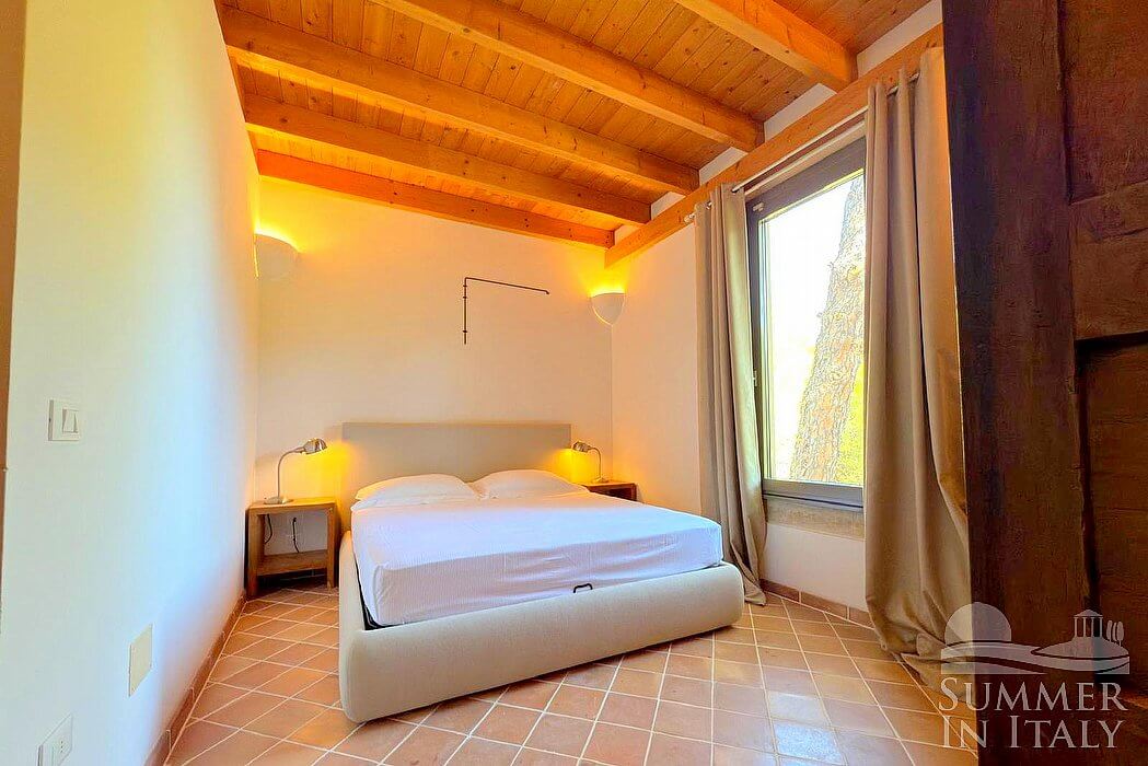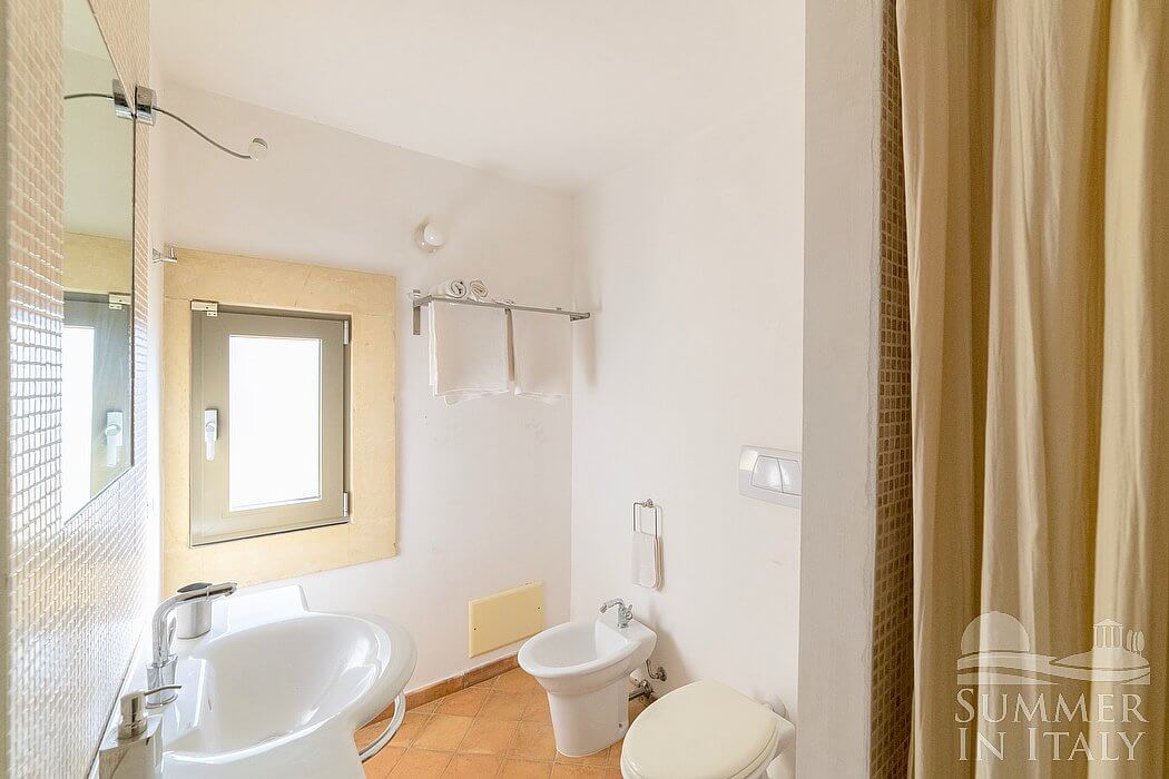 You will be able to enter the fifth bedroom from the patio through an external access. The bedroom has a matrimonial bed (160 cm/63 inches, wider than a queen-size bed). The room also has a window, and it's equipped with an air conditioning/heating unit. This bedroom has an en-suite bathroom, small and equipped with a washbasin, a toilet and a shower.