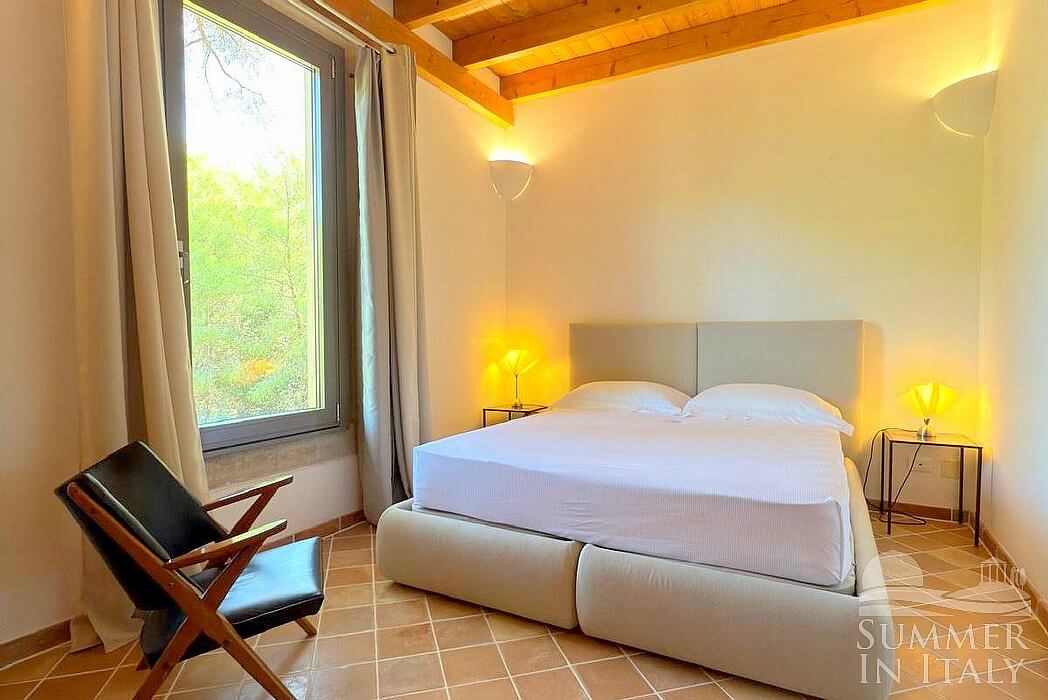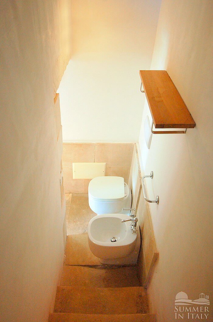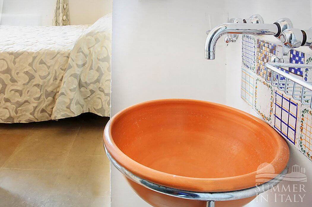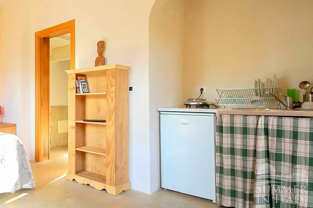You will be able to enter the fourth bedroom from the patio through an external access. The bedroom has a matrimonial bed (160 cm/63 inches, wider than a queen-size bed). The furnishings include a wood bench. There is also a cooking area. The kitchenette is equipped with a cooker with one electric burner, a small refrigerator without freezer and an Italian-style coffee-maker. The bedroom is equipped with an air conditioning/heating unit. This bedroom has an en-suite bathroom, small and equipped with a washbasin, a toilet and a shower.