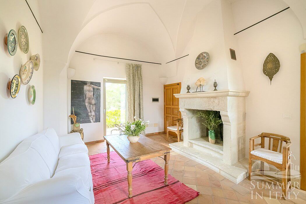 You will be able to enter the second living room through an access area. The floor is paved with terracotta tiles. The ceiling boasts a star vault. The furnishings are classic and welcoming, and include a sofa and two armchairs. There is a big fireplace made of stone, for decorative purposes only. From the living room you will be able to enter the terrace, going down approximately two steps, through a French door. The room is equipped with an air conditioning/heating unit.