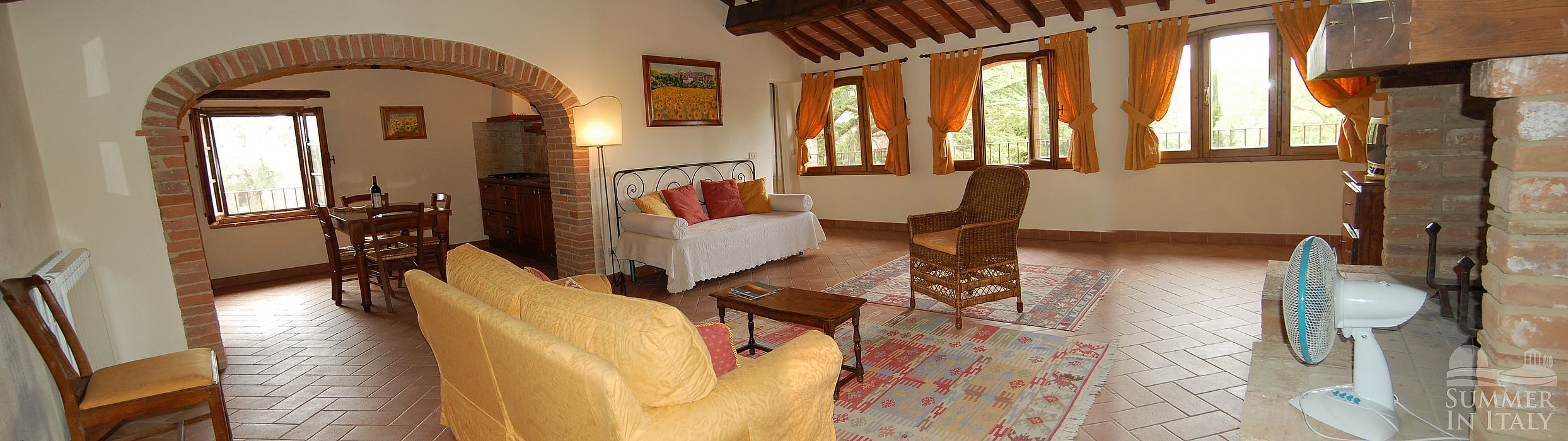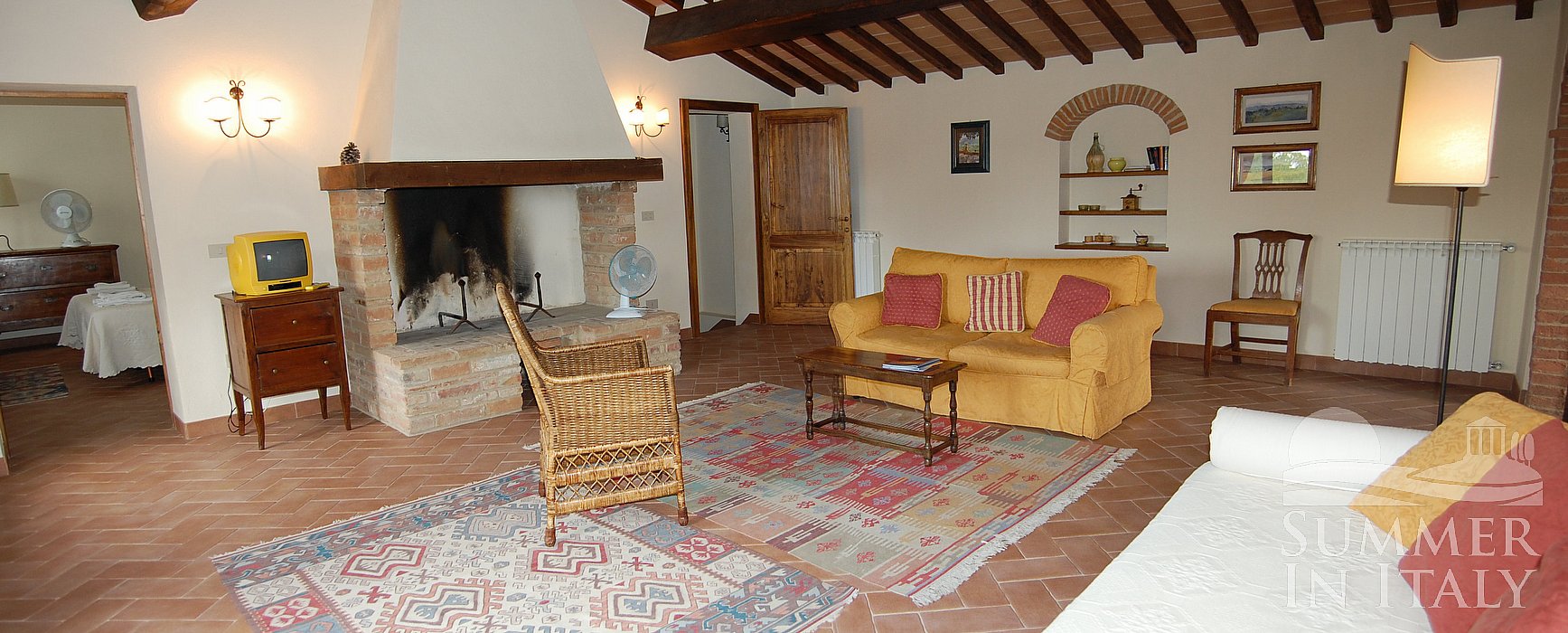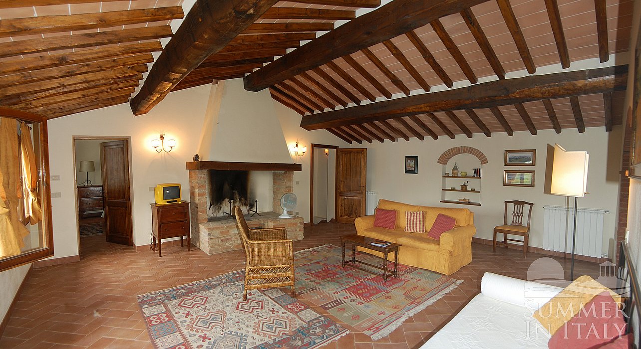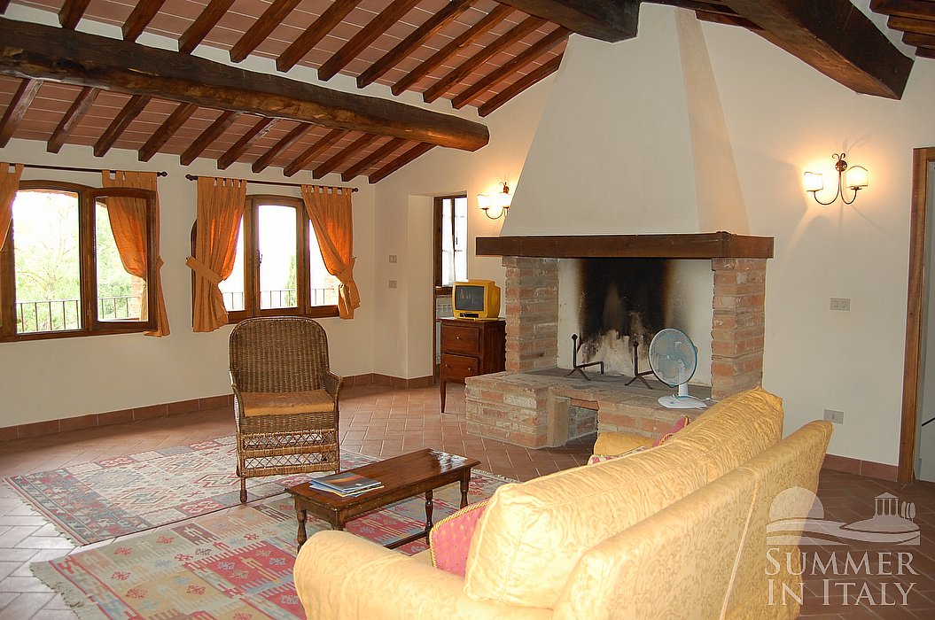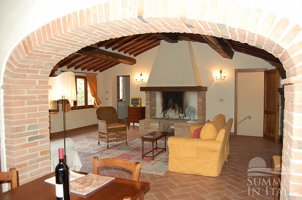 The living room is paved with ancient terracotta tiles. The ceiling is sloped and has characteristic exposed wood beams and terraccotta tiles. The furnishings are warm and welcoming. The furnishings include a sofa , an armchair and a divan bed for one guest. There is a big and age-old fireplace made of bricks. In this room you will find a small television (local channels). The room has three arched windows with a view of the garden and of the hills.