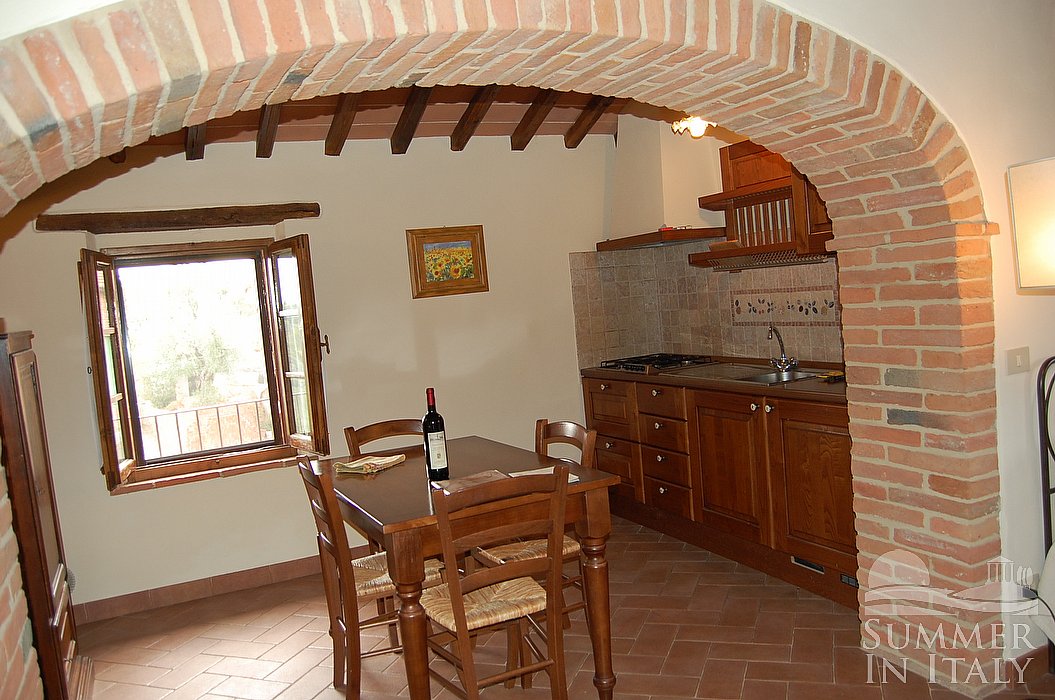 Villa Leopoldo B is a cozy and welcoming apartment which is part of a small and gracious medieval hamlet consisting of old houses in stone. It sleeps three people. From Villa Leopoldo B you will enjoy a charming view of the Crete Senesi and of the surrounding countryside. Villa Leopoldo B is 60 square meters (645 square feet). It features a shared swimming pool, a shared patio, two shared gardens and winter heating.