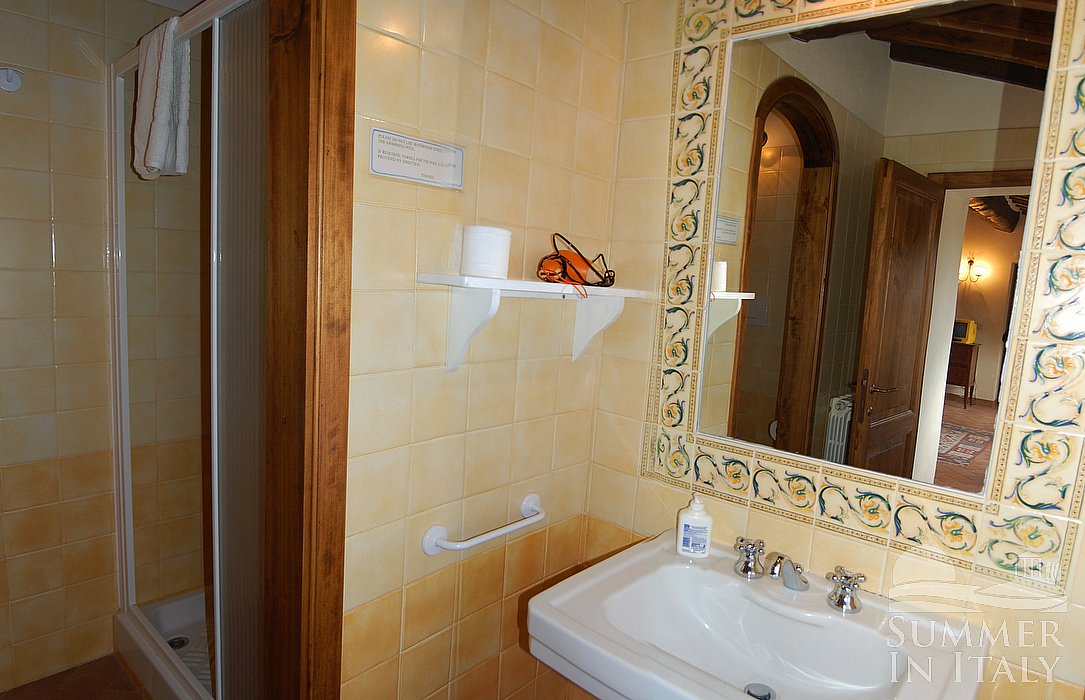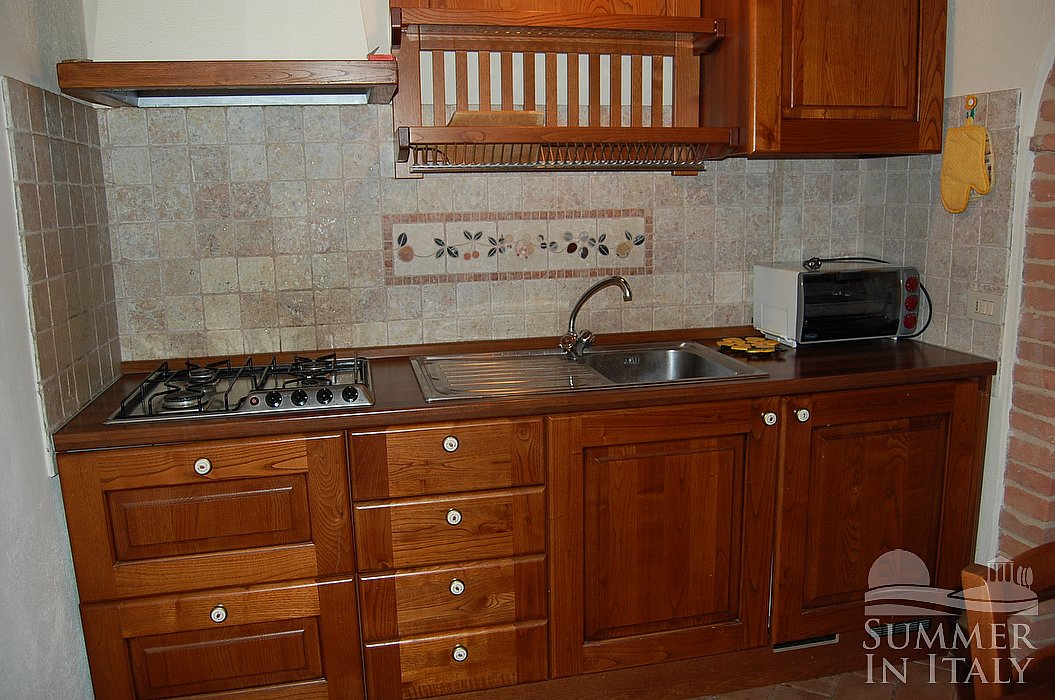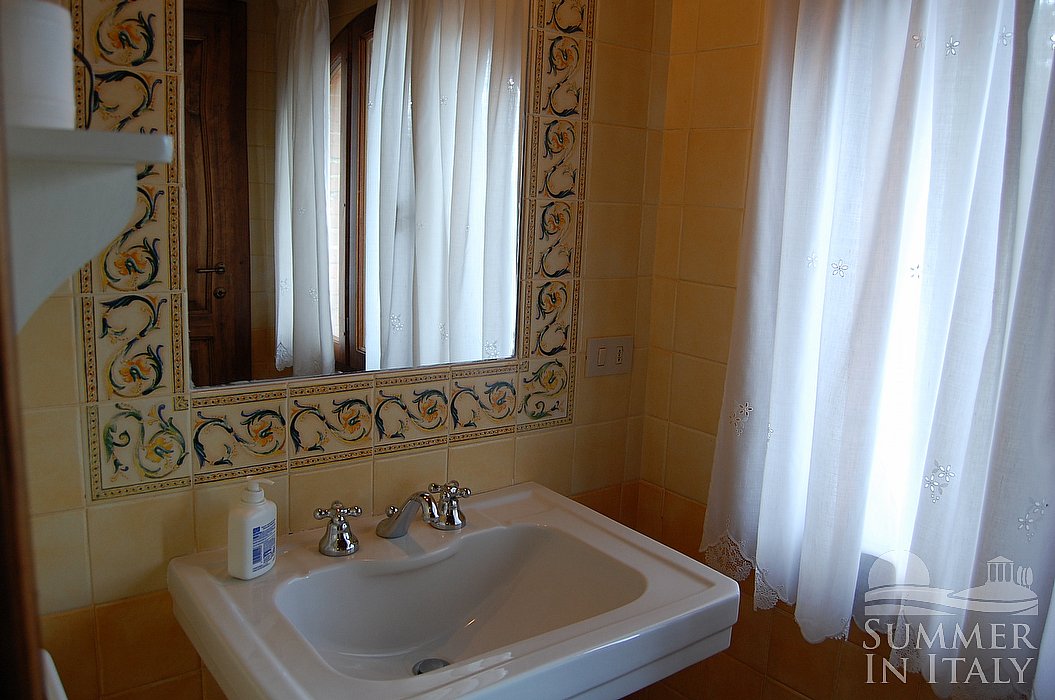 You will be able to enter the kitchen from the living room through a brickwork arched opening. It is equipped with a four-burner gas cooker, a small electric oven, a small refrigerator with freezer, an Italian-style coffee-maker and a kettle. Here you will also find an iron and an ironing board. There is a table to seat four guests. The kitchen has a window with a view of the greenery and of the hills.