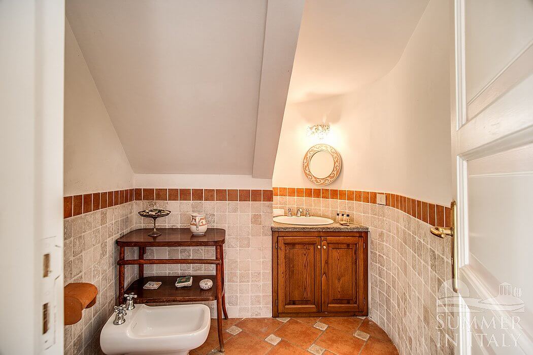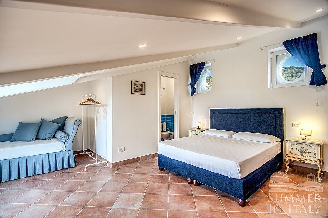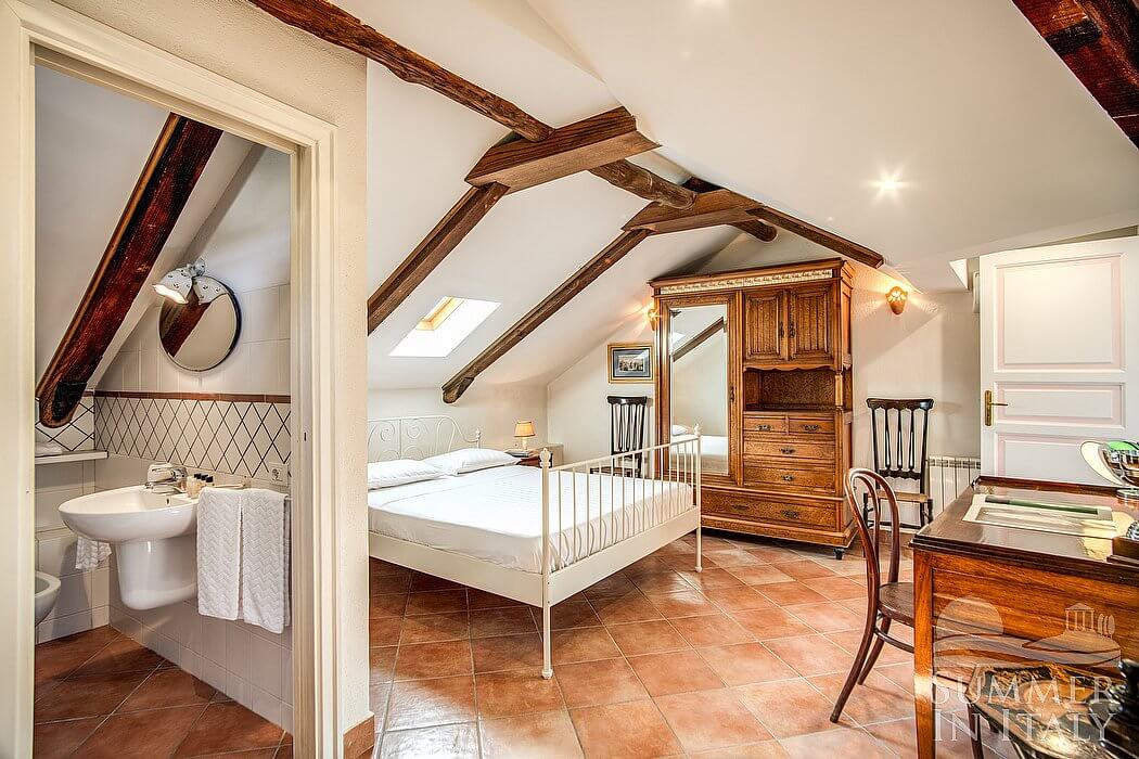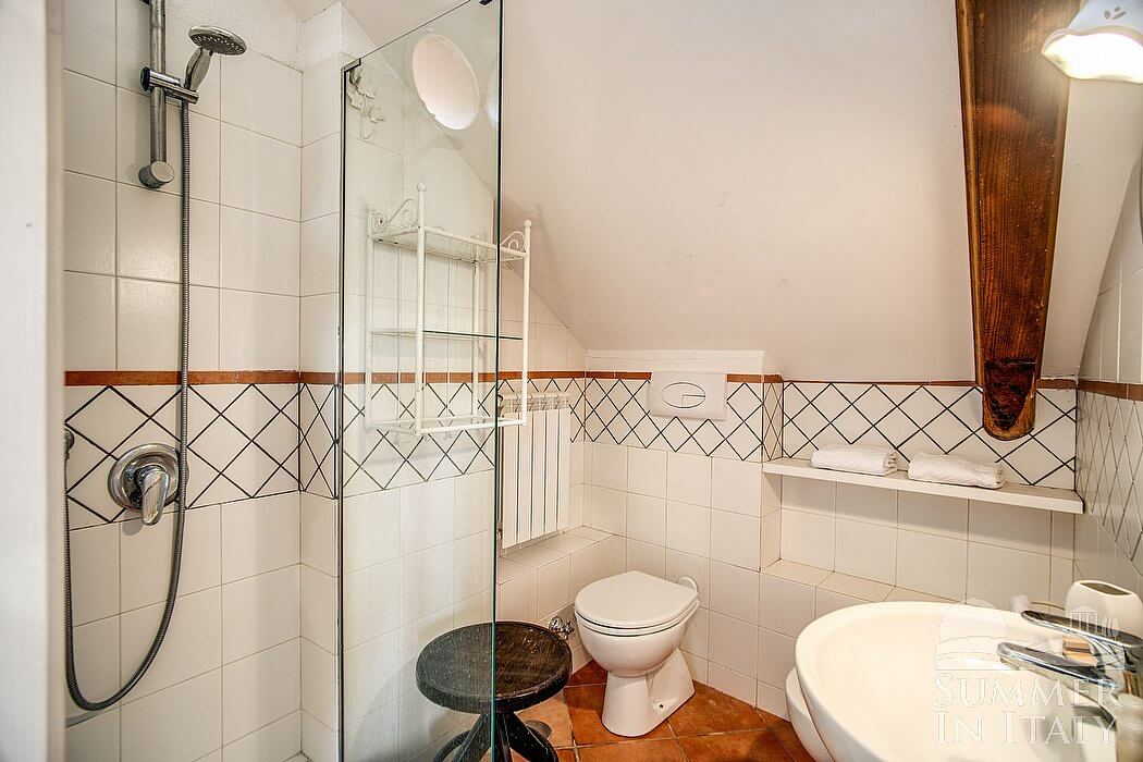 You will be able to enter the sixth bedroom through an access area. The ceiling is sloped and has white exposed wood beams. The room has a matrimonial bed (160 cm/63 inches, wider than a queen-size bed). The furnishings include a bedroom chair. In this room you will find a television (local channels). The room has two small high windows, as well as a Juliet balcony. The bedroom is equipped with an air conditioning/heating unit. This bedroom has an en-suite bathroom, tiled with lucid blue majolica tiles and equipped with a washbasin, a toilet and a fully enclosed shower.