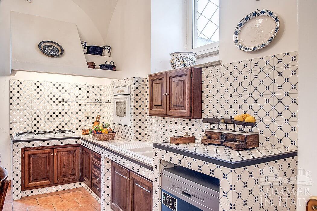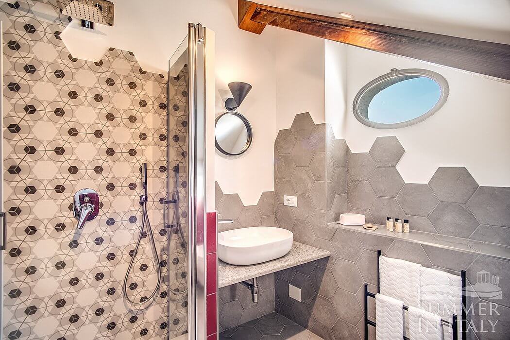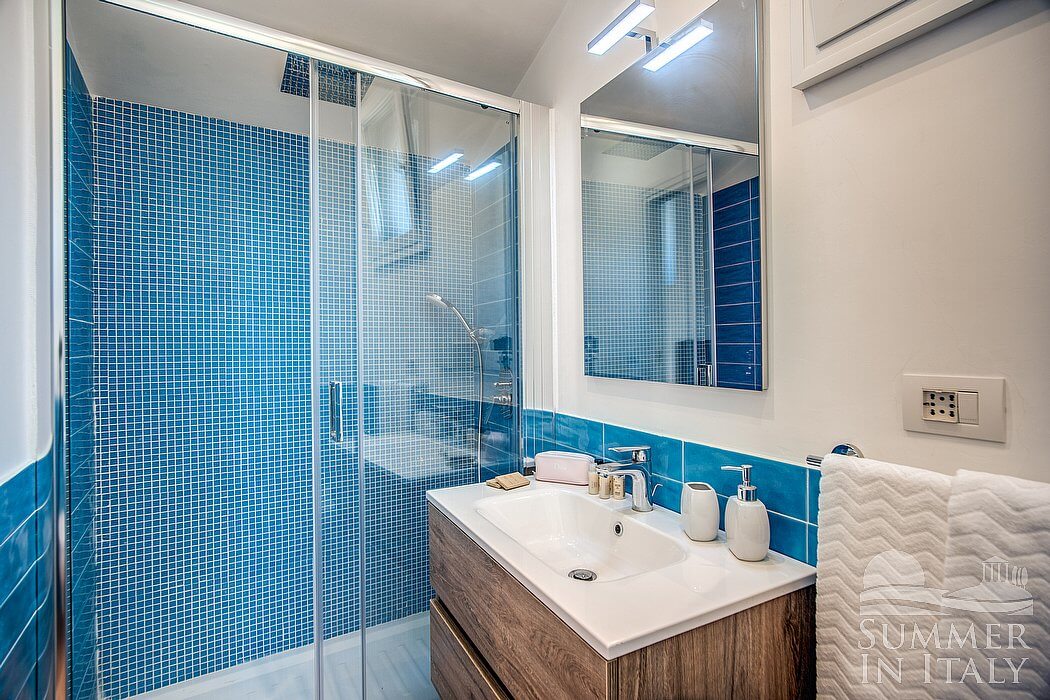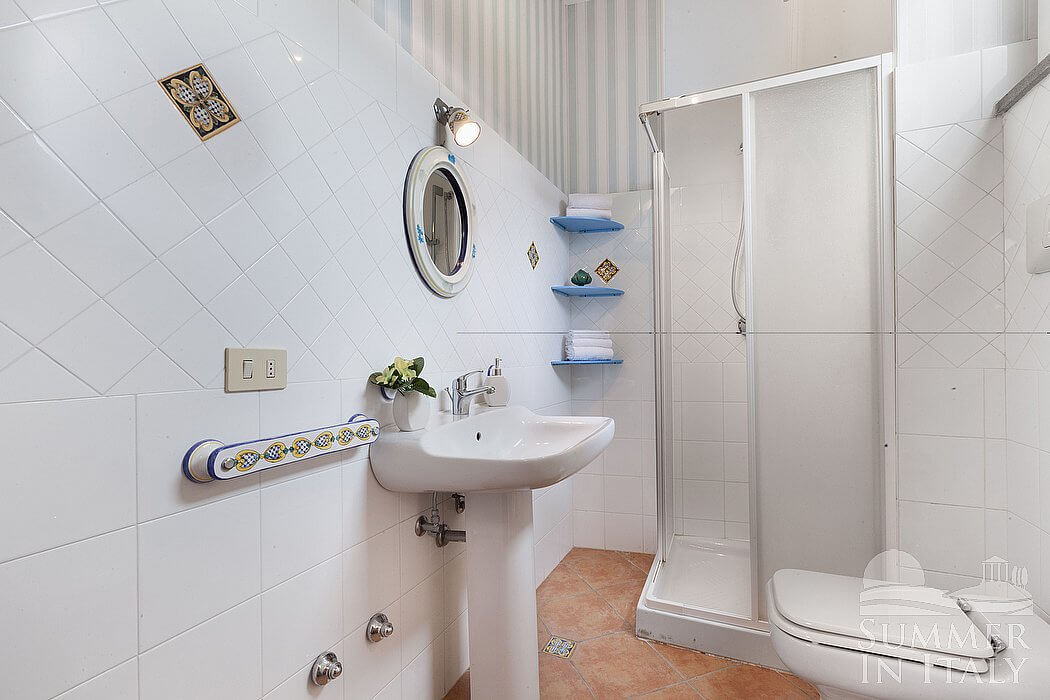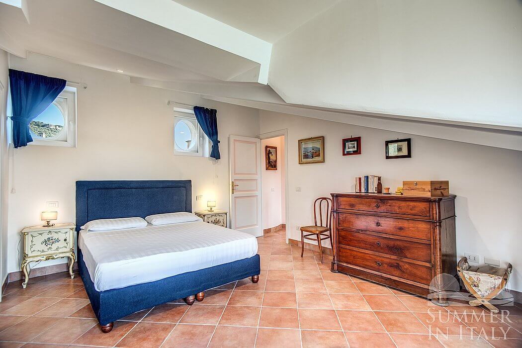 You will be able to enter the sixth bedroom through an access area. The ceiling is sloped and has white exposed wood beams. The room has a matrimonial bed (160 cm/63 inches, wider than a queen-size bed). The furnishings include a bedroom chair. In this room you will find a television (local channels). The room has two small high windows, as well as a Juliet balcony. The bedroom is equipped with an air conditioning/heating unit. This bedroom has an en-suite bathroom, tiled with lucid blue majolica tiles and equipped with a washbasin, a toilet and a fully enclosed shower.
