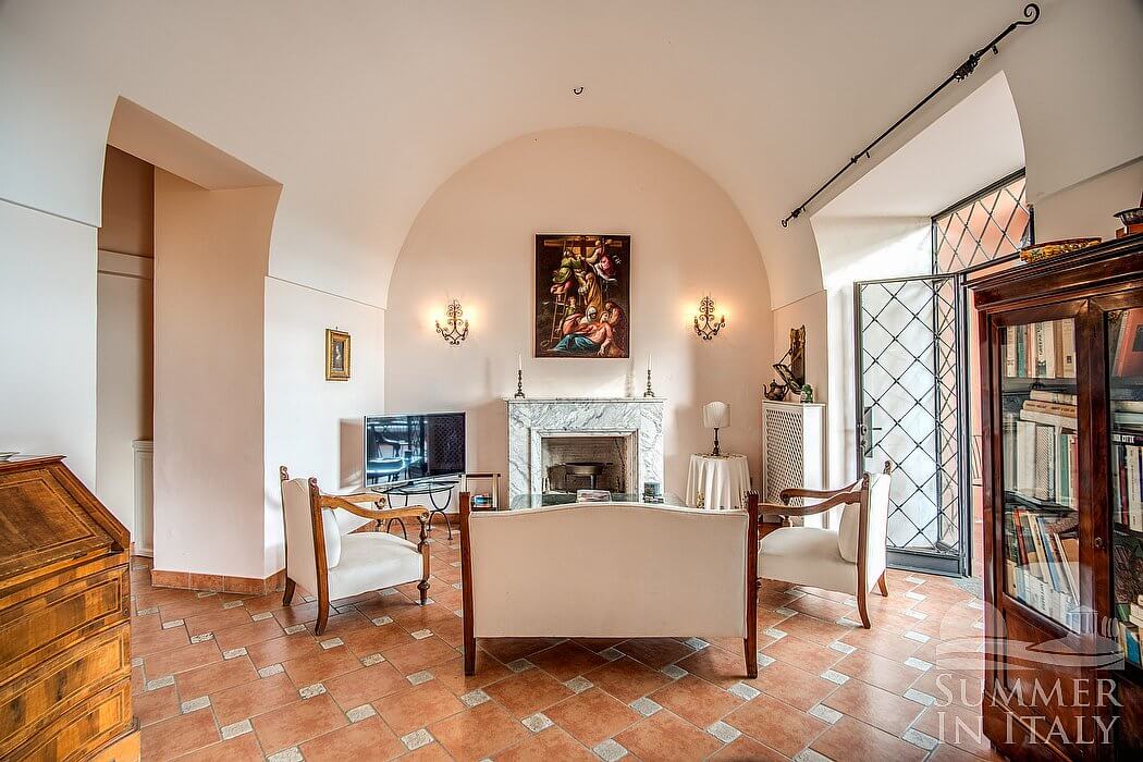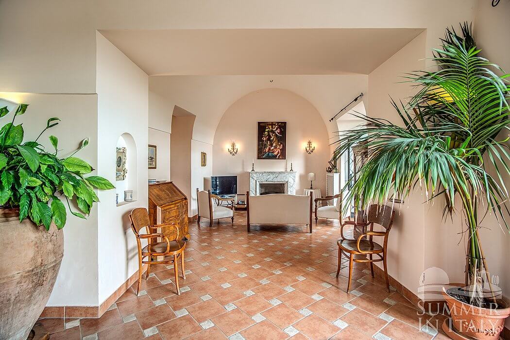The living room is paved with terracotta tiles. The furnishings are elegant, and include some antique pieces. The furnishings include sofas and armchairs. There is a nice fireplace decorated in marble. The dining table can accommodate four guests. In this room you will find a television (local channels). From the living room you will be able to enter the patio through two French doors.