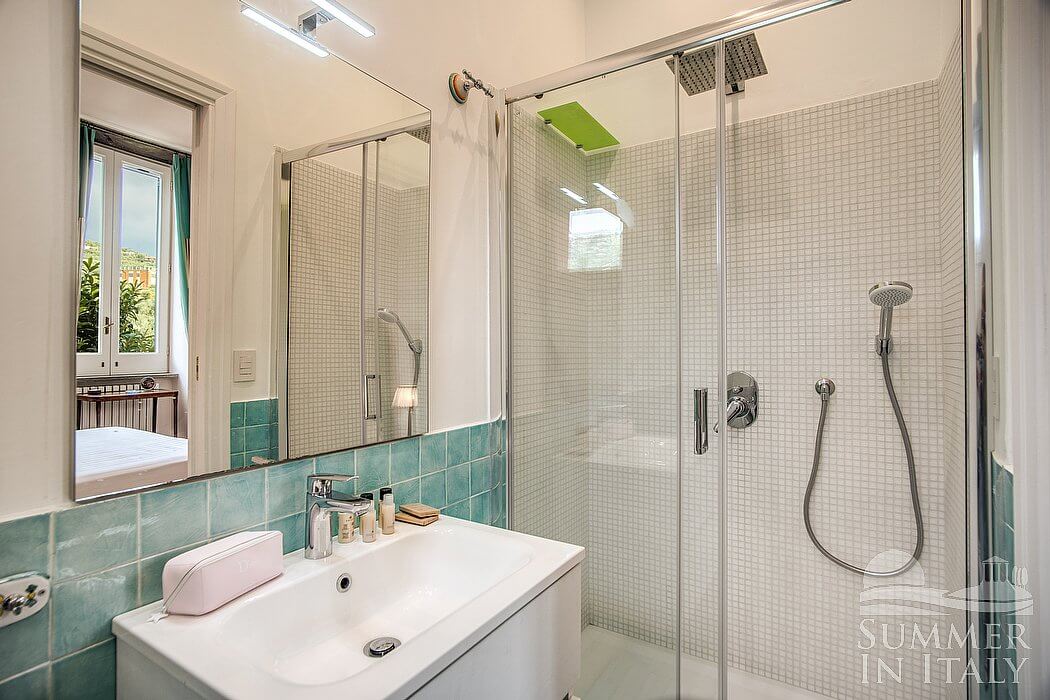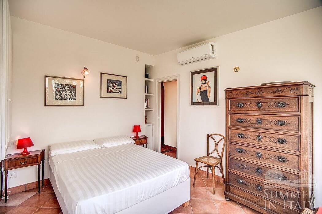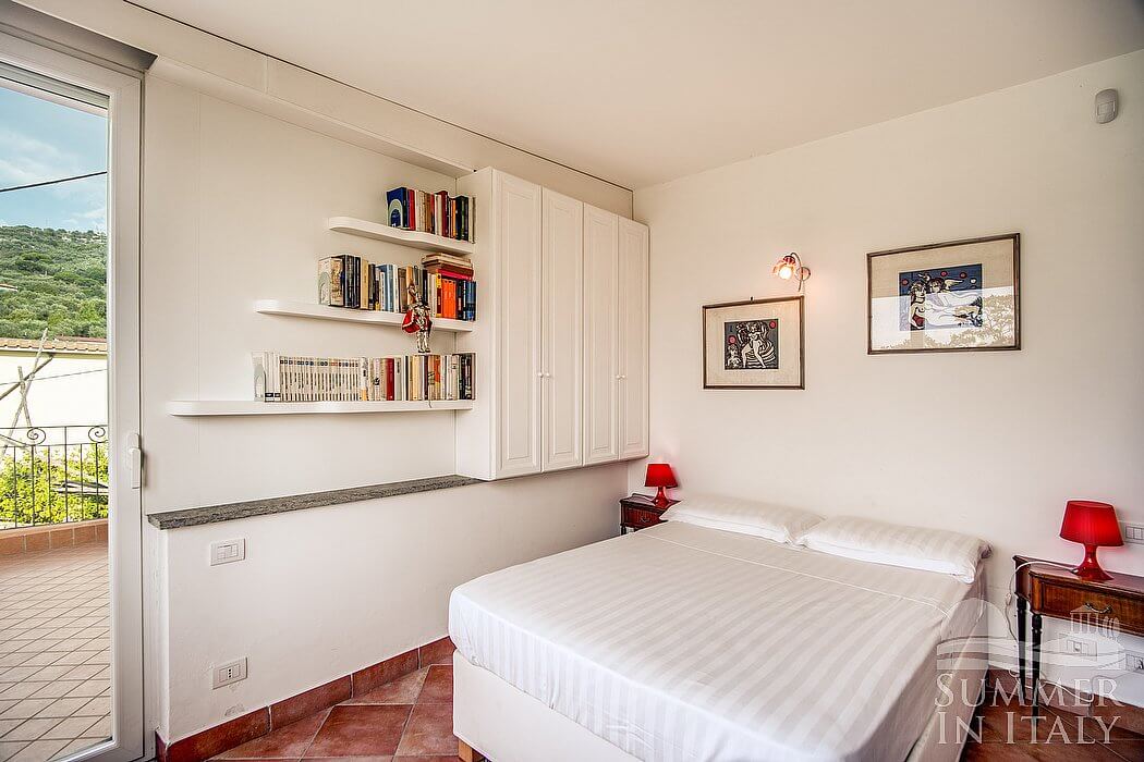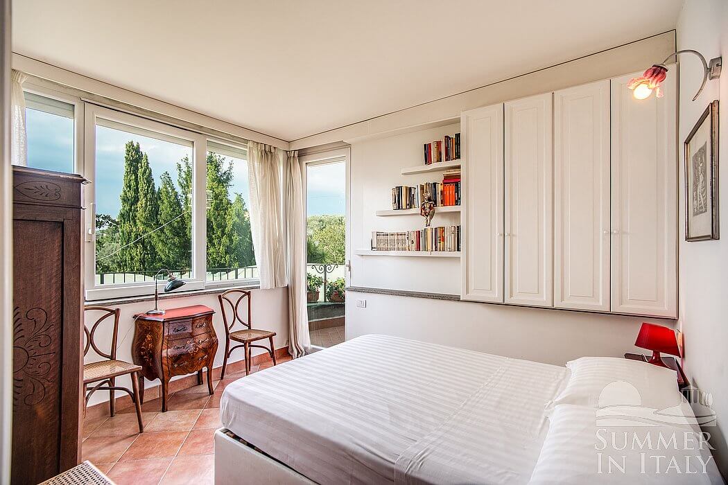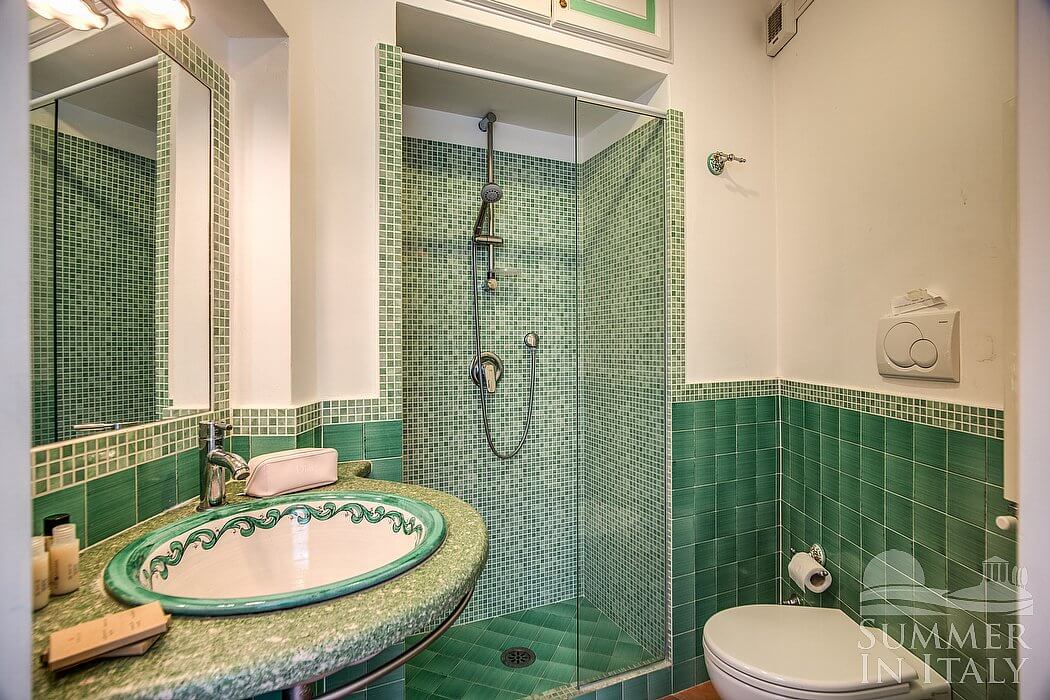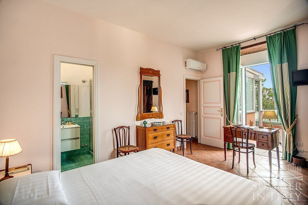 You will be able to enter the first bedroom through a corridor. The ceiling is vaulted. The room has a matrimonial bed (160 cm/63 inches, wider than a queen-size bed). The furnishings include a desk. From the bedroom you will be able to enter a terrace, which is equipped with table and chairs, through a French door. The room also has a window with a view of the garden. This bedroom has an en-suite bathroom, tiled with lucid green majolica tiles and equipped with a washbasin, a toilet and a fully enclosed shower.