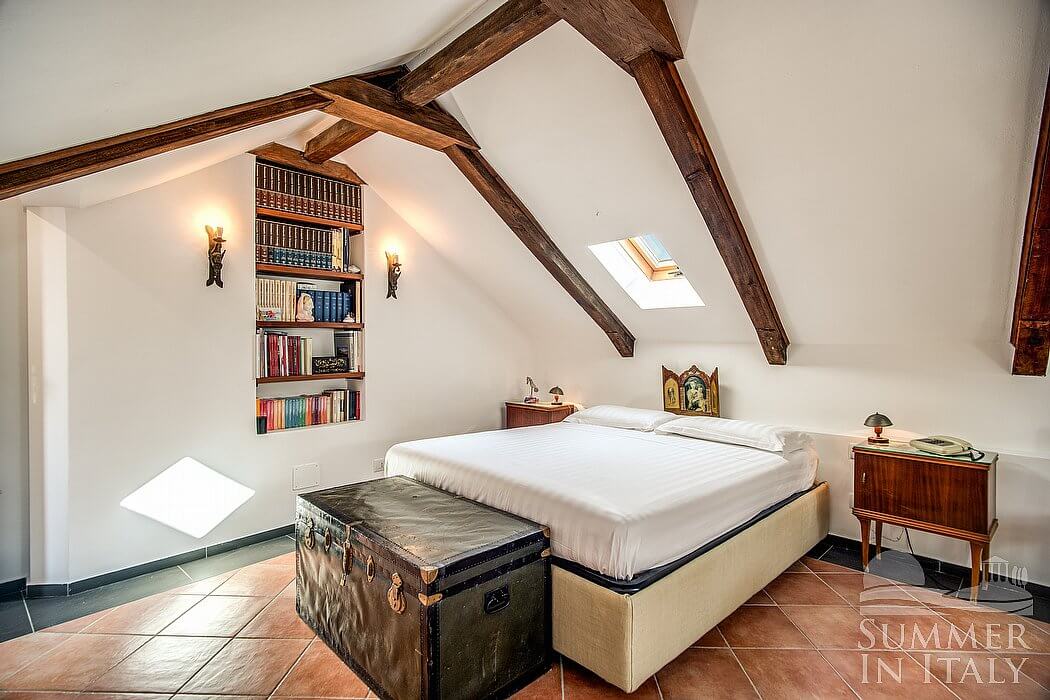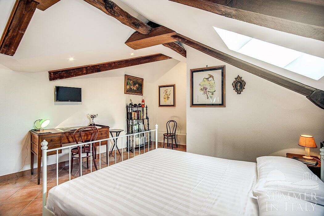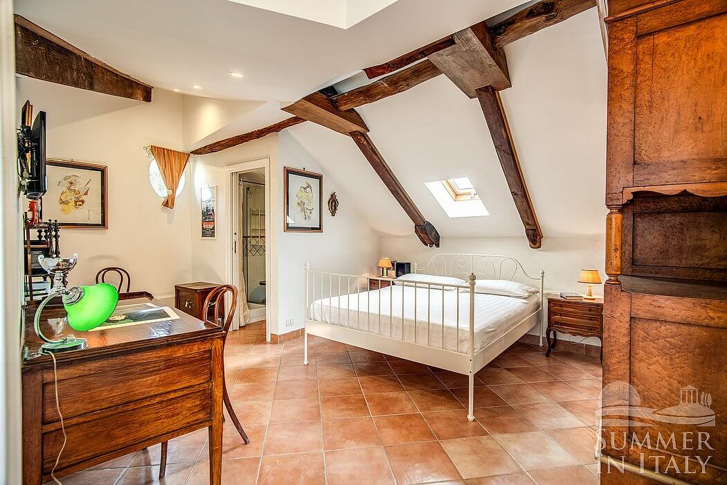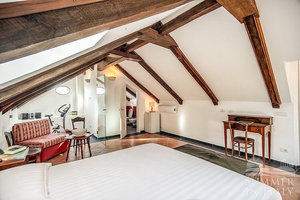 You will be able to enter the fourth bedroom climbing 16 steps. The ceiling is sloped and has characteristic exposed wood beams. The room has a matrimonial bed (160 cm/63 inches, wider than a queen-size bed). The furnishings include a desk. In this room you will find a television (local channels). You will find a fitness area equipped with an exercise bike. The room has two roof windows. The bedroom is equipped with an air conditioning/heating unit. This bedroom has an en-suite bathroom, equipped with a washbasin, a toilet and a fully enclosed shower.