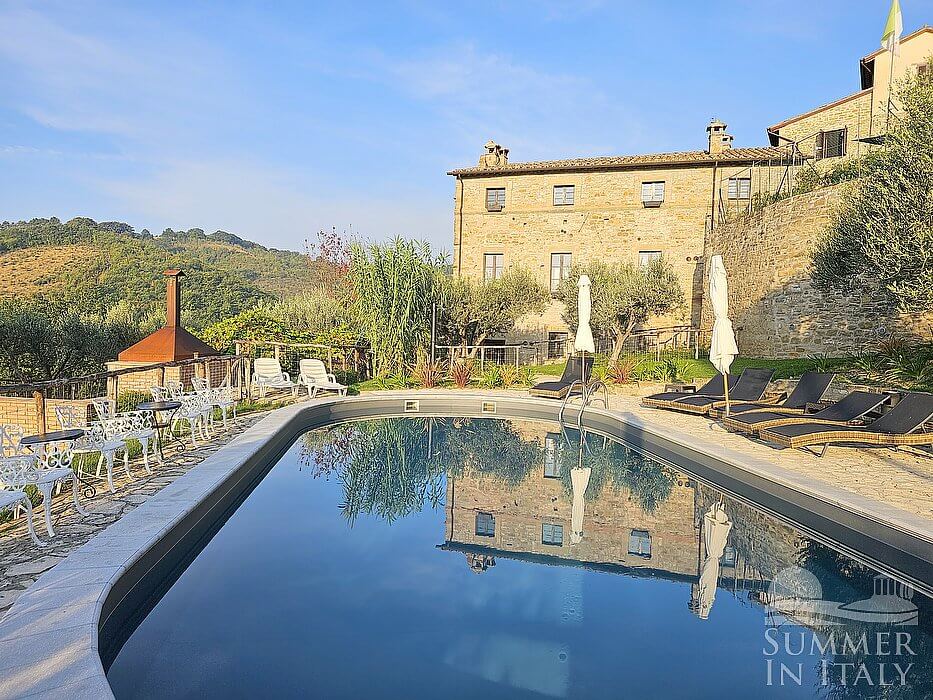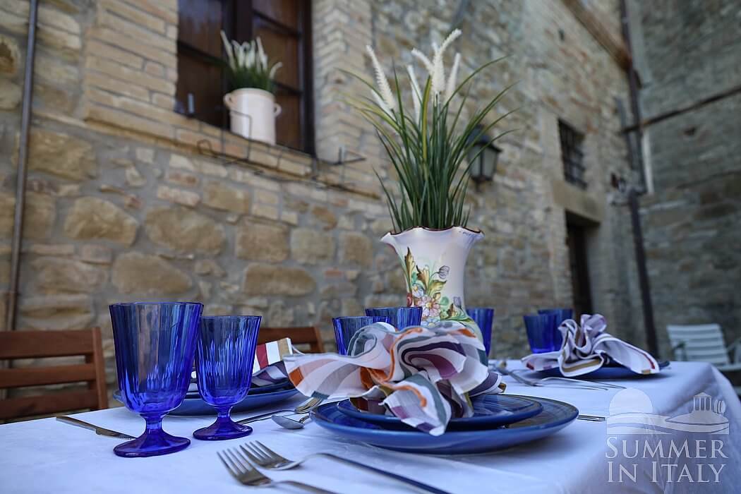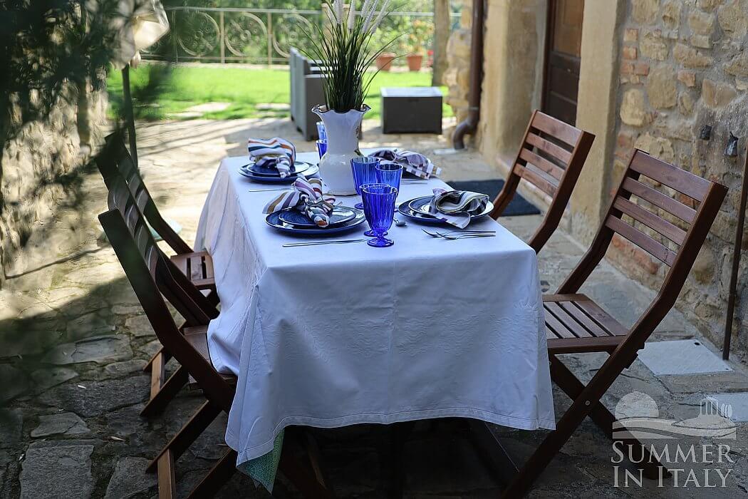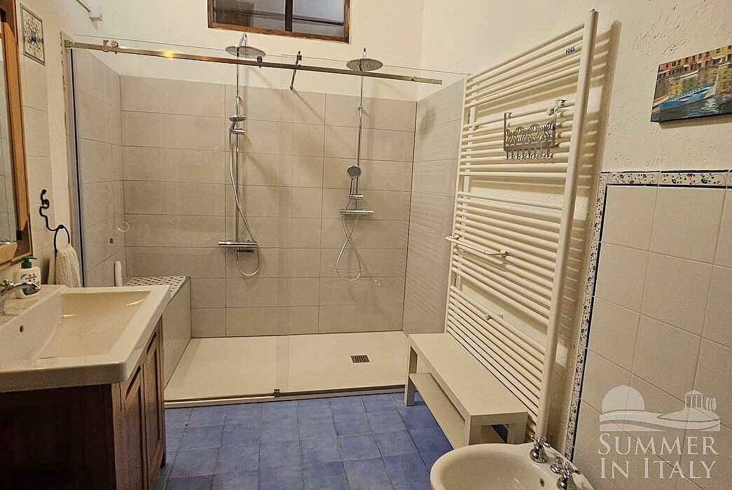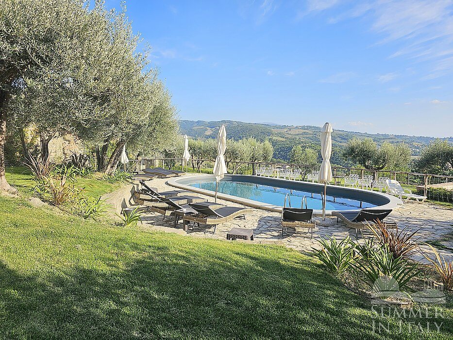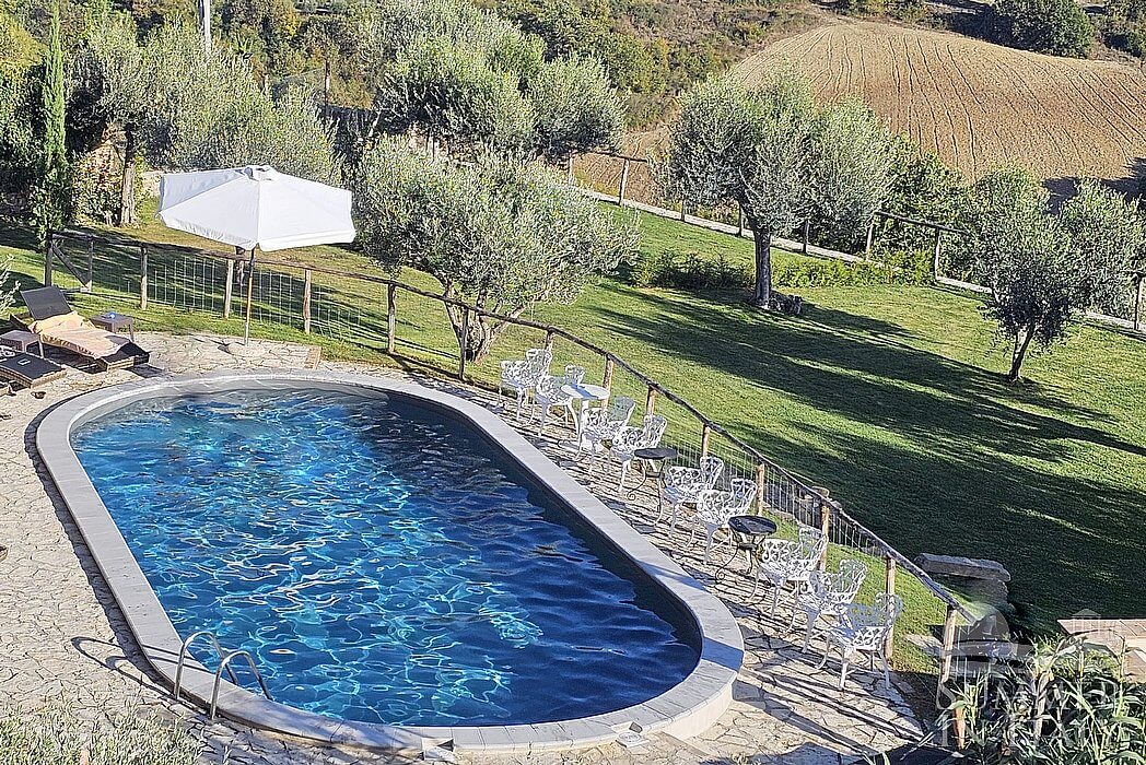 The swimming pool is 5 meters (16 feet) large by 11 meters (36 feet) long, 1.5 meters (5 feet) deep. The swimming pool has an oval shape. The area is equipped with tables, chairs, sun umbrellas, sun loungers and an external shower. From the swimming pool you will enjoy a fascinating view of the valley and of the greenery. The pool is open all year round, although it is not heated.