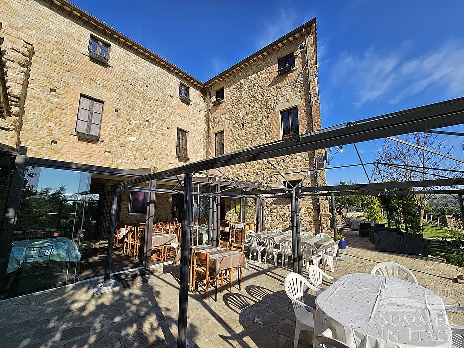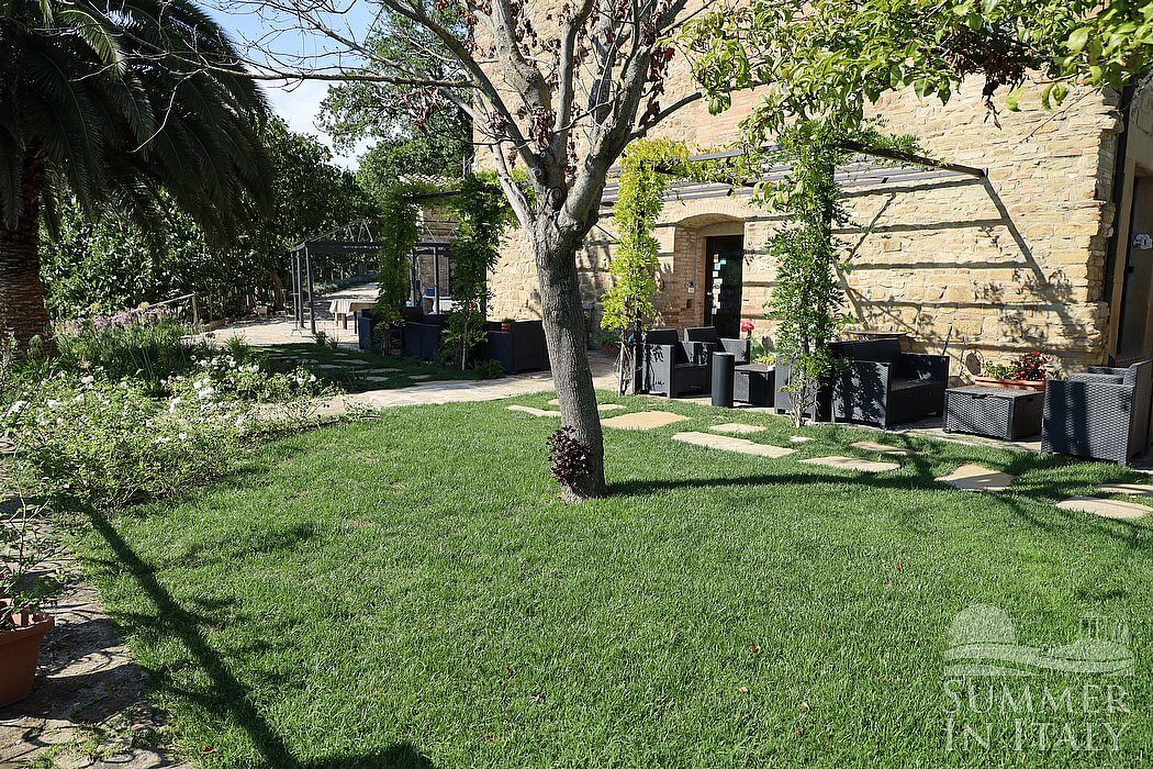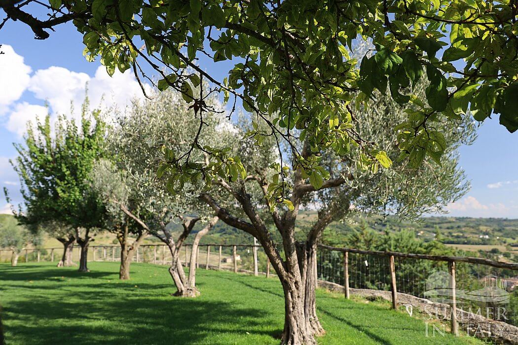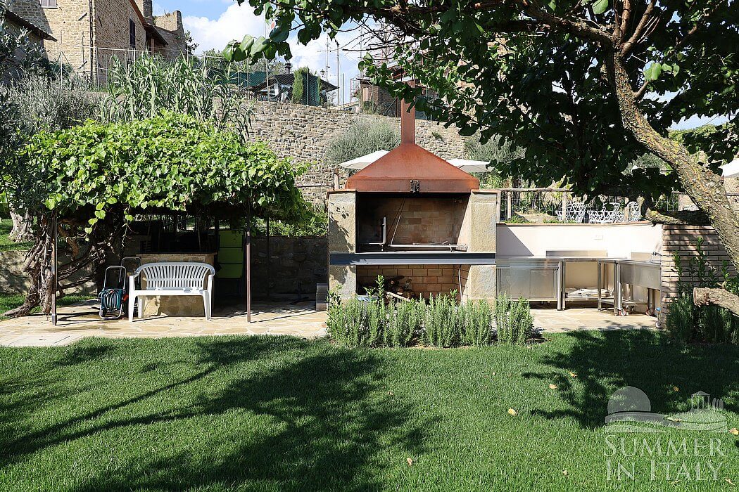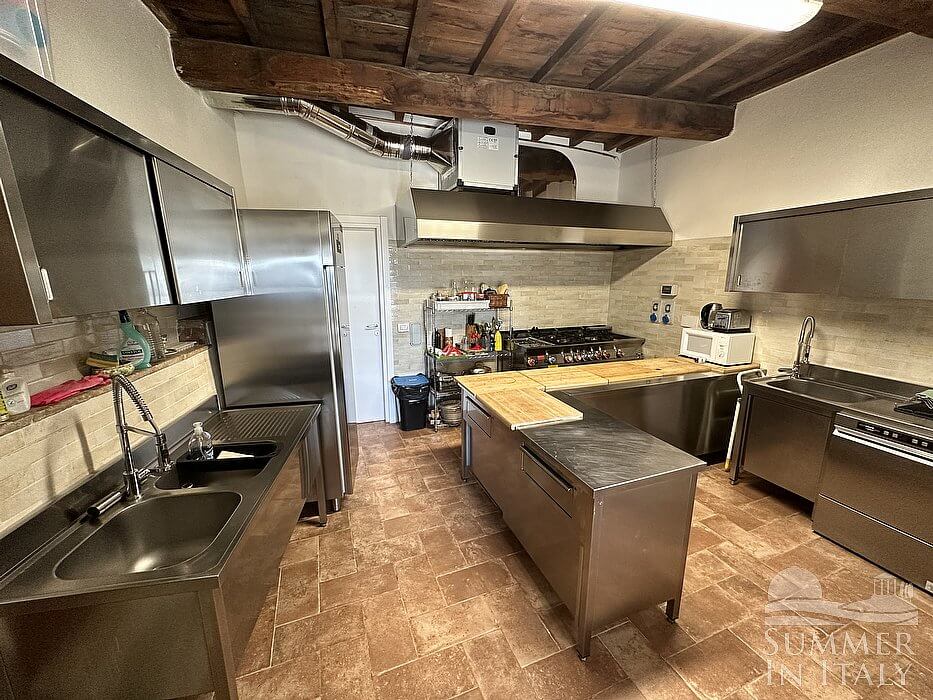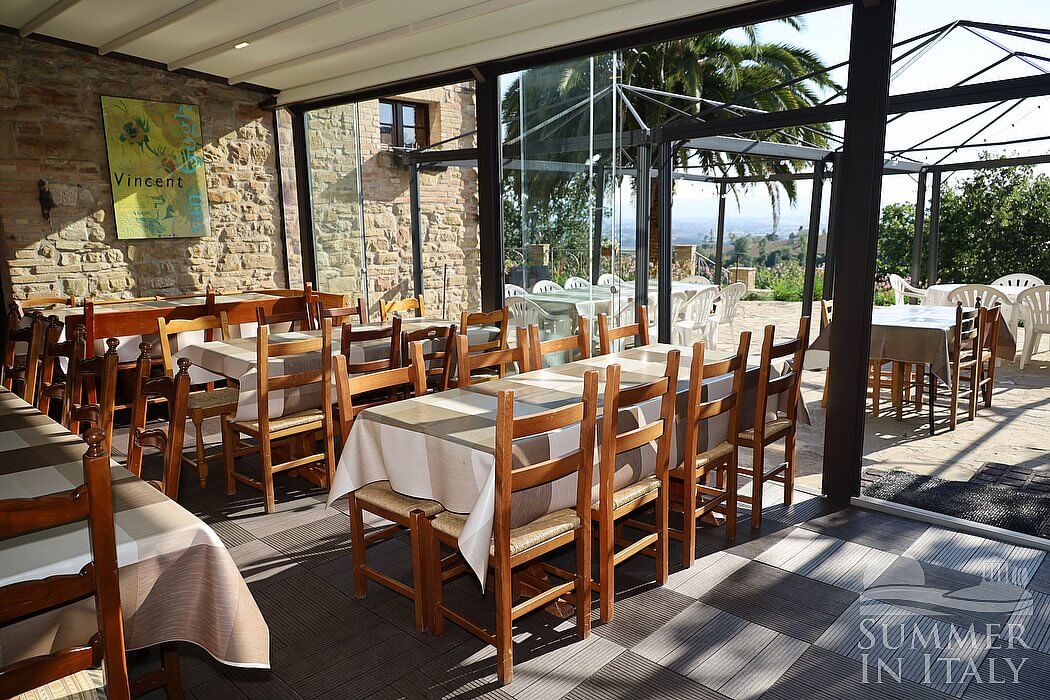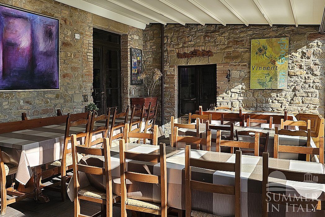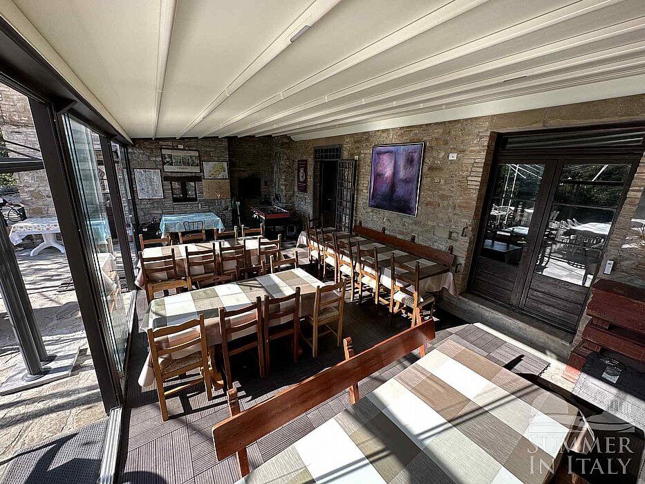 You will be able to reach the verandah from the kitchen or from the first living room. Is equipped with two wood benches, and the five dining tables can accommodate 32 guests. Here you will also find a small wood-fired pizza oven, and you will be able to have fun with a football table. From the verandah you will have a lovely view of the greenery and of the garden.