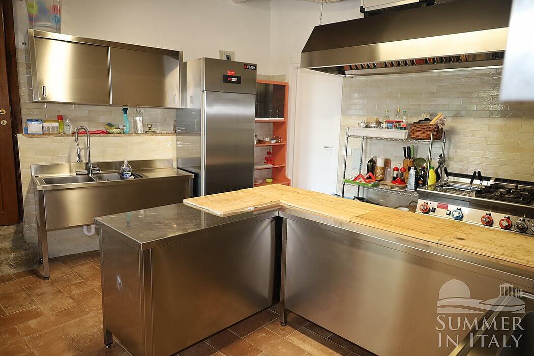 You will be able to enter the kitchen from the first living room, or from the second living room going down six steps. It is professional-grade, equipped with a four-burner gas cooker, an electric oven, a refrigerator with freezer, a dishwasher, a microwave oven, an Italian-style coffee-maker, a toaster and a kettle. From the kitchen a French door will take you to the verandah.