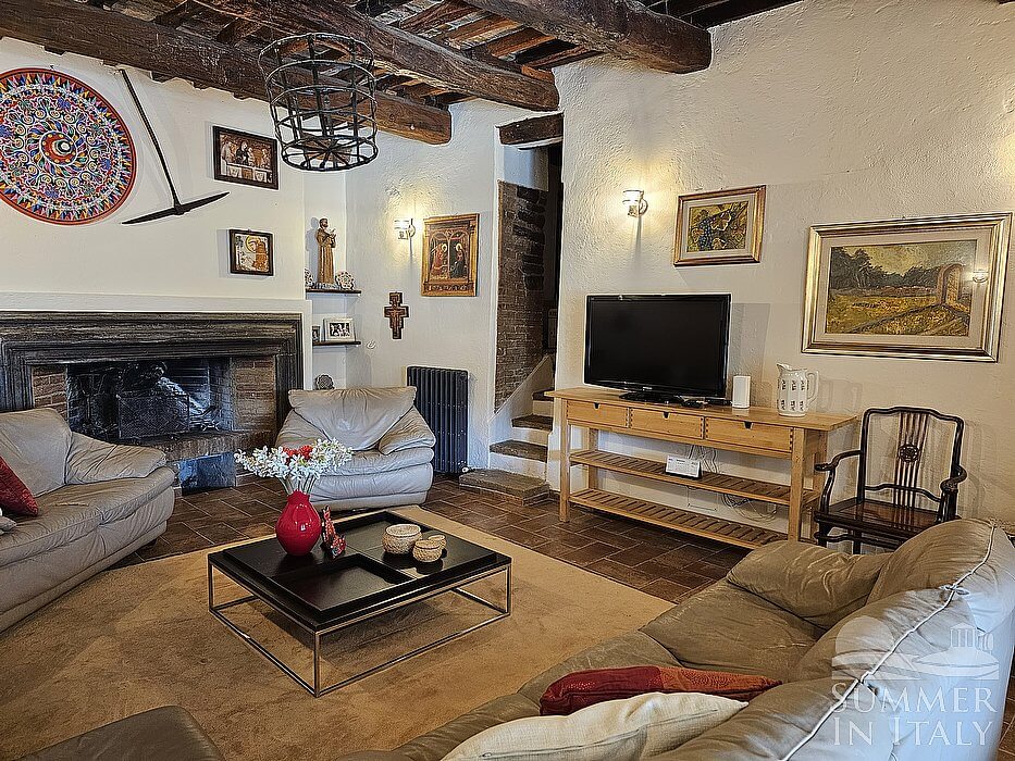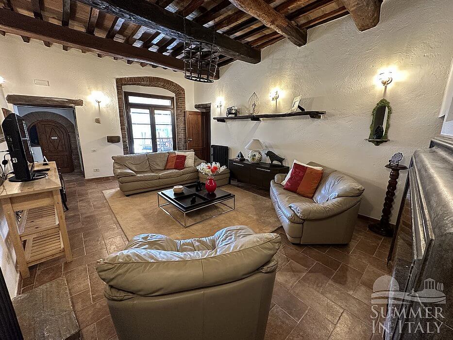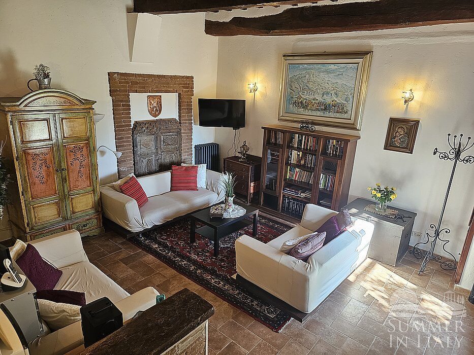 The first living room is paved with terracotta tiles. The ceiling has characteristic exposed wood beams and terracotta tiles. The furnishings are warm and welcoming, and include two sofas and two armchairs. There is an age-old fireplace made of bricks. In this room you will find a television (local channels). From the living room you will be able to enter the verandah through a French door.