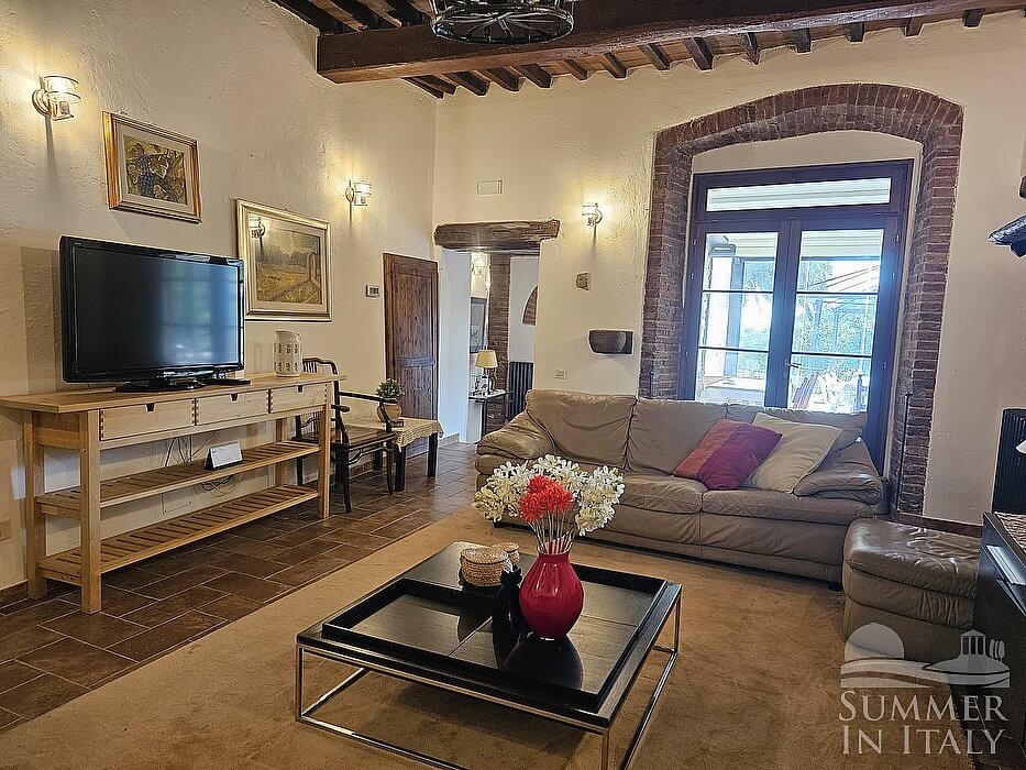 The second living room is paved with terracotta tiles. The ceiling has characteristic exposed wood beams and terracotta tiles. The furnishings are warm and welcoming, and include three sofas. In this room you will find a television (local channels). From the living room you will be able to enter the garden through a French door.
