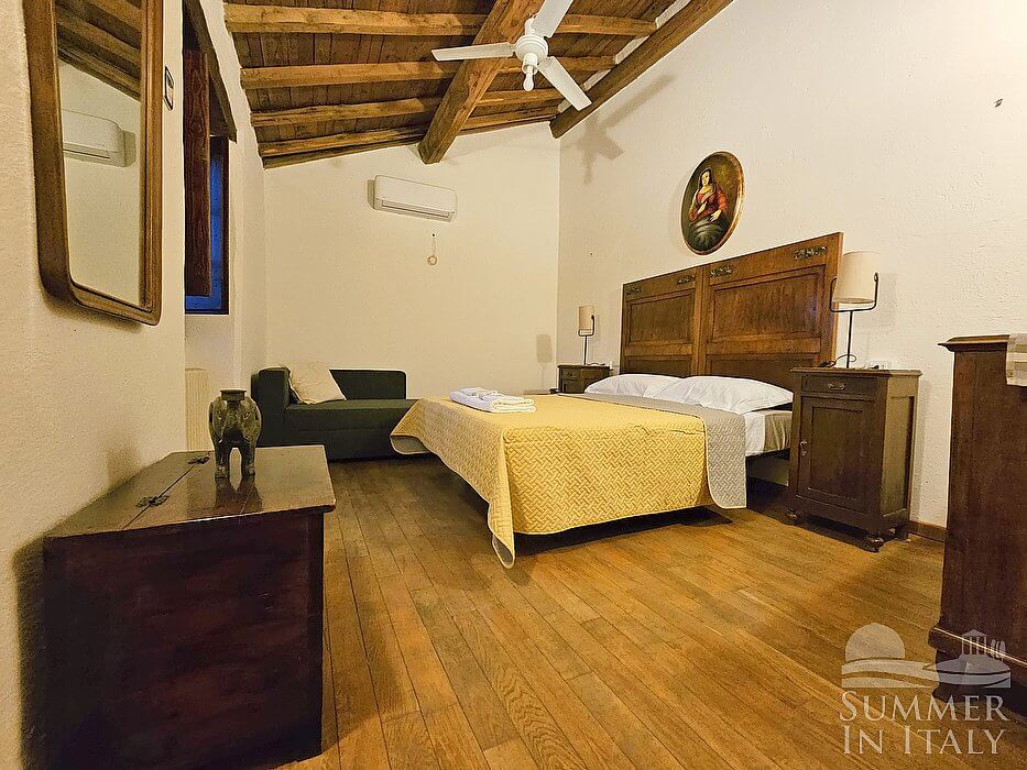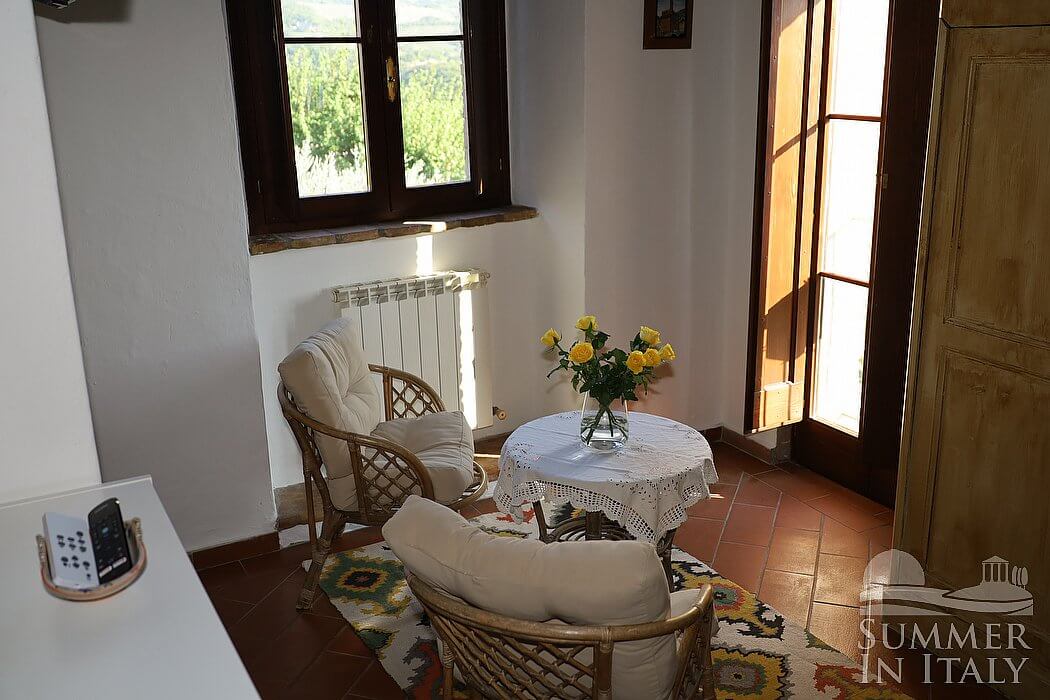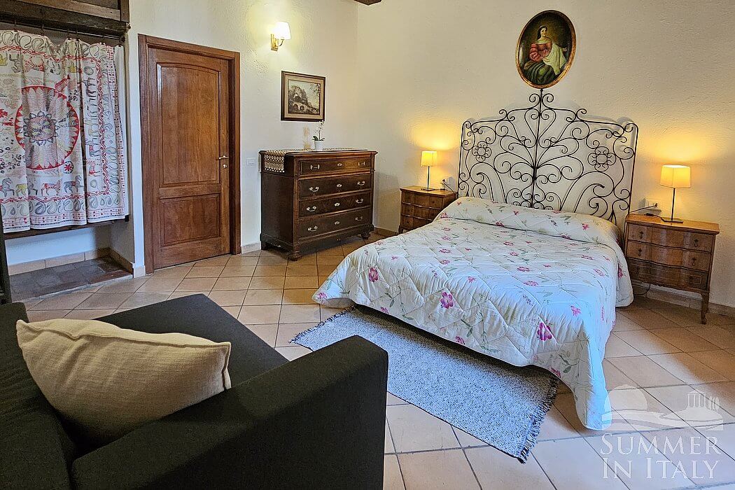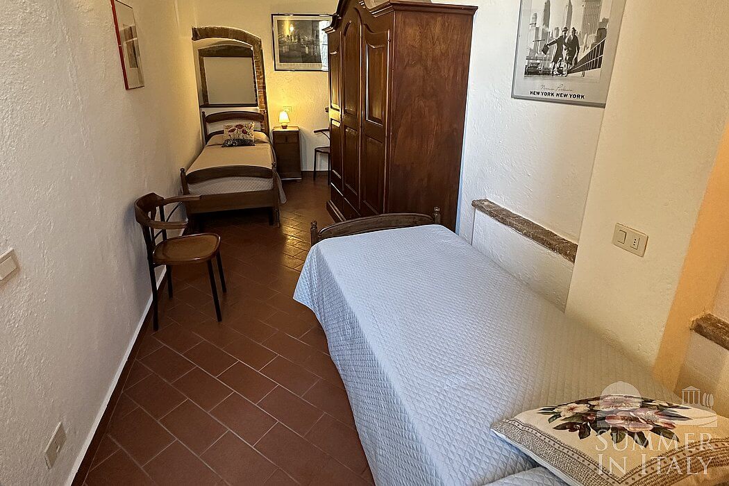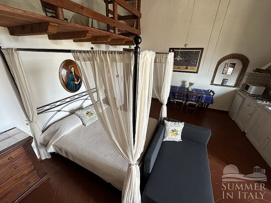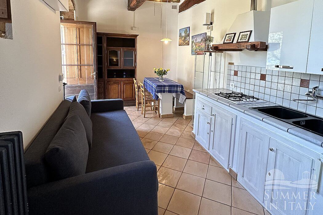 You will be able to enter the sixth living room through an access area. The floor is paved with terracotta tiles. The ceiling has characteristic exposed wood beams and terracotta tiles. The furnishings are warm and welcoming. Here you will find a matrimonial bed (160 cm/63 inches, wider than a queen-size bed), as well as two armchairs and a divan bed for one guest. In the living room you will also find a cooking area. The kitchenette is equipped with a four-burner gas cooker, a small refrigerator without freezer, a microwave oven, an Italian-style coffee-maker and a kettle. The dining table can accommodate four guests. In this room you will find a television (local channels). The room has two windows, as well as a Juliet balcony. It is equipped with an air conditioning/heating unit. Here you will also find a ceiling fan.