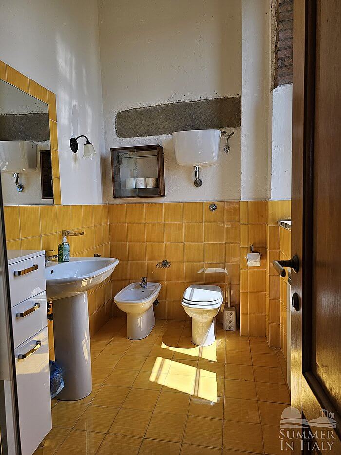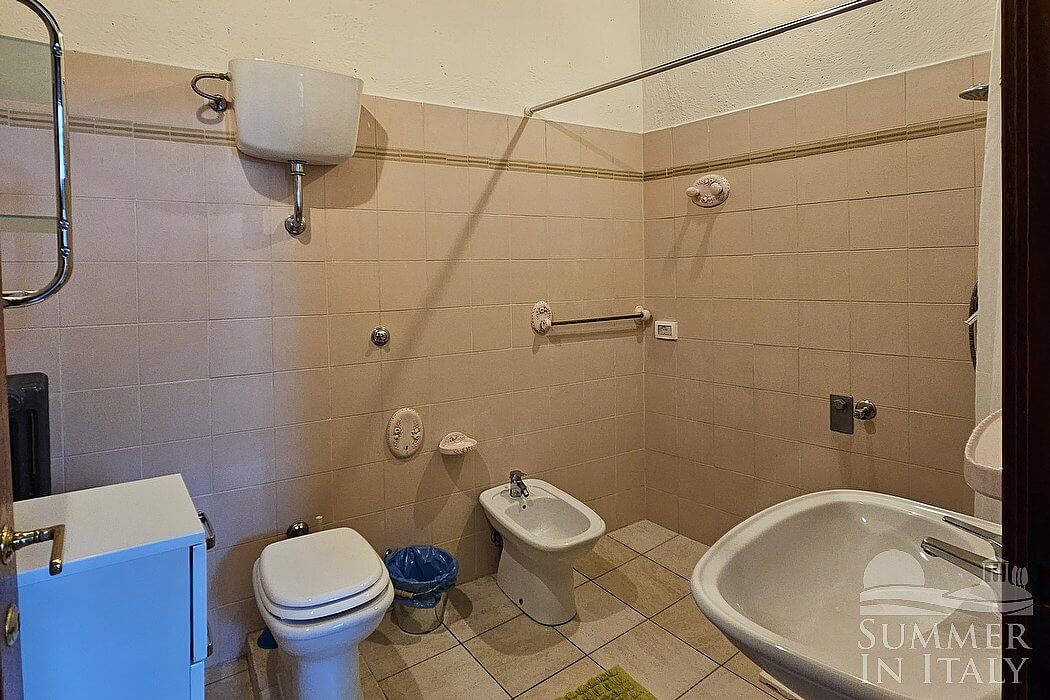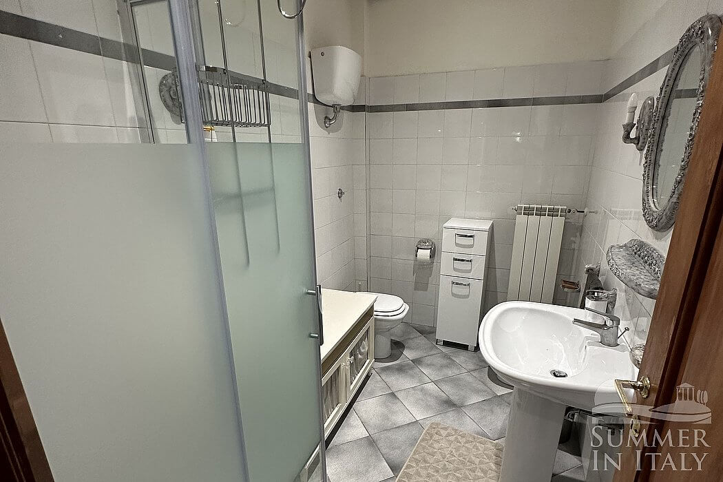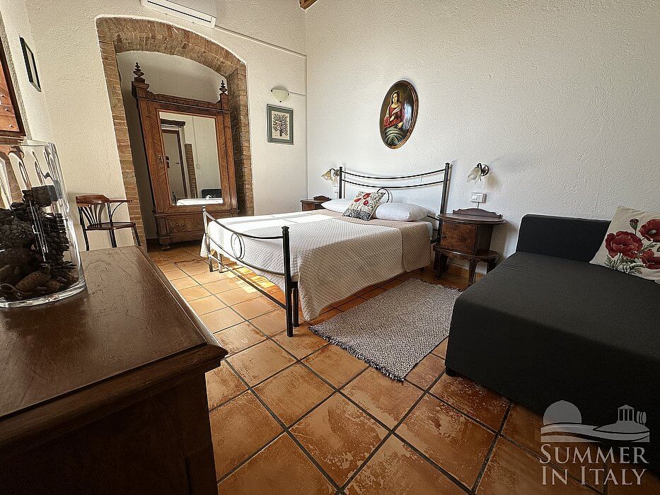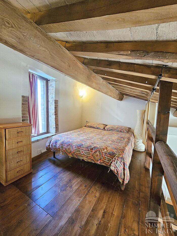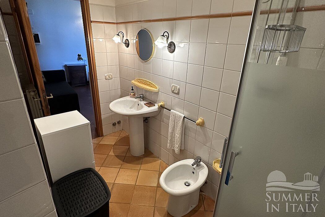 You will be able to enter the sixth living room through an access area. The floor is paved with terracotta tiles. The ceiling has characteristic exposed wood beams and terracotta tiles. The furnishings are warm and welcoming. Here you will find a matrimonial bed (160 cm/63 inches, wider than a queen-size bed), as well as two armchairs and a divan bed for one guest. In the living room you will also find a cooking area. The kitchenette is equipped with a four-burner gas cooker, a small refrigerator without freezer, a microwave oven, an Italian-style coffee-maker and a kettle. The dining table can accommodate four guests. In this room you will find a television (local channels). The room has two windows, as well as a Juliet balcony. It is equipped with an air conditioning/heating unit. Here you will also find a ceiling fan.