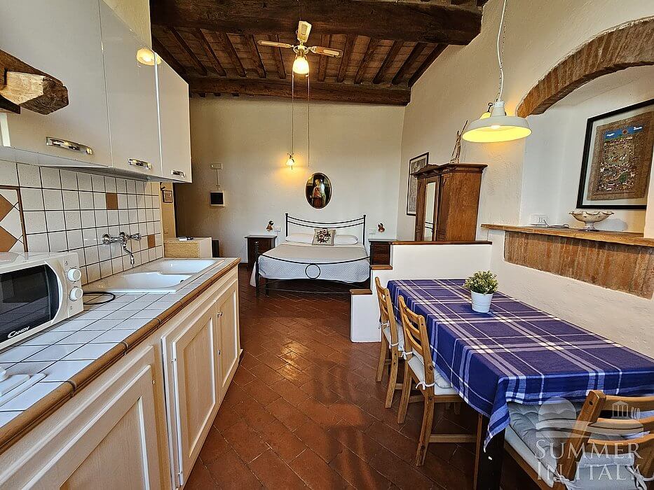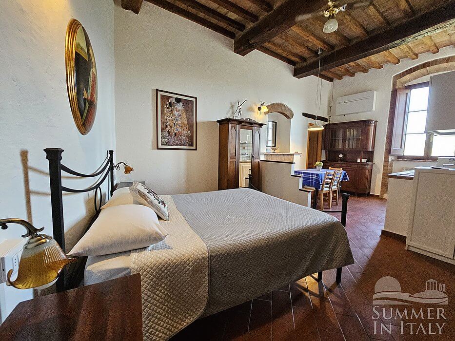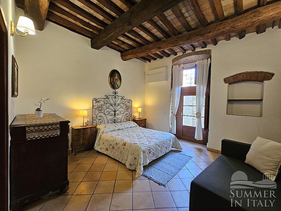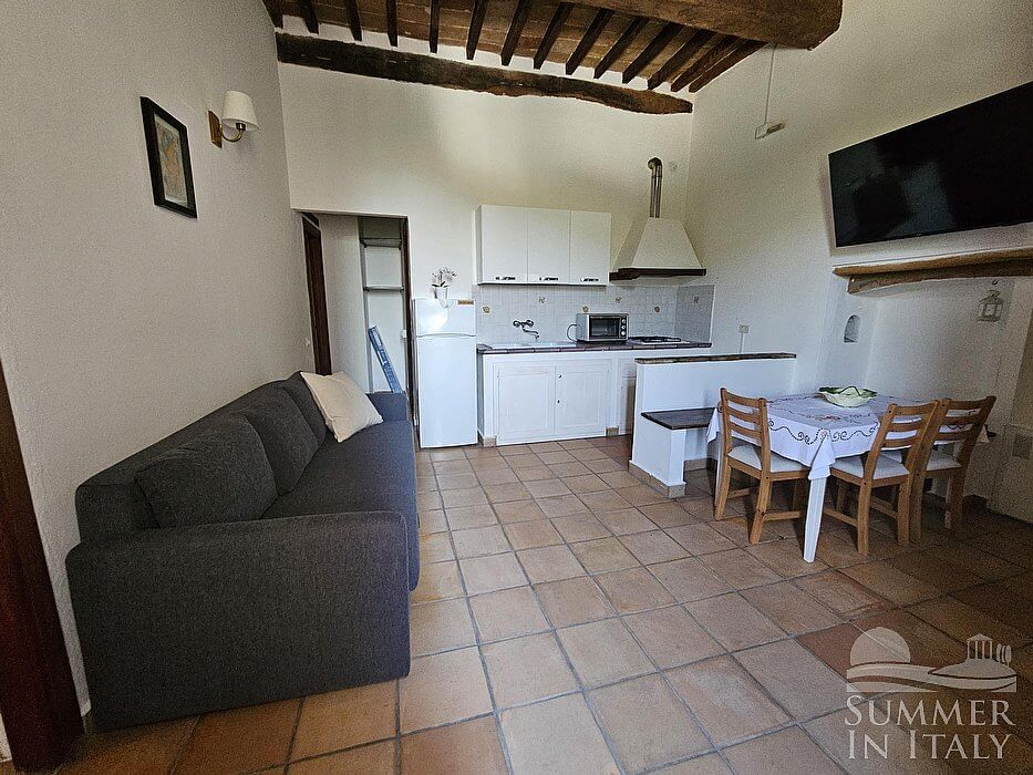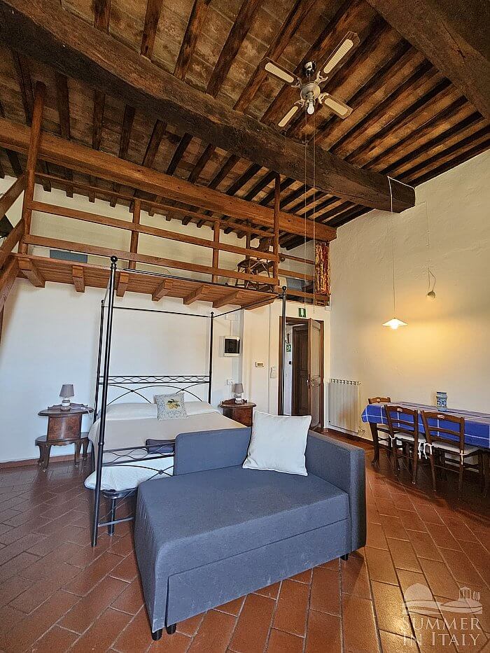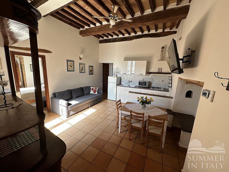 You will be able to enter the fifth living room through an access area. The floor is paved with terracotta tiles. The ceiling has characteristic exposed wood beams and terracotta tiles. The furnishings are warm and welcoming. Here you will find a matrimonial bed (160 cm/63 inches, wider than a queen-size bed), as well as a divan bed for one guest. In the living room you will also find a cooking area. The kitchenette is equipped with a four-burner gas cooker, a small refrigerator without freezer, a microwave oven, an Italian-style coffee-maker and a kettle. The dining table can accommodate four guests. In this room you will find a television (local channels). The room has a window. It is equipped with an air conditioning/heating unit. Here you will also find a ceiling fan.