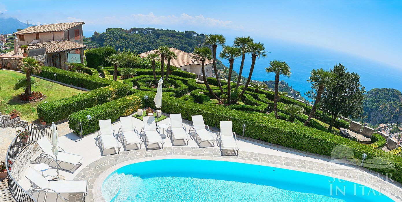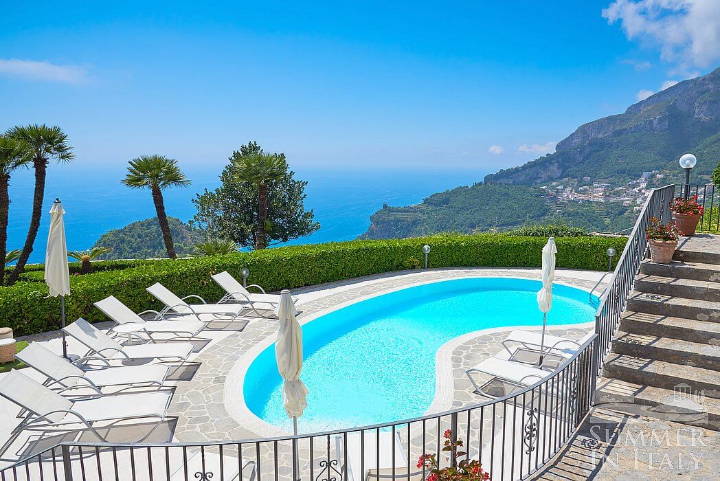 Villa Mabella is a bright and elegant three-story historical villa located on a hillside, facing the sea. It sleeps ten people. From Villa Mabella you will enjoy a charming view of Ravello and of the sea at a distance. Villa Mabella is 200 square meters (2150 square feet). It features a private swimming pool, a nice private terrace with a view of the sea, a private garden, air conditioning (please read description below to check in which rooms the units are installed), winter heating and WI-FI Internet access.