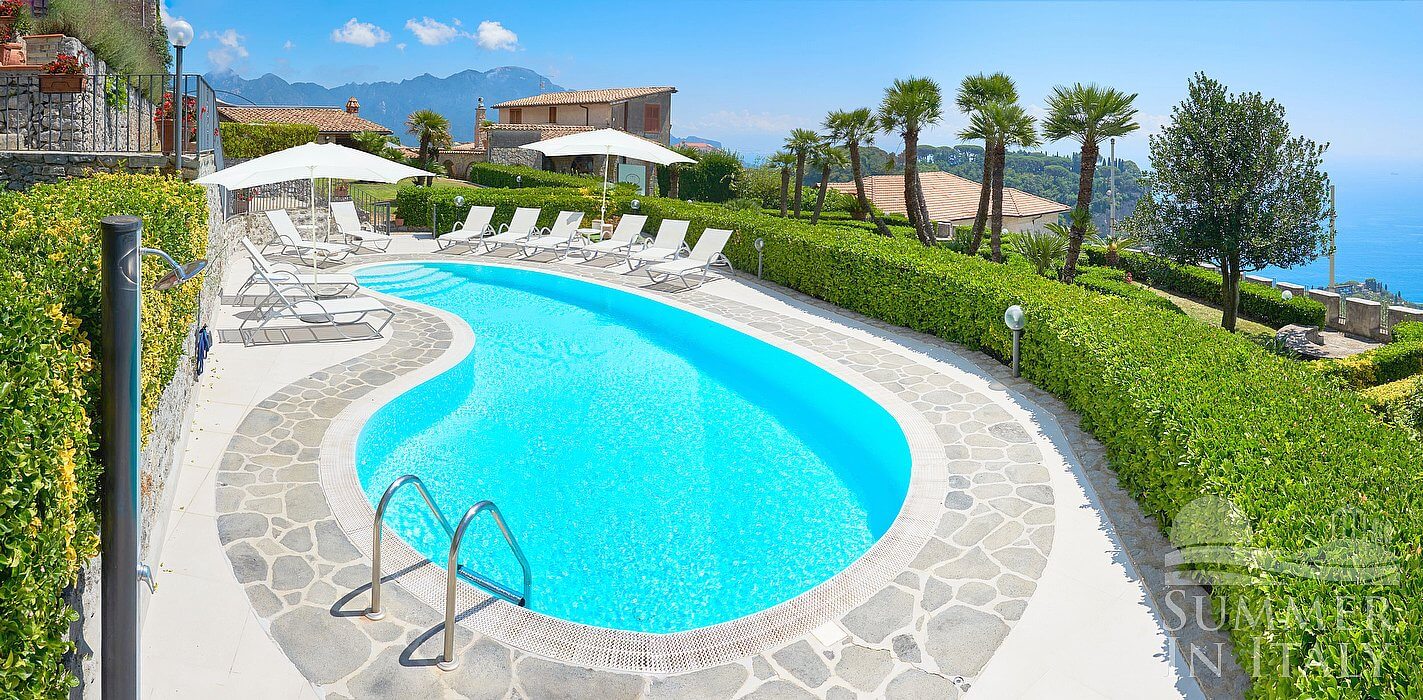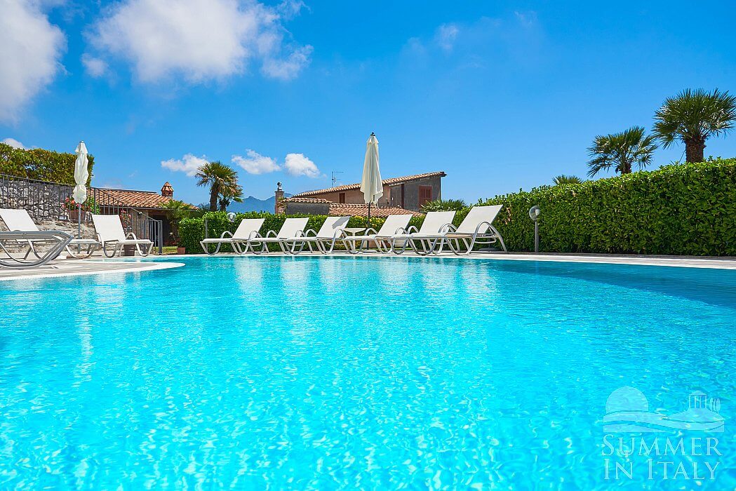 The swimming pool is 5 meters (16 feet) large by 10 meters (33 feet) long, 2.5 meters (8 feet) deep. The swimming pool has a sinuous shape. The area is equipped with sun umbrellas, sun loungers and an external shower. From the swimming pool you will enjoy a fascinating view of the coast and of the sea at a distance. The pool is open from the beginning of April until the end of October.