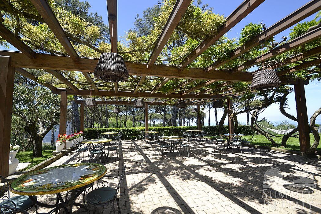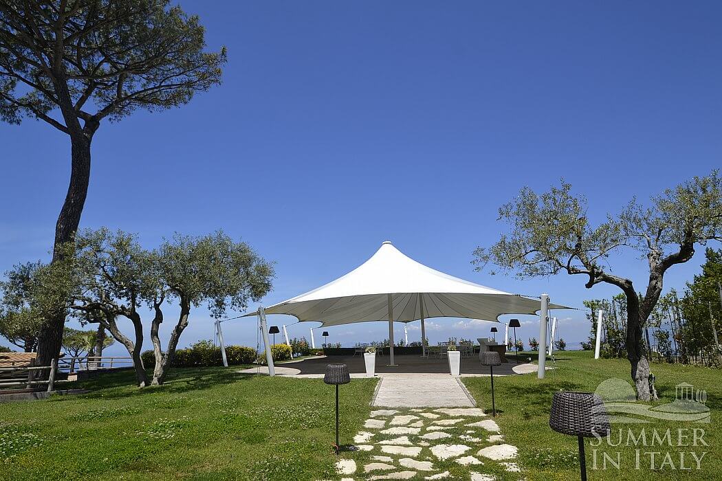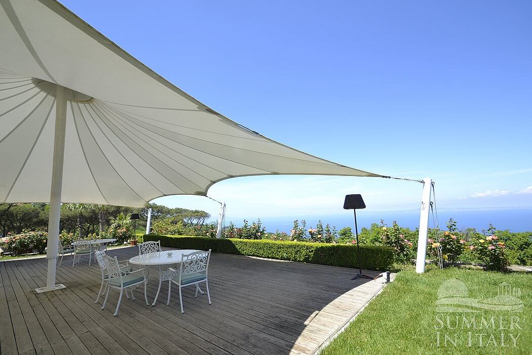 The second terrace is 30 square meters (320 square feet) large. It features an above-ground heated jacuzzi pool with hydromassage with six seats. It is partly shaded by an elegant gazebo. It is equipped with tables, chairs and sun loungers. From the terrace you will enjoy a spectacular view of the sea.
