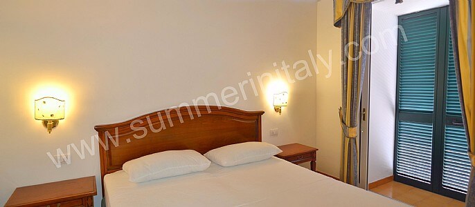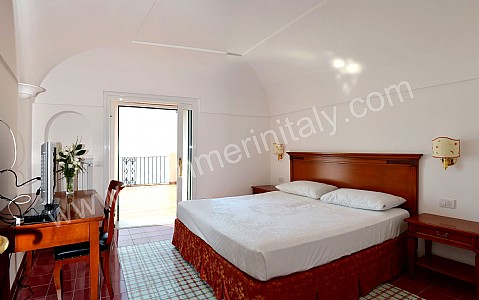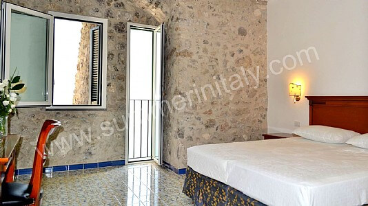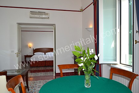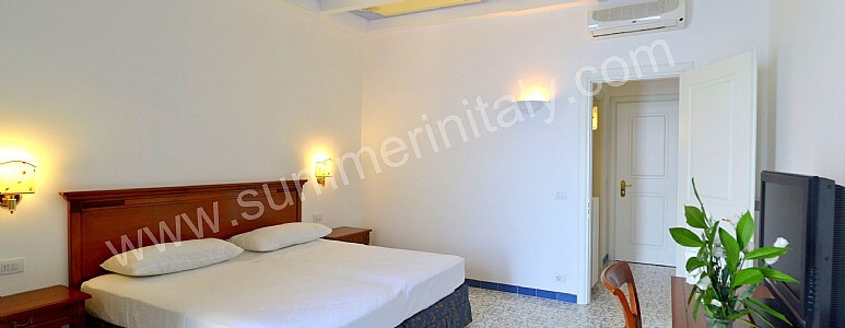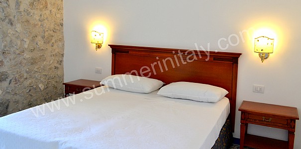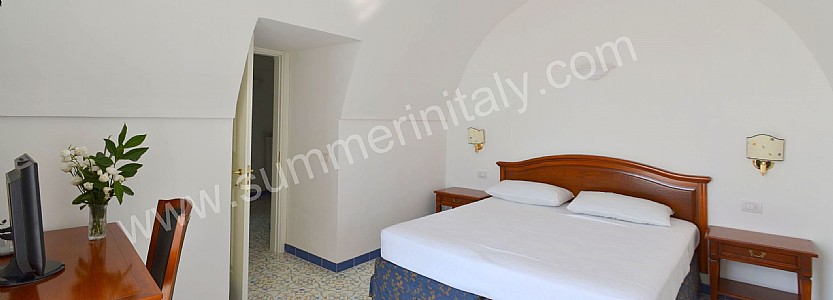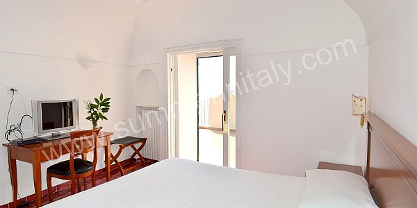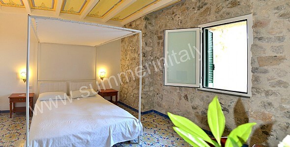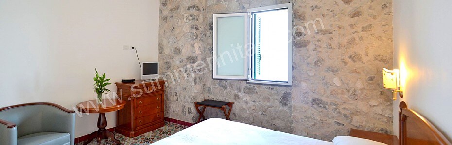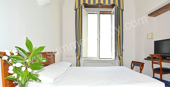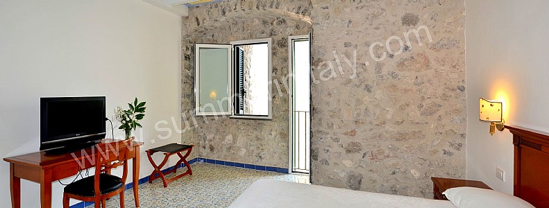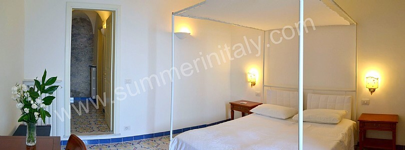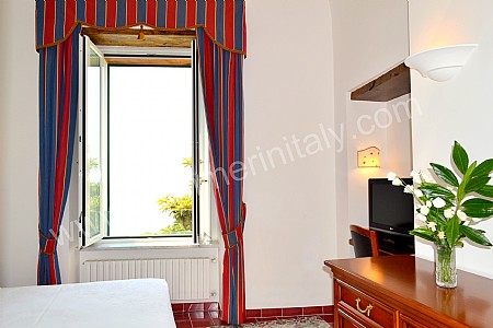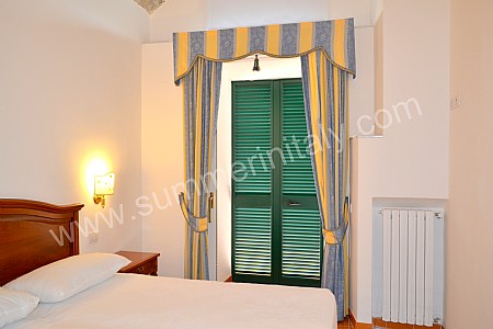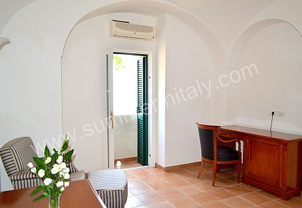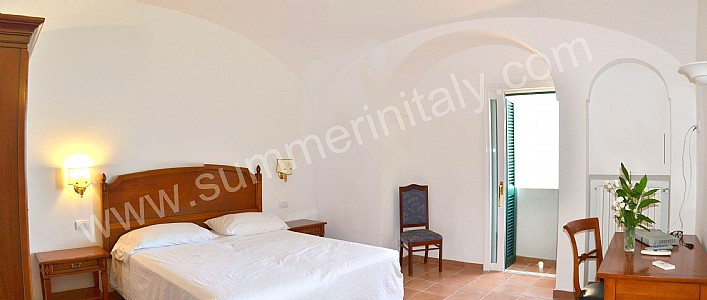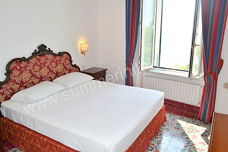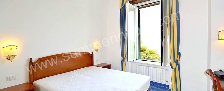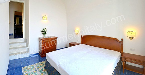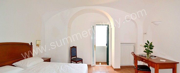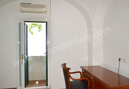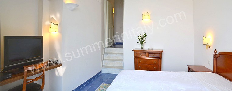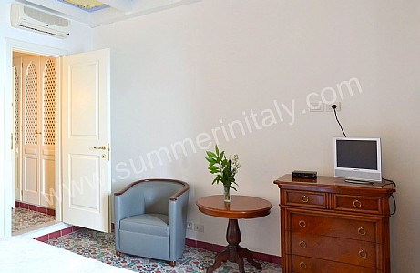 You will be able to enter the tenth bedroom from the corridor. The bedroom has a matrimonial bed (160 cm/63 inches, wider than a queen-size bed). The furnishings include a desk. In this room you will find a flat-screen satellite television (local channels). From the bedroom you will be able to enter the garden with a view of the sea and of the beach of Atrani through a double-glazed French door. The bedroom is equipped with an air conditioning/heating unit, and you will also find a safe. This bedroom has an en-suite bathroom, equipped with a washbasin, a toilet, a fully enclosed shower and a hairdryer.