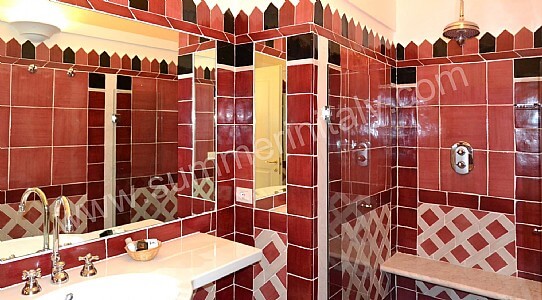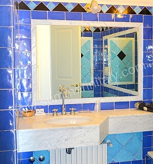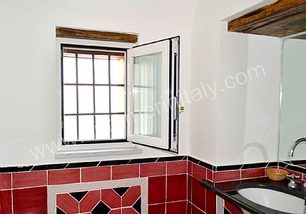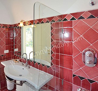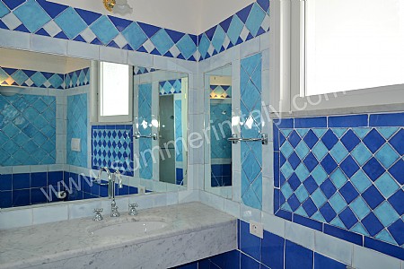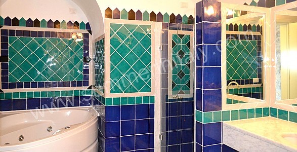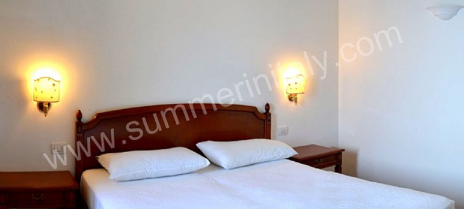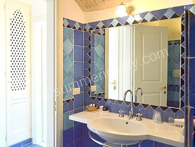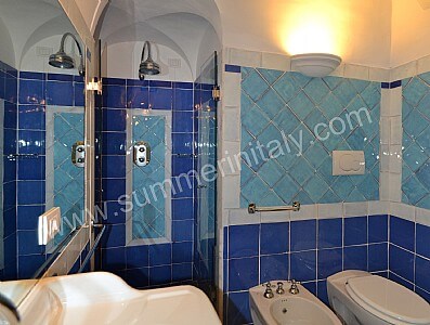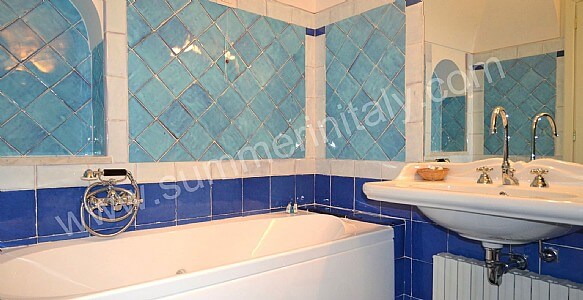You will be able to enter the sixth bedroom from the corridor. The bedroom has a matrimonial bed (160 cm/63 inches, wider than a queen-size bed). In this room you will find a flat-screen satellite television (local channels). The room has a double-glazed window with a view of the sea and of the coastline. The bedroom is equipped with an air conditioning/heating unit, and you will also find a safe. This bedroom has an en-suite bathroom, tiled with lucid handmade majolica tiles and equipped with a washbasin, a toilet, a bathtub with fixed shower head and a hairdryer.