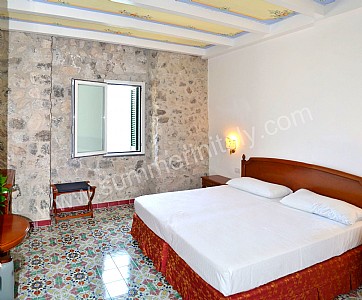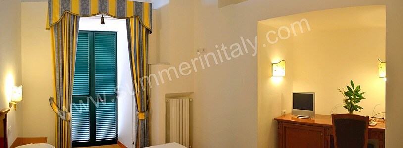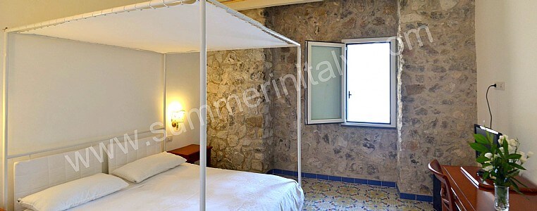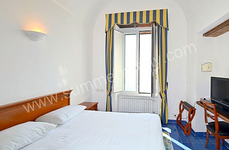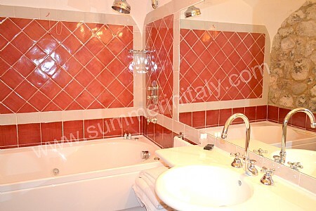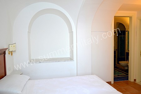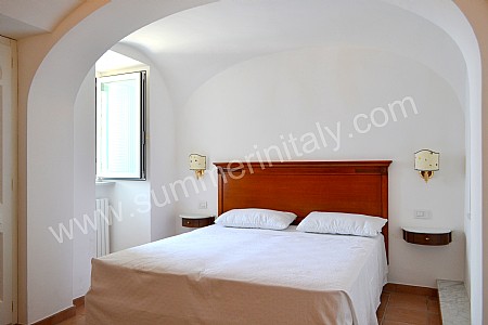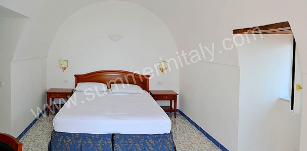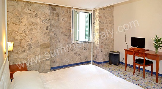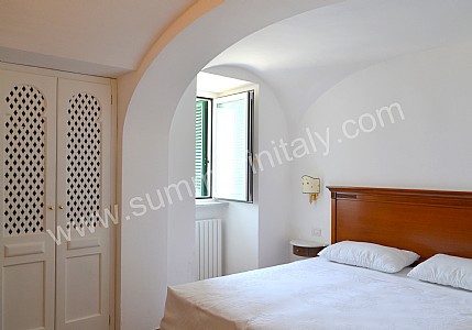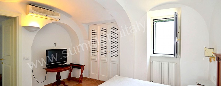 You will be able to enter the eighth bedroom from the corridor. The bedroom has a matrimonial bed (160 cm/63 inches, wider than a queen-size bed). The furnishings include a desk. In this room you will find a flat-screen satellite television (local channels). The room has a double-glazed window with a view of the sea and of Atrani. The bedroom is equipped with an air conditioning/heating unit, and you will also find a safe and a mini refrigerator. This bedroom has an en-suite bathroom, spacious and equipped with a washbasin, a toilet, a fully enclosed shower, a jacuzzi bathtub and a hairdryer.