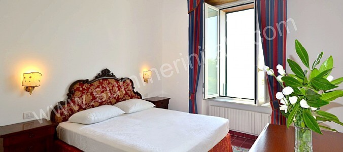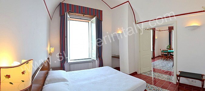 You will be able to enter the seventh bedroom from the corridor. The bedroom has a matrimonial bed (160 cm/63 inches, wider than a queen-size bed). The furnishings include an armchair. In this room you will find a flat-screen satellite television (local channels). The room has a double-glazed window with a view of the sea and of Atrani. The bedroom is equipped with an air conditioning/heating unit, and you will also find a safe. This bedroom has an en-suite bathroom, equipped with a washbasin, a toilet, a bathtub with fixed shower head and a hairdryer.