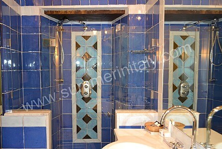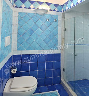 You will be able to enter the fifth bedroom from the corridor. The bedroom has a matrimonial bed (160 cm/63 inches, wider than a queen-size bed). In this room you will find a flat-screen satellite television (local channels). The room has a double-glazed large panoramic window with a view of the sea. The bedroom is equipped with an air conditioning/heating unit, and you will also find a safe. This bedroom has an en-suite bathroom, equipped with a washbasin, a toilet, a fully enclosed shower and a hairdryer.