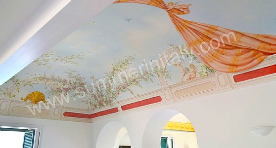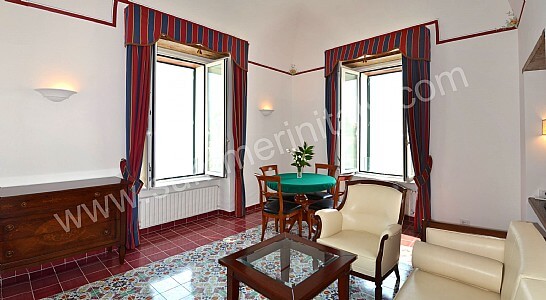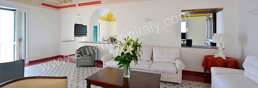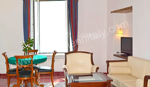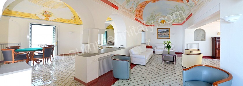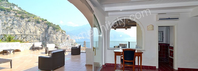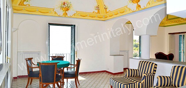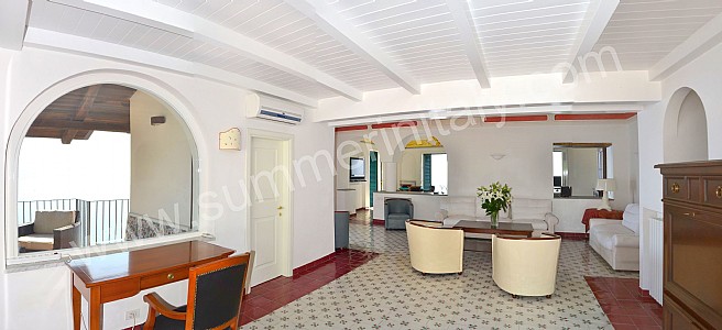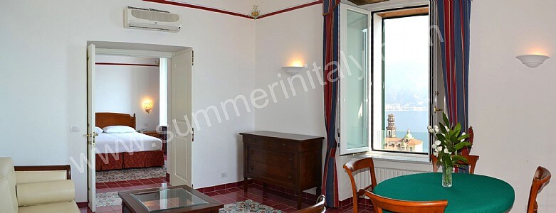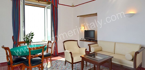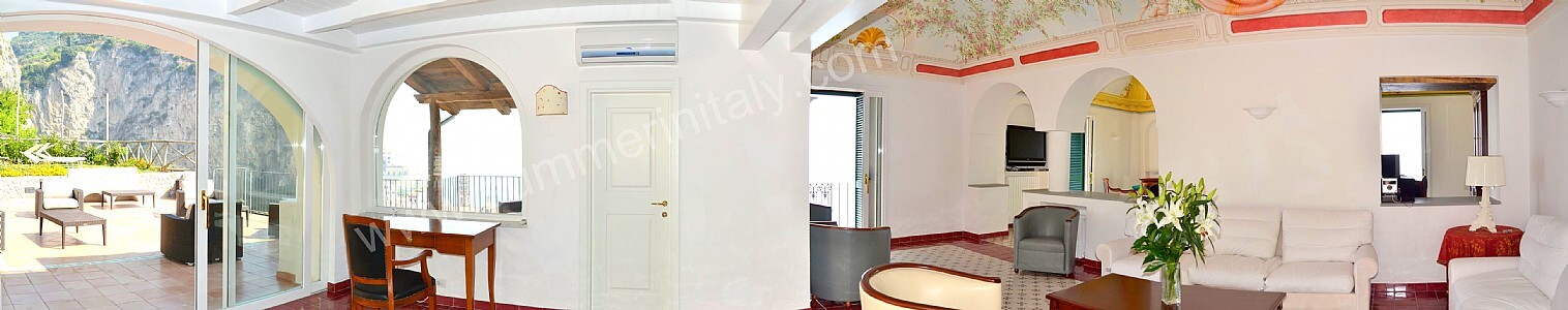 The living room is paved with tiles with handmade decoration, in the characteristic style of the Amalfi Coast. The ceiling is vaulted and frescoed. The furnishings are elegant and refined, and include some antique pieces. The furnishings include sofas, armchairs and a desk. The dining table can accommodate four guests. In this room you will find a large flat-screen satellite television (local channels). From the living room you will be able to enter the first terrace with a view of the sea and of the beach of Atrani through a double-glazed French door. The room has four double-glazed Juliet balconies with a view of the sea and of the coastline. It is equipped with an air conditioning/heating unit.