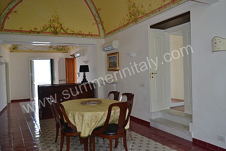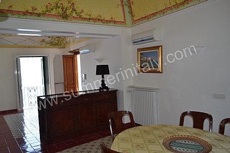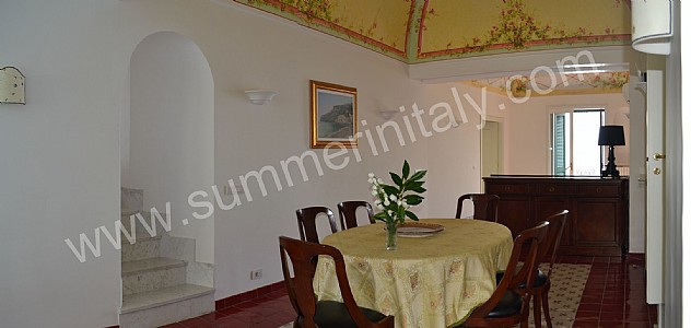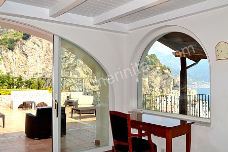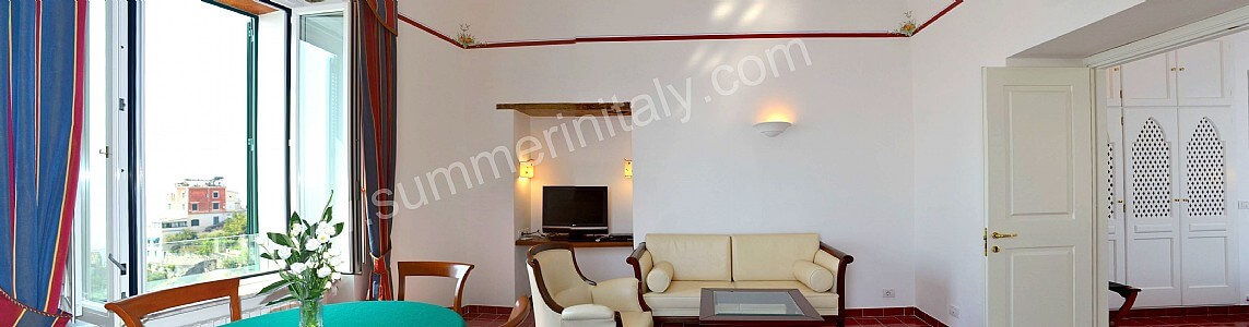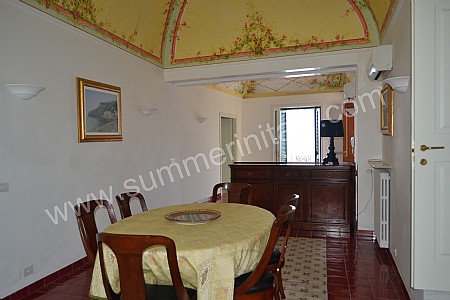 The furnishings of the dining room are warm and elegant, and include some antique pieces. The dining table can accommodate six guests. From the dining room you will be able to enter the small balcony with a view of the sea and of the coast of Amalfi through a double-glazed French door. The room has a double-glazed large panoramic arched window with a view of the sea and of the terrace, and is equipped with an air conditioning/heating unit.