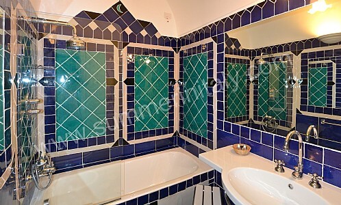 You will be able to enter the first bedroom from the corridor. The bedroom has a matrimonial bed (160 cm/63 inches, wider than a queen-size bed). The furnishings include a desk. In this room you will find a flat-screen satellite television (local channels). From the bedroom you will be able to enter the second terrace with a view of the sea and of the beach of Atrani through a French door. The bedroom is equipped with an air conditioning/heating unit, and you will also find a safe and a mini refrigerator. This bedroom has an en-suite bathroom, tiled with lucid handmade majolica tiles and equipped with a washbasin, a toilet, a bathtub with fixed shower head and a hairdryer.