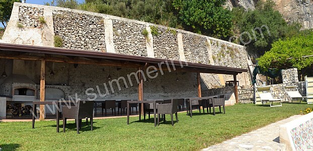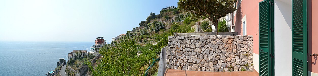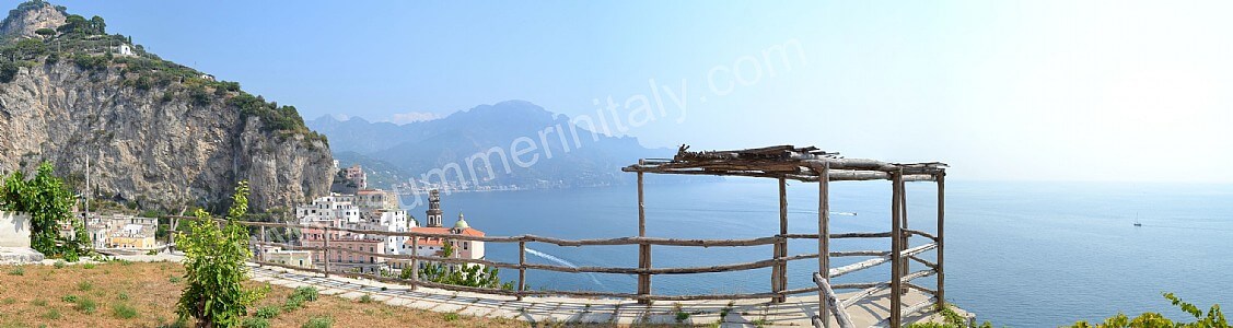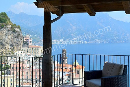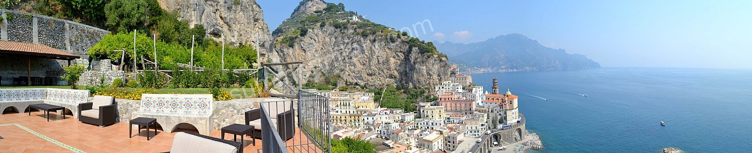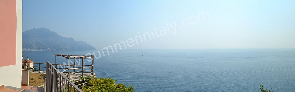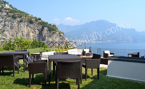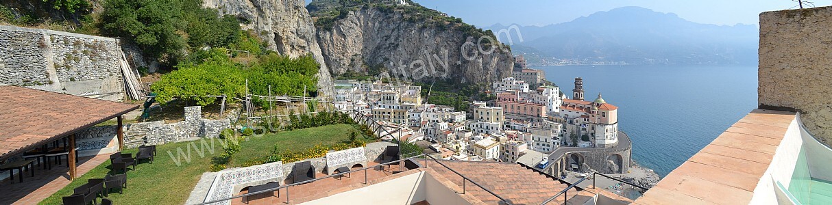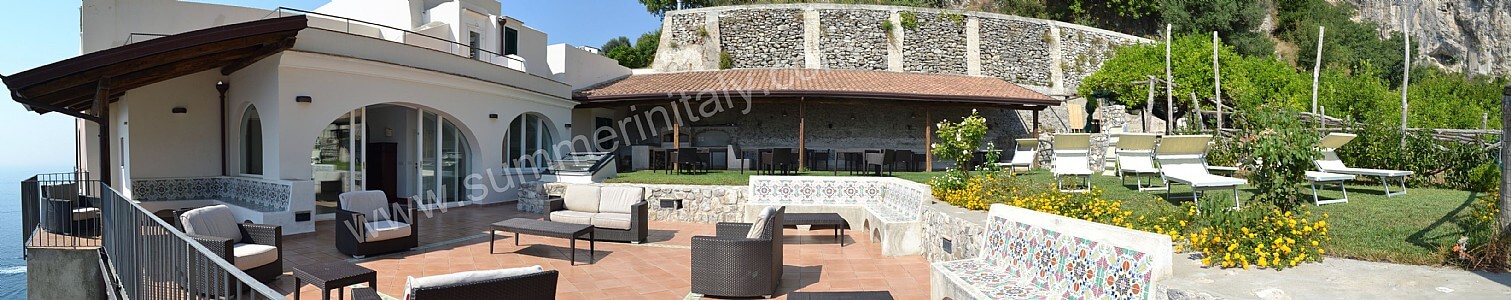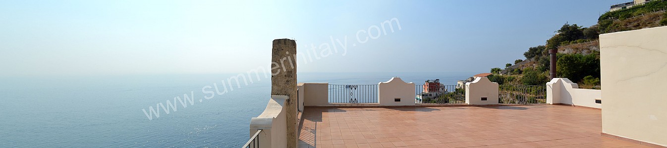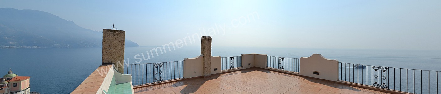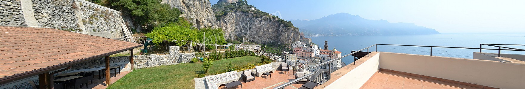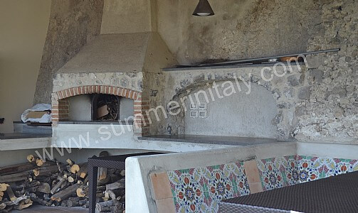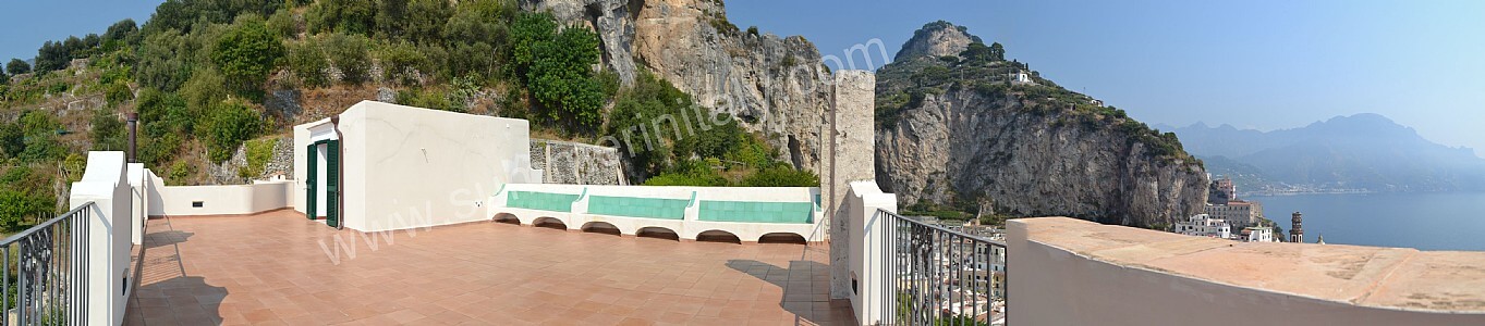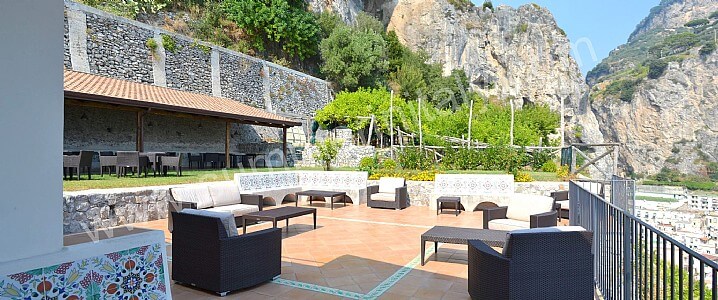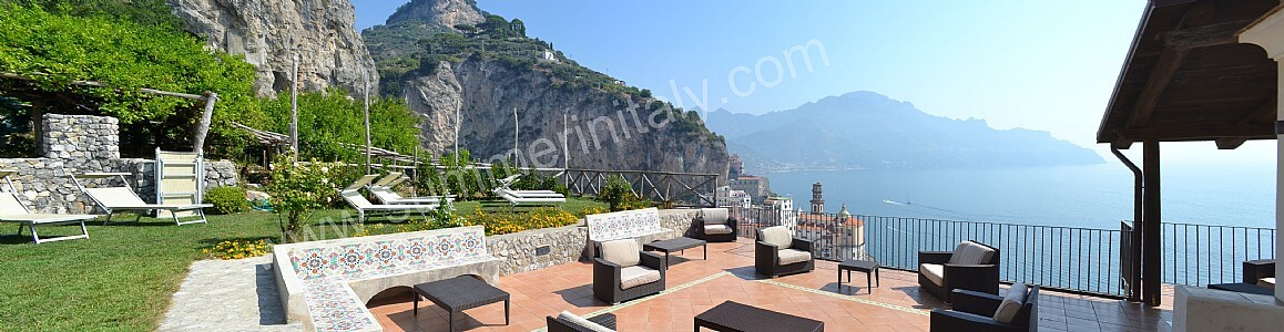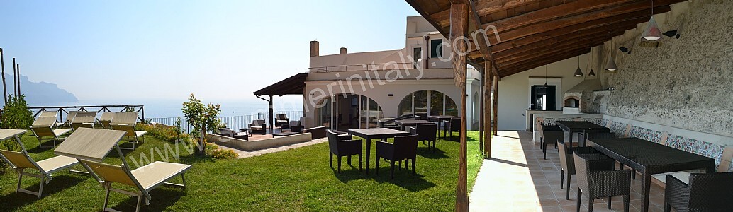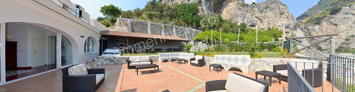 The first terrace is 350 square meters (3770 square feet) large. It is partly shaded by an elegant wood roof. It is equipped with two wickerwork sofas, armchairs and masonry benches, as well as with tables, chairs and sun loungers. Here you will also find a wood-fired pizza oven. From the terrace you will enjoy a breathtaking view of the sea and of Atrani.