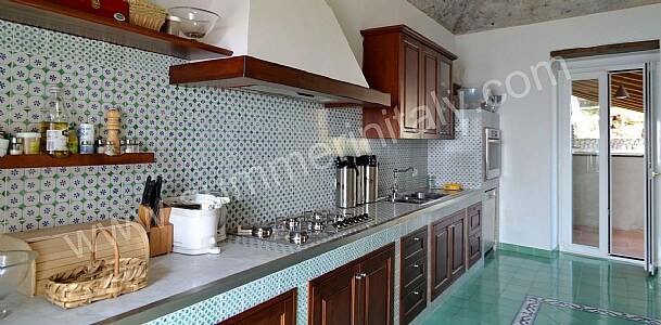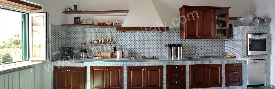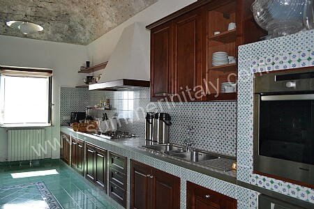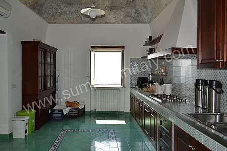 You will be able to enter the kitchen from the dining room. It is equipped with a six-burner gas cooker, an electric oven, a refrigerator with freezer, a dishwasher, an Italian-style coffee-maker and other small appliances. Here you will also find a washing machine. From the kitchen a French door will take you to the first terrace with a view of the sea. The room has a window with a view of the sea and of the coastline.