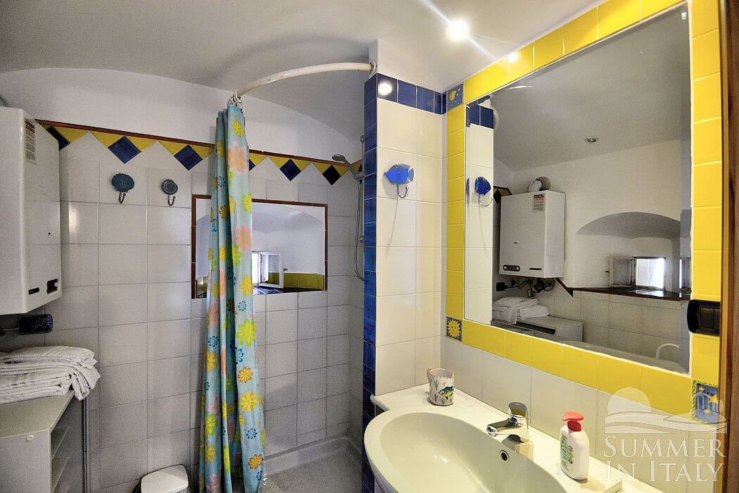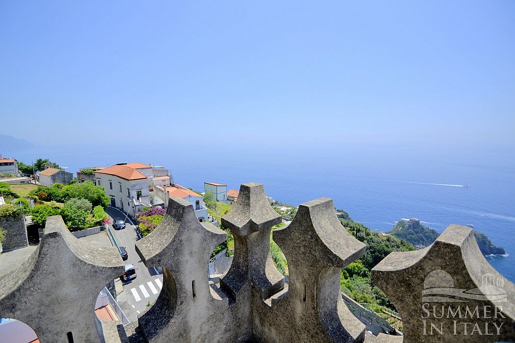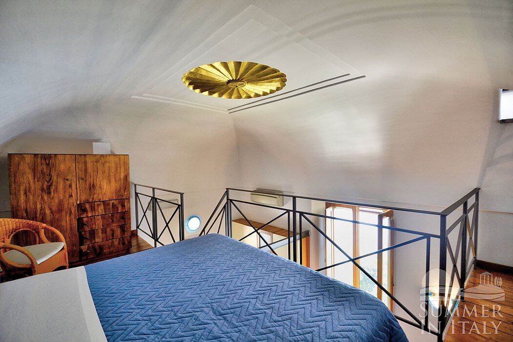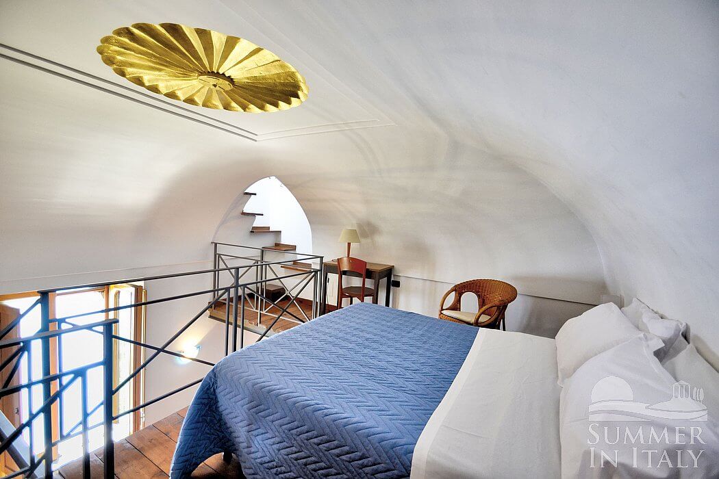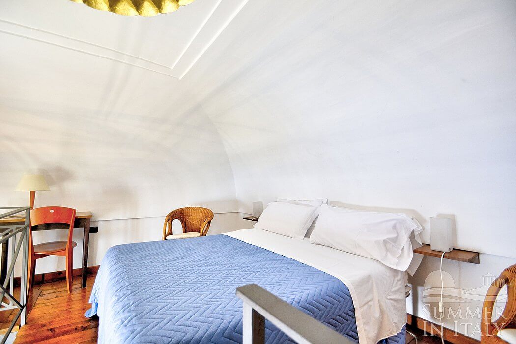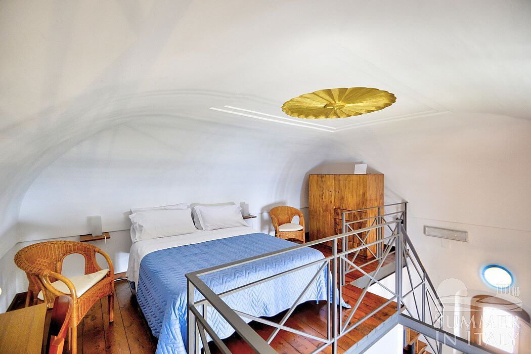 From the garden an outdoor staircase will allow you to get into the tower. Inside you will have unique interiors, with a really high barrel ceiling. A tall arched window illuminates the room: through this window you will see the Cape of Conca dei Marini from above, which is a subtle green promontory surmounted by an impressive watch tower. It is a view if exceptional beauty which will please your eyes throughout your whole vacation! Those holes which were once ancient embrasures through which arquebuses were aimed at assaulters are now small windows or niches where decorative pieces of local artifact are displayed.