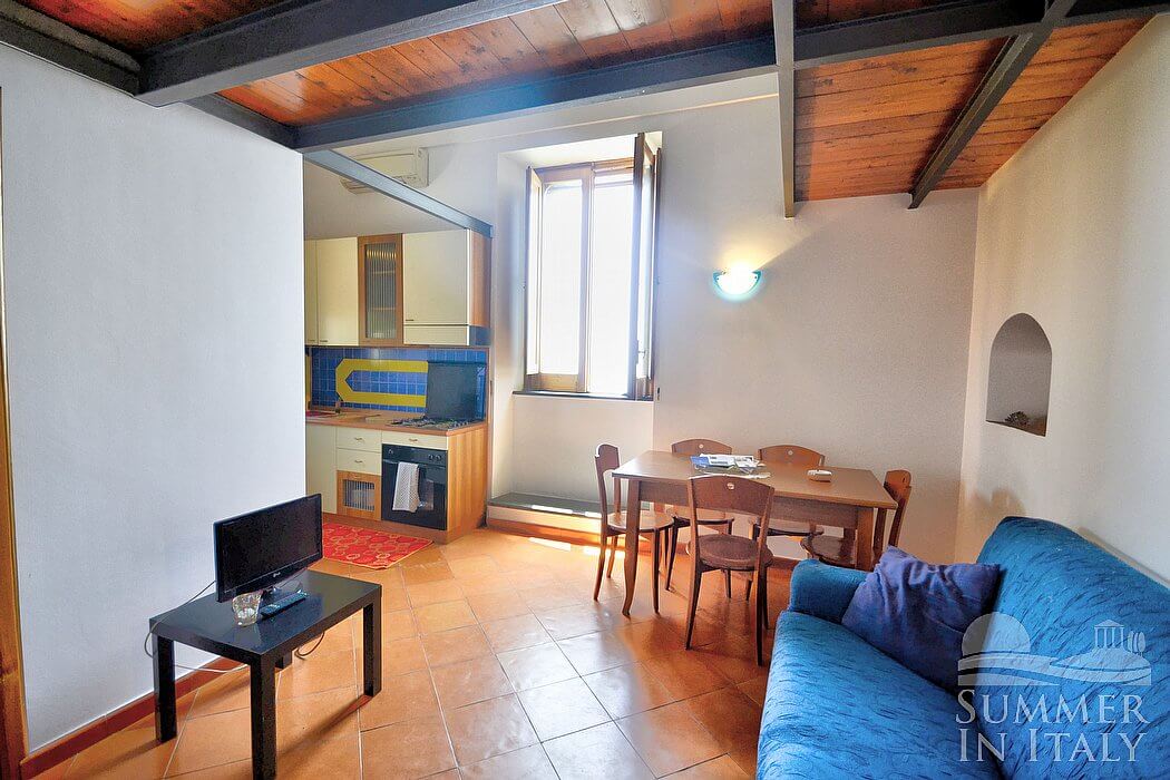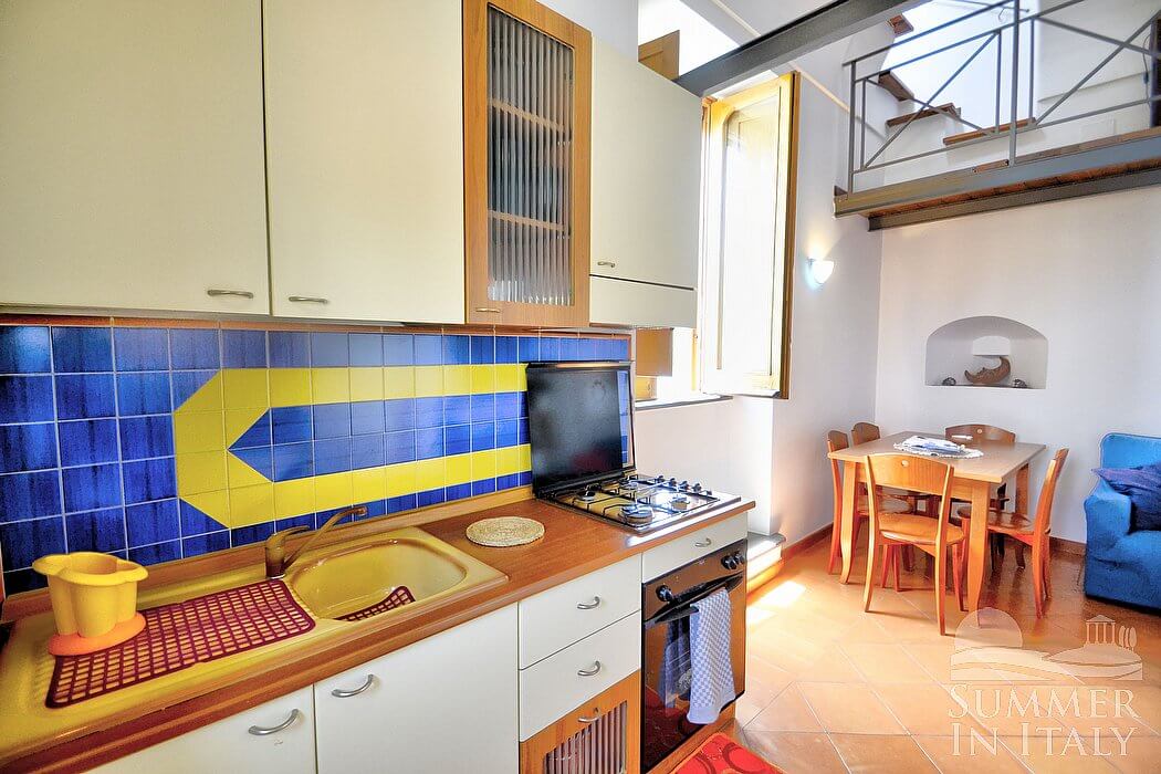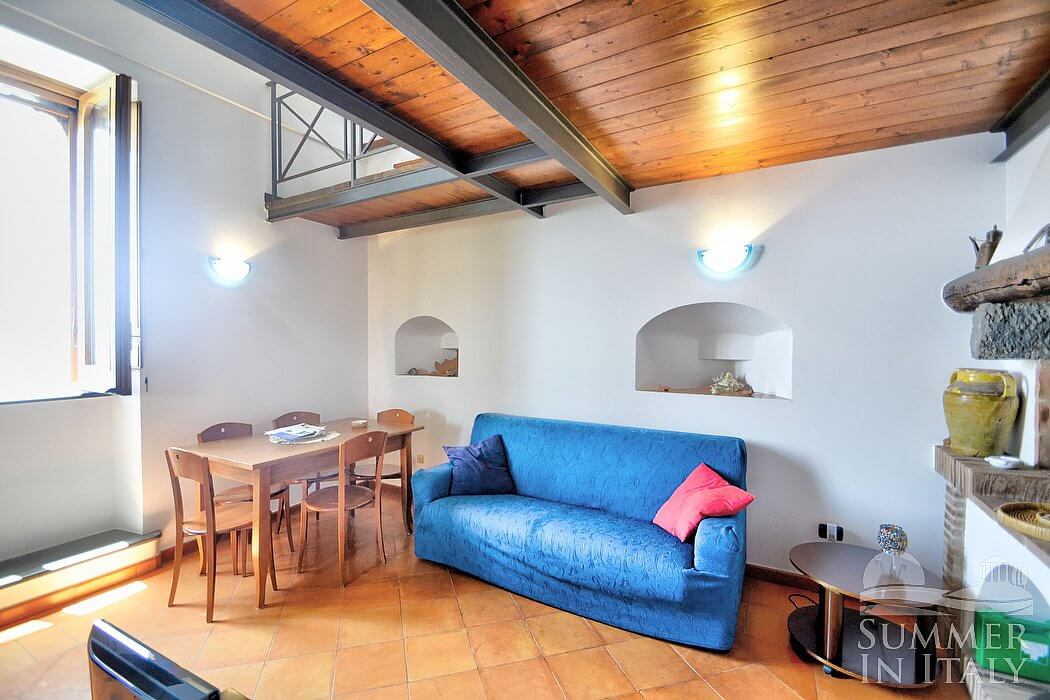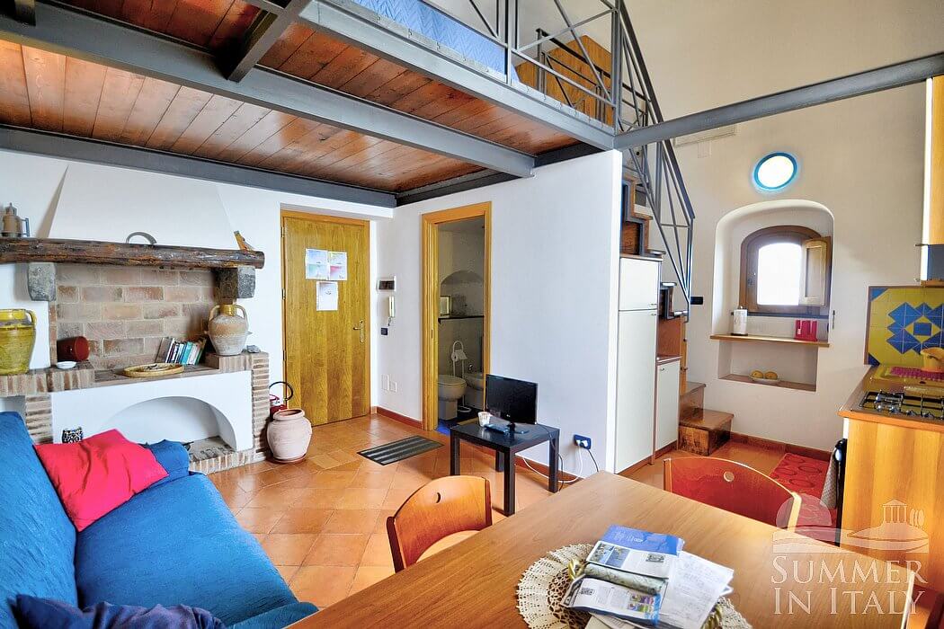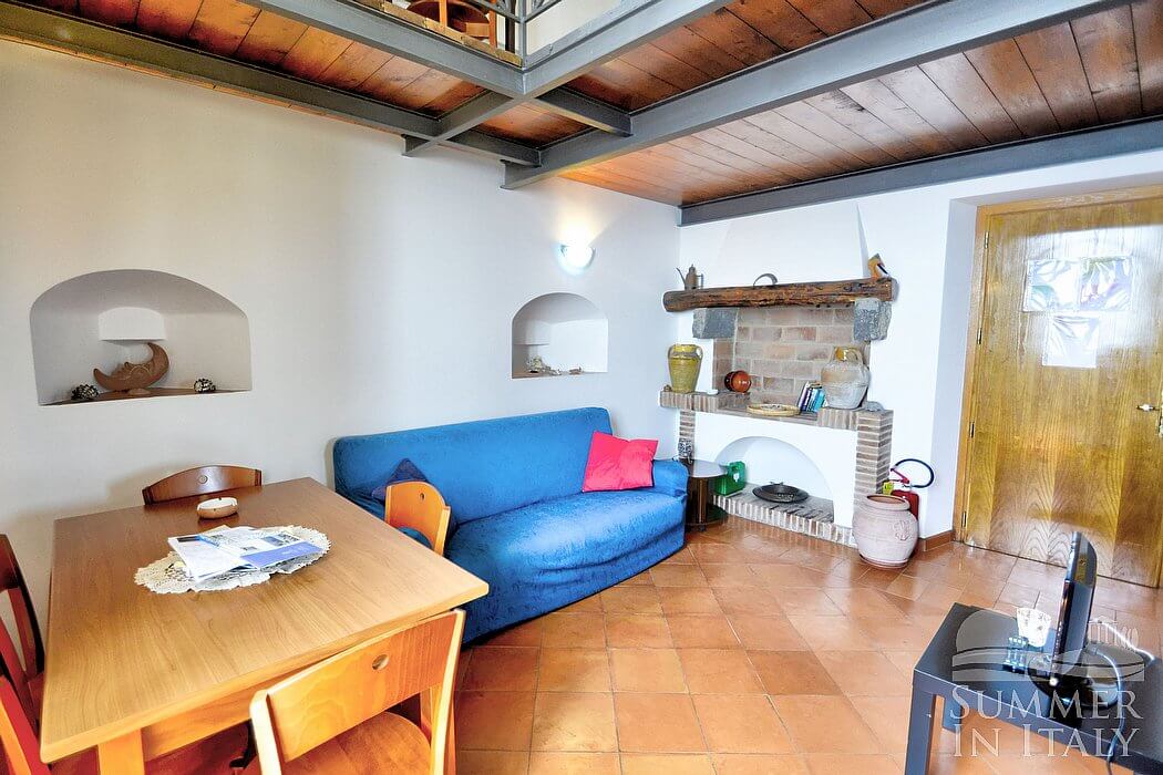 The ceiling of the living room is high and vaulted. The furnishings are cozy and comfortable. The furnishings include a sofa. There is a fireplace, for decorative purposes only. In the living room you will also find a cooking area. The kitchenette is equipped with a four-burner gas cooker, an electric oven, a refrigerator with freezer and an Italian-style coffee-maker. The dining table can accommodate six guests. In this room you will find a television (local channels). The room has a high window with a view of the sea and of the coastline. It is equipped with an air conditioning/heating unit.