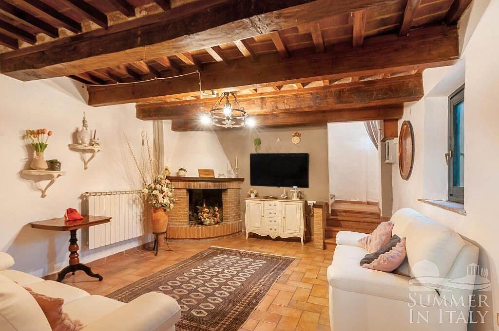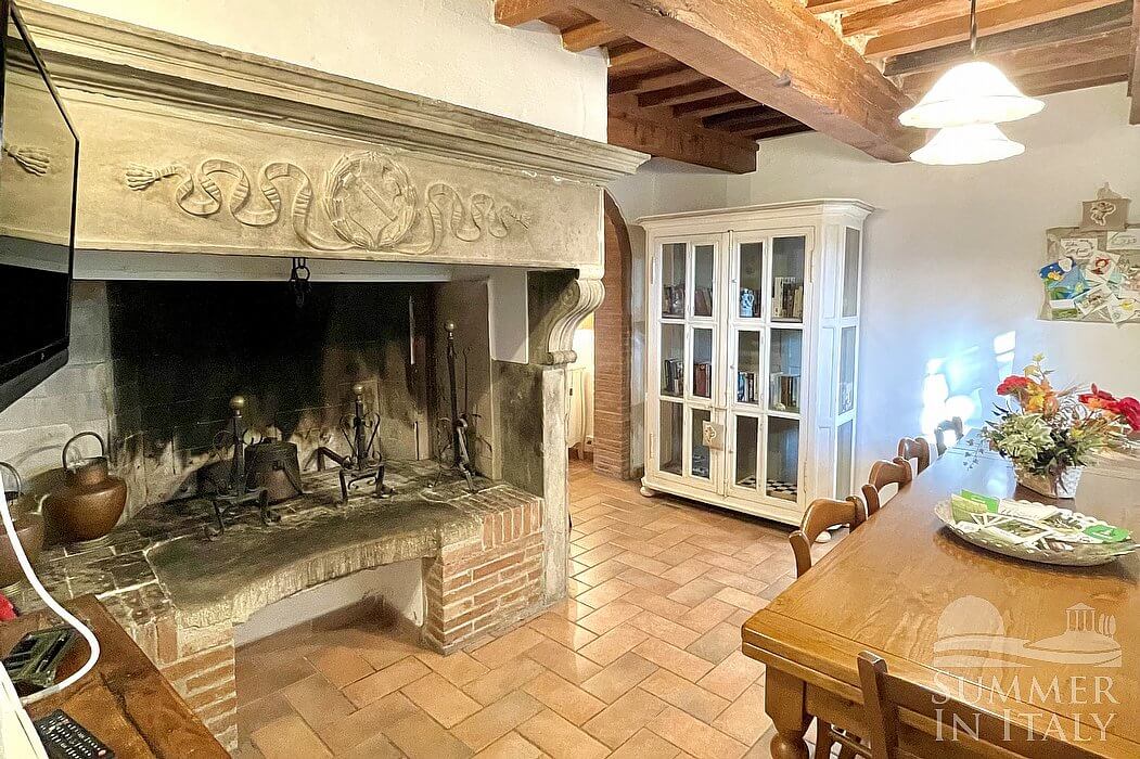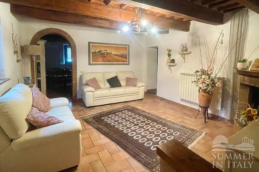 The living room is paved with terracotta tiles. The ceiling is sloped and has characteristic exposed wood beams and terracotta tiles. The furnishings are warm and welcoming, featuring a suspended chandelier, and include two sofas. There is a nice fireplace made of bricks, for decorative purposes only. In this room you will find a satellite television (local channels). The room has a window.