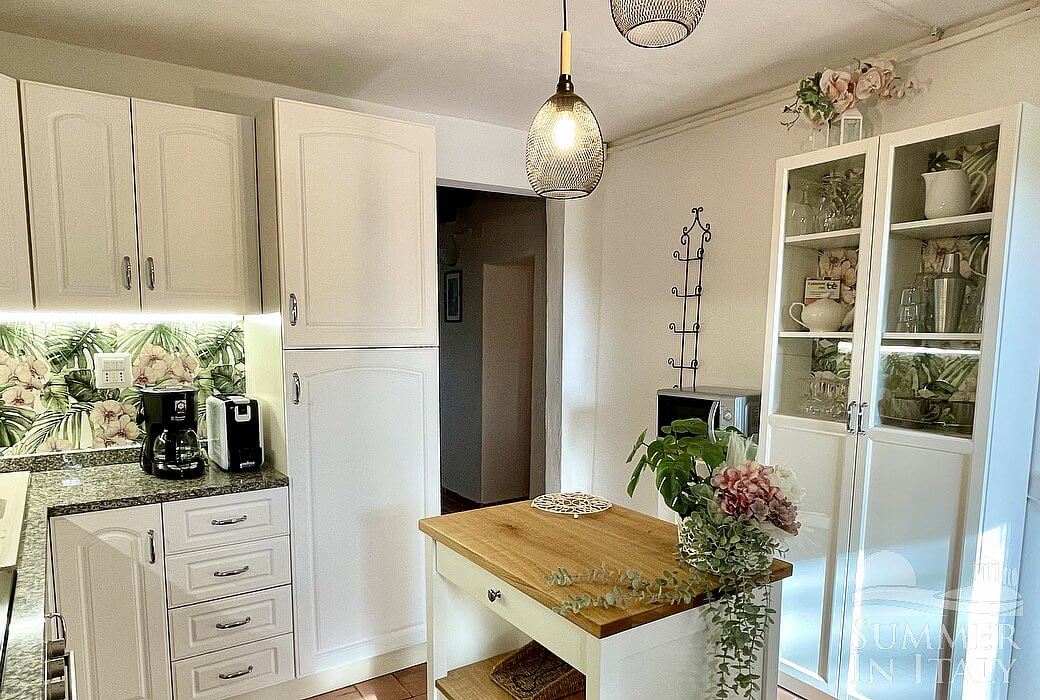 You will be able to enter the kitchen from the dining room. It is equipped with a four-burner gas cooker, an electric oven, a refrigerator with freezer, a dishwasher, a microwave oven, an Italian-style coffee-maker, an American-style coffee-maker and a kettle. From the kitchen a French door will take you to the second patio. The room also has a small window.
