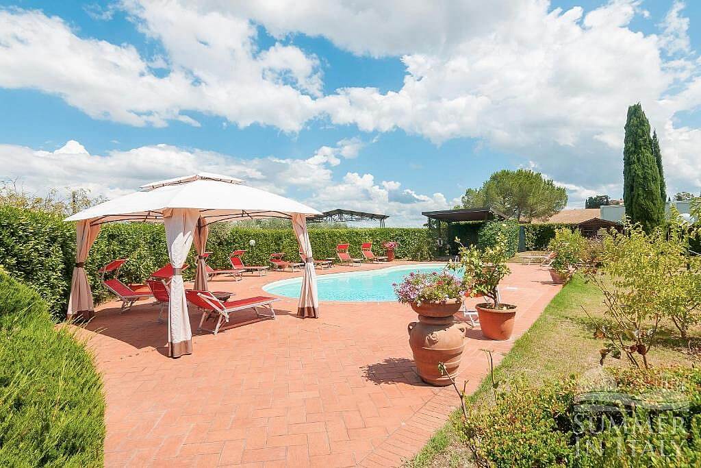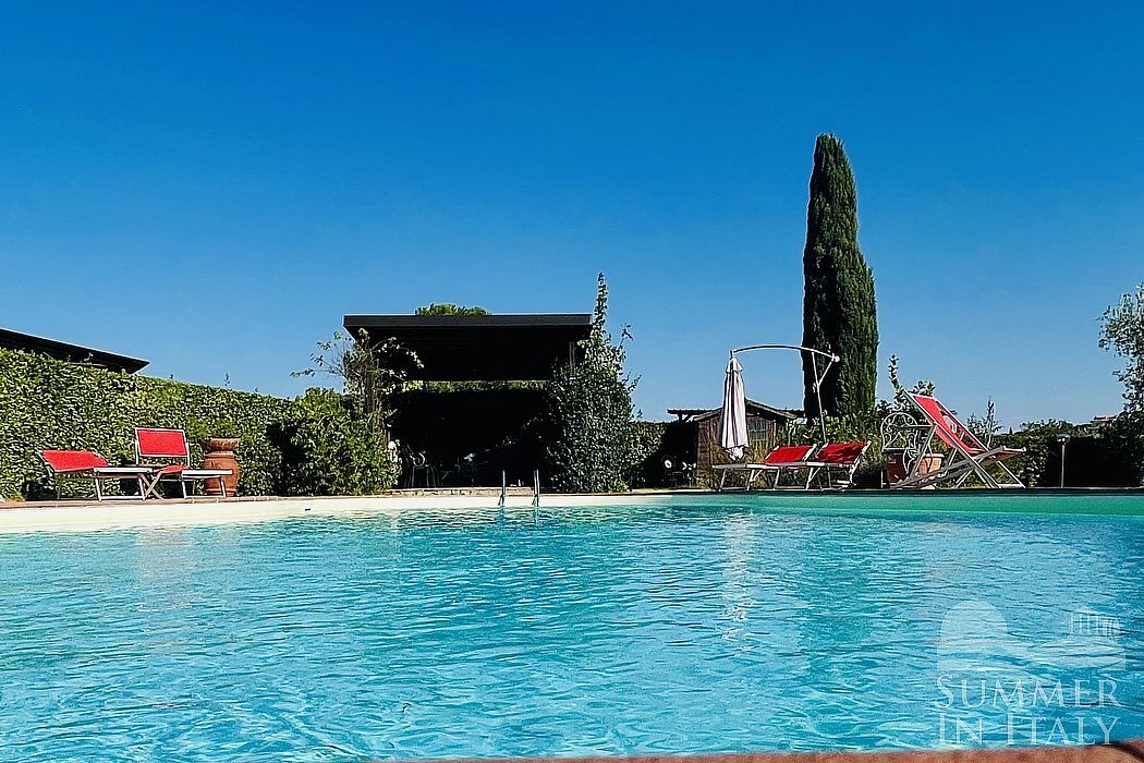 The swimming pool is 7.5 meters (25 feet) large by 13 meters (42 feet) long, from 1.20 meter (4 feet) to 1.80 meters (6 feet) deep. The swimming pool has a sinuous shape. The area is equipped with a table, chairs, sun umbrellas, deck chairs, sun loungers, a gazebo and an external shower. From the swimming pool you will enjoy a nice view of the greenery. The pool is open from the beginning of April until the end of October.