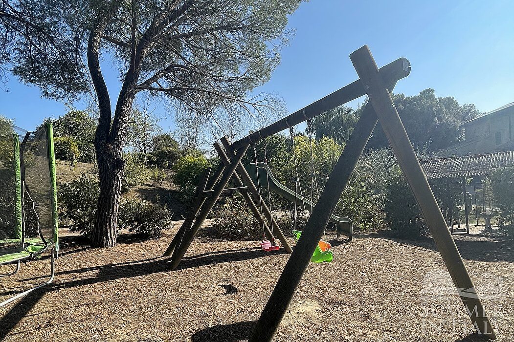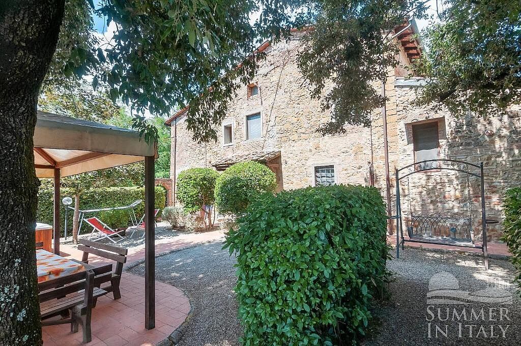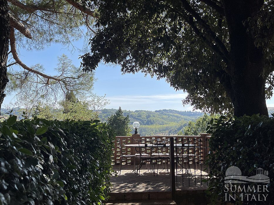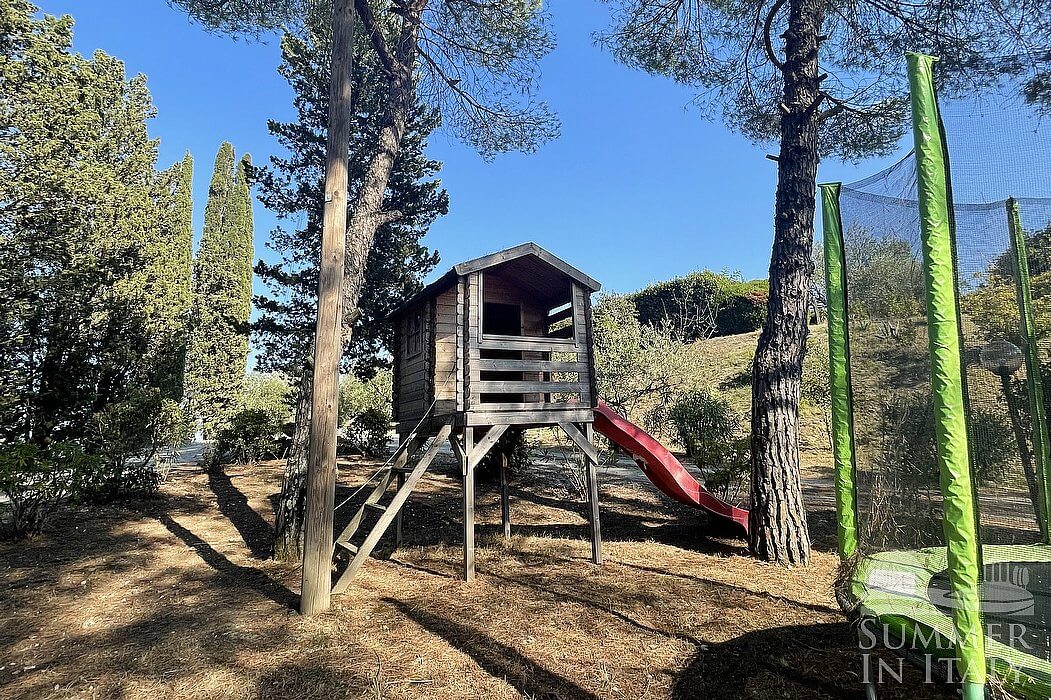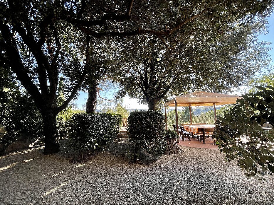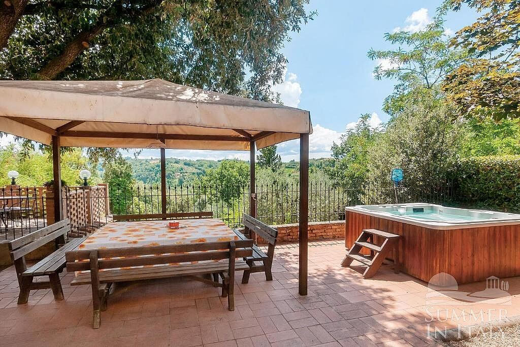 The second patio is 180 square meters (1940 square feet) large. It features an above-ground jacuzzi pool with six seats. It is partly shaded by tall trees. It is equipped with wood benches and with tables, chairs, two deck chairs, a gazebo and a swing. Here you will also find a brickwork barbecue. From the patio you will enjoy a characteristic view of the greenery and of the hills.
